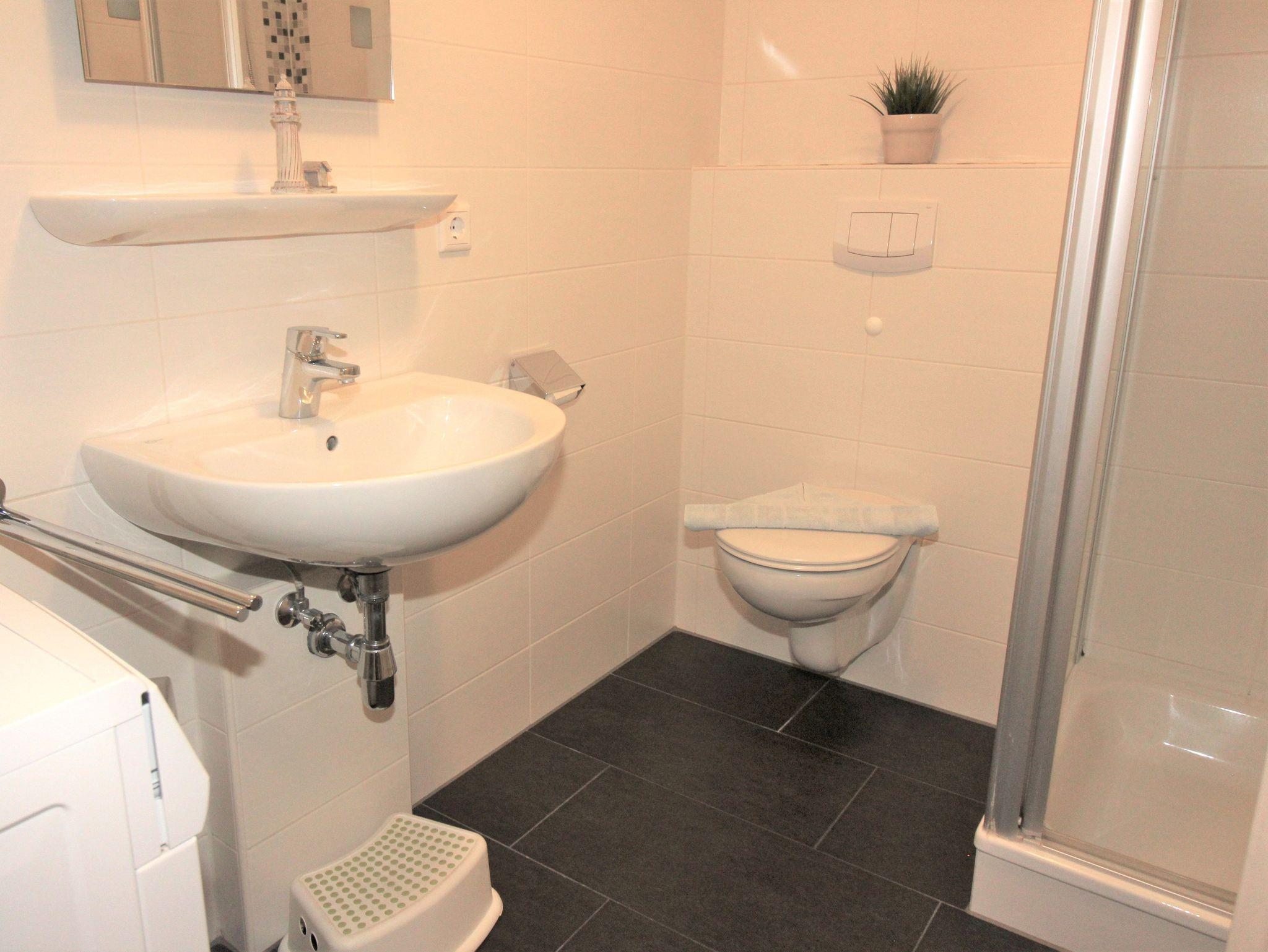 Im hochwertig ausgestatteten Bad mit Glasduschkabine, Handtuchheizkörper, Fußbodenerwärmung und Föhn steht auch ein Waschtrockner.