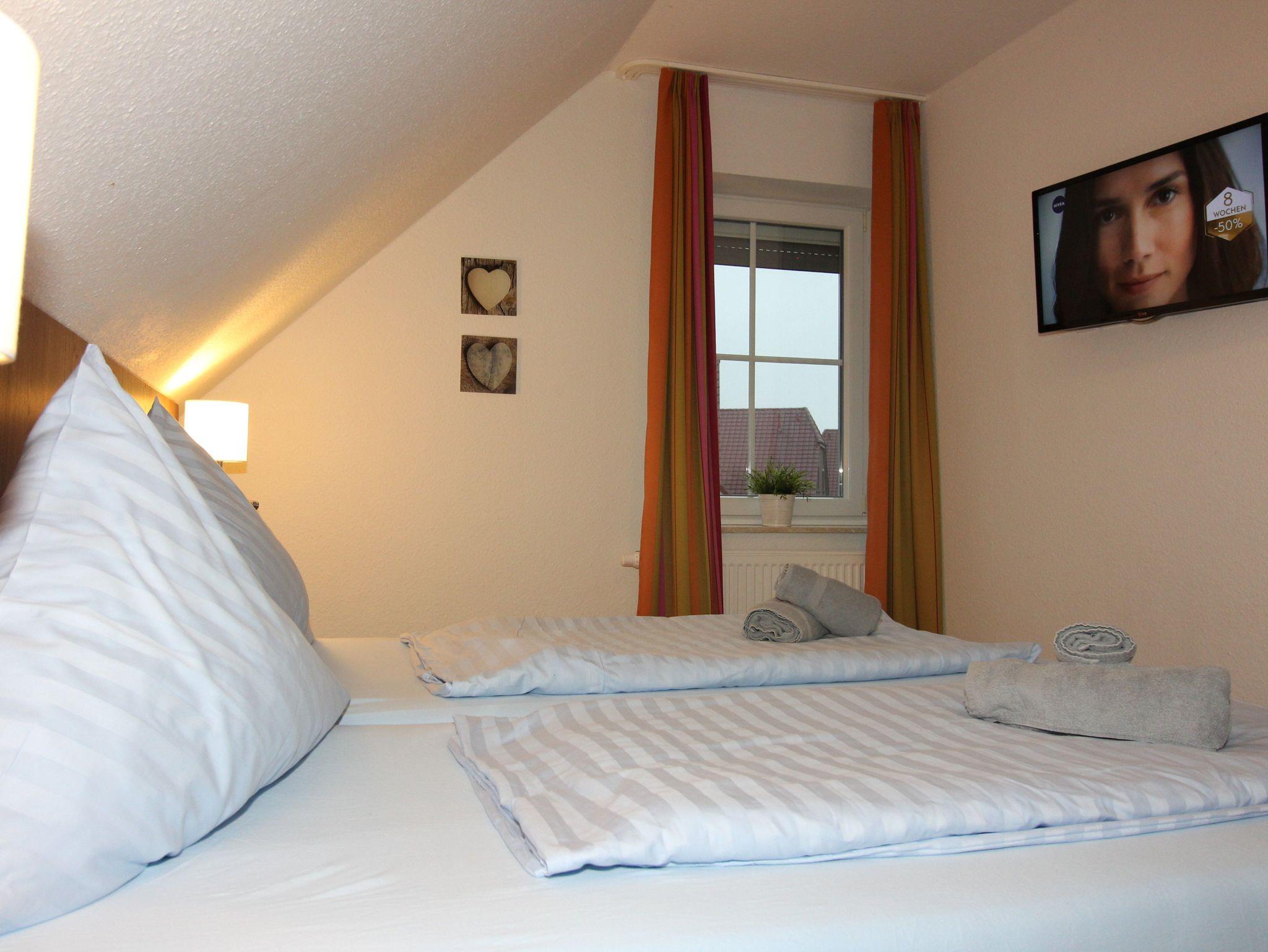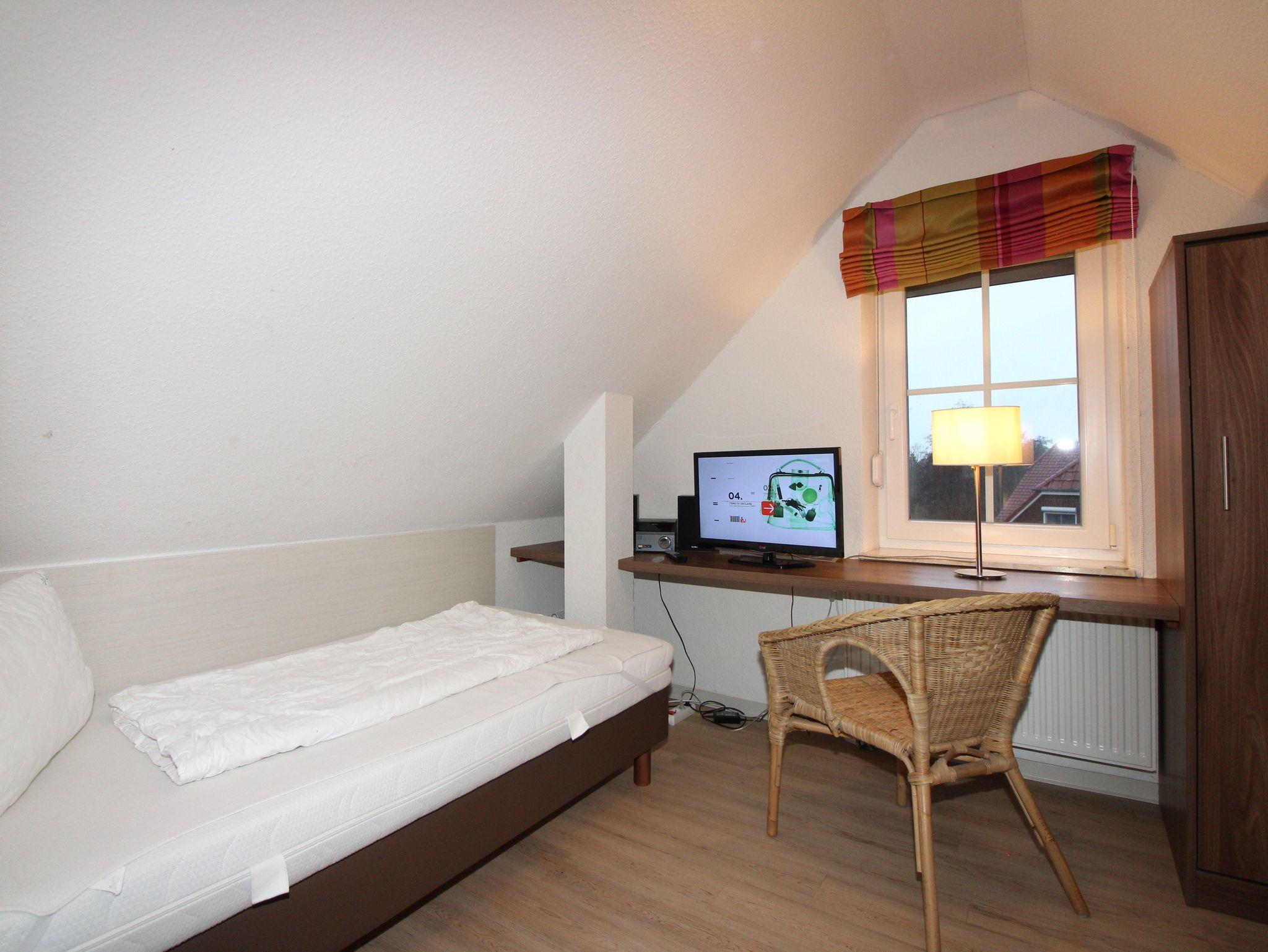 Im Dachgeschoss befindet sich ein weiterer Schlafraum mit zwei getrennten Boxspringbetten, einem Kleiderschrank, einem 26“ LED-Flachbildfernseher und einem Radiowecker.