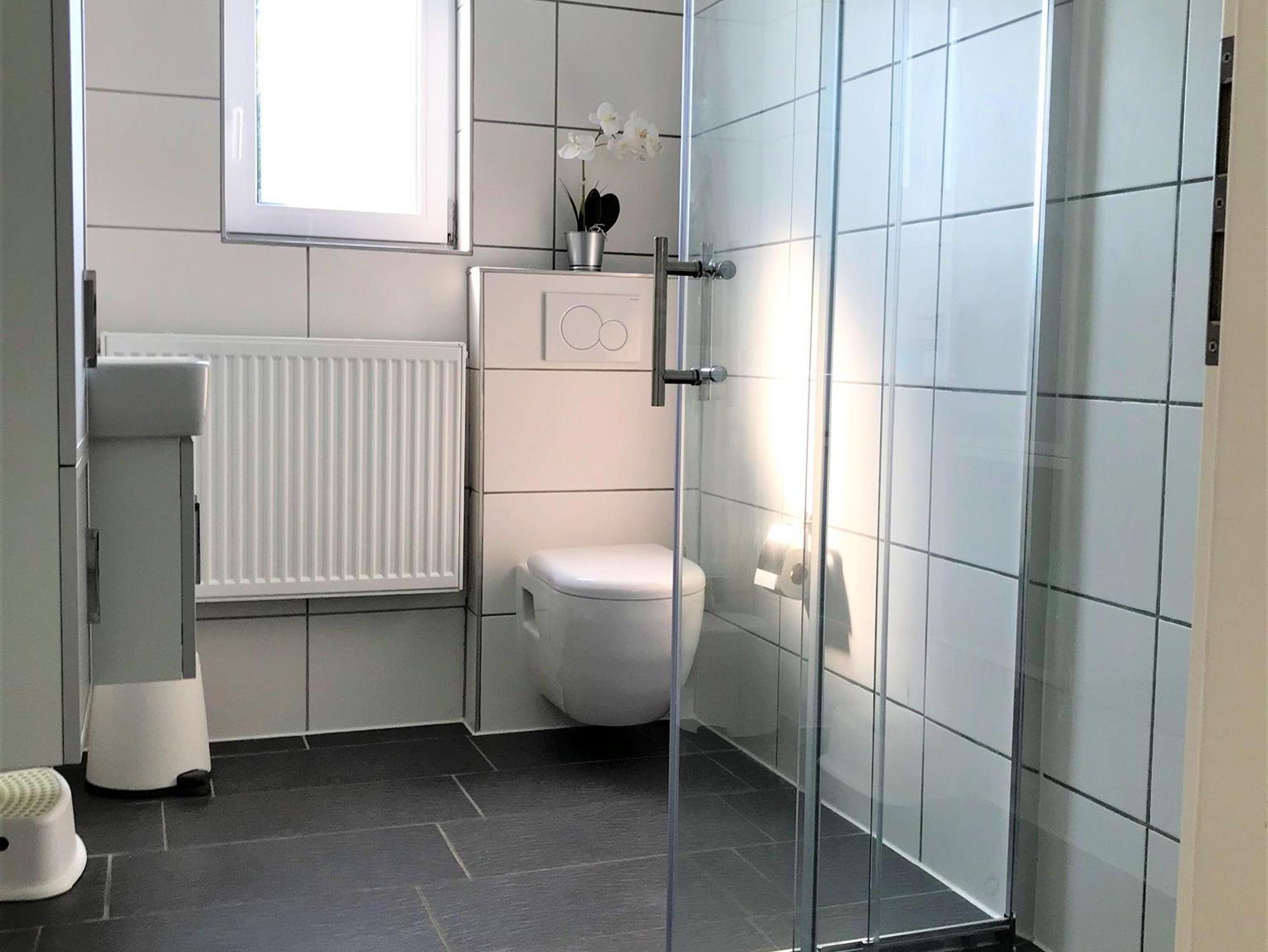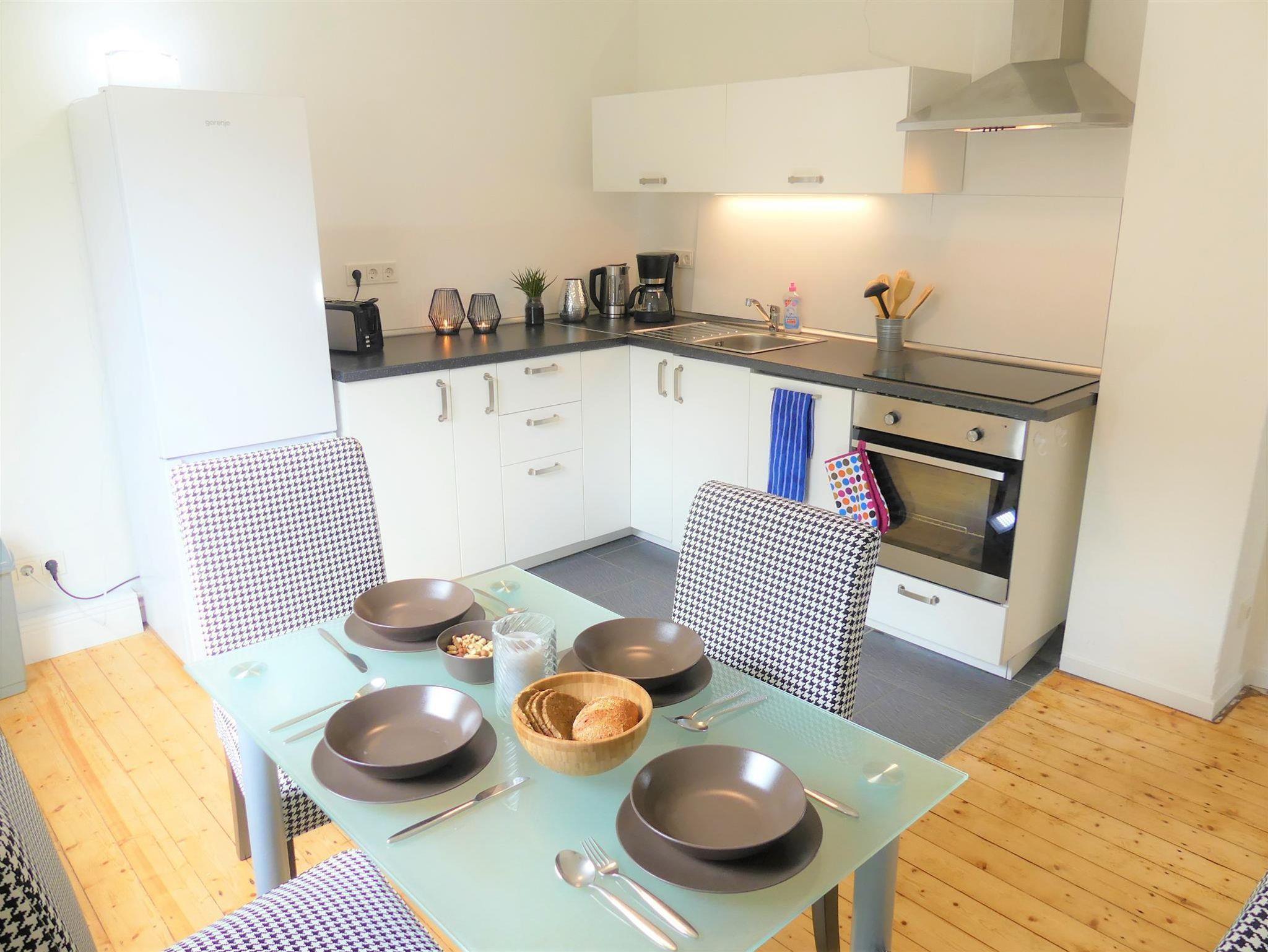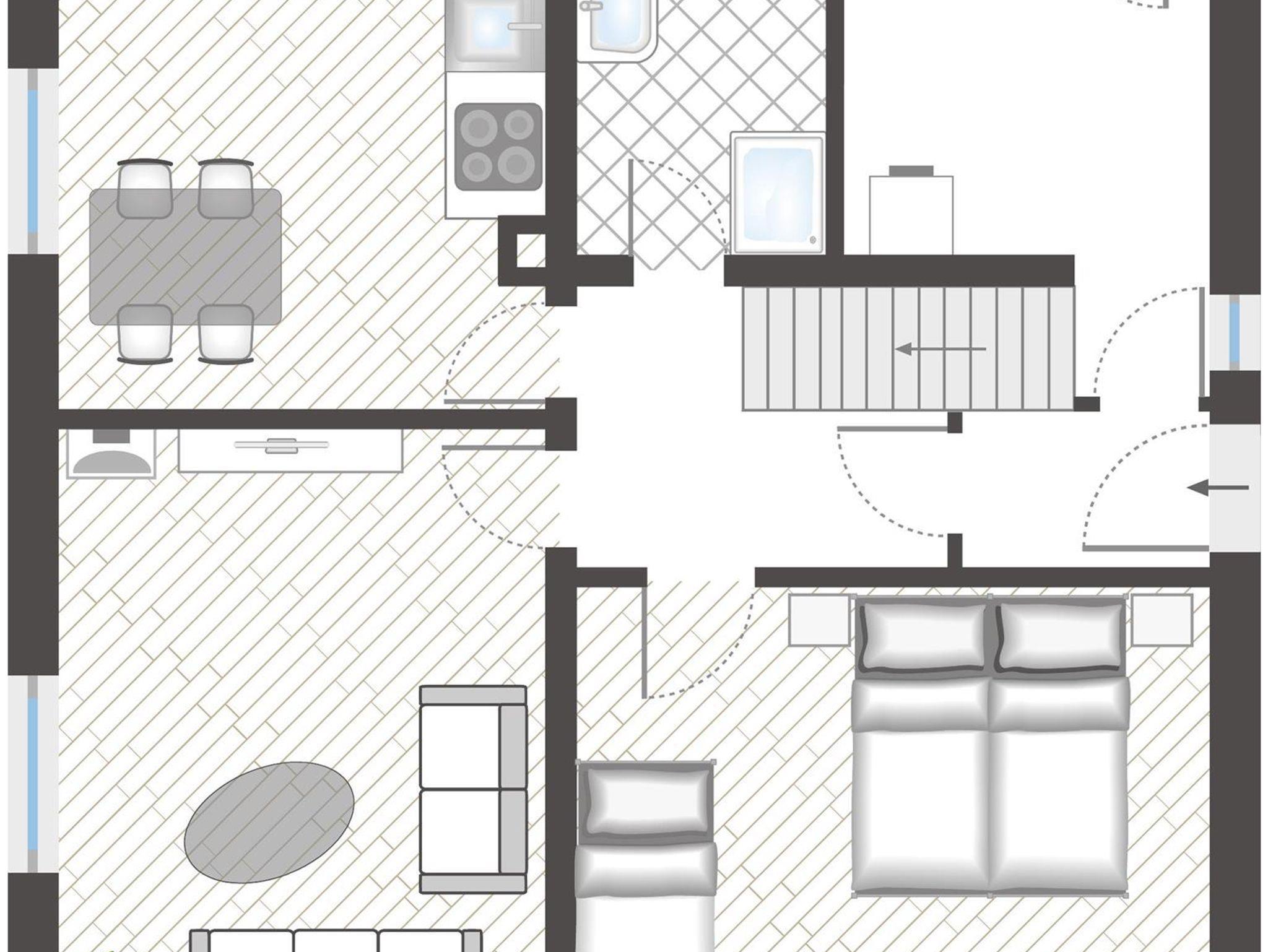 Die Erdgeschosswohnung besteht aus einem Wohnzimmer, einem Schlafzimmer, einer Küche und einem Bad. Das Wohnzimmer lädt auf einer gemütlichen modernen Sofaecke zum abendlichen Spielen und Filme gucken ein. Das Schlafzimmer verfügt über ein großes Doppelbett und ein Etagenbett für die lieben Kleinen. Die Küche hat alles was man braucht zum Kochen; eine Kühlgefrierkombination, Backofen, Spülmaschine, Wasserkocher, Filterkaffeemaschine und einen gemütlichen Esstisch. Einen Kinderstuhl stellen wir gerne auf Anfrage zur Verfügung.