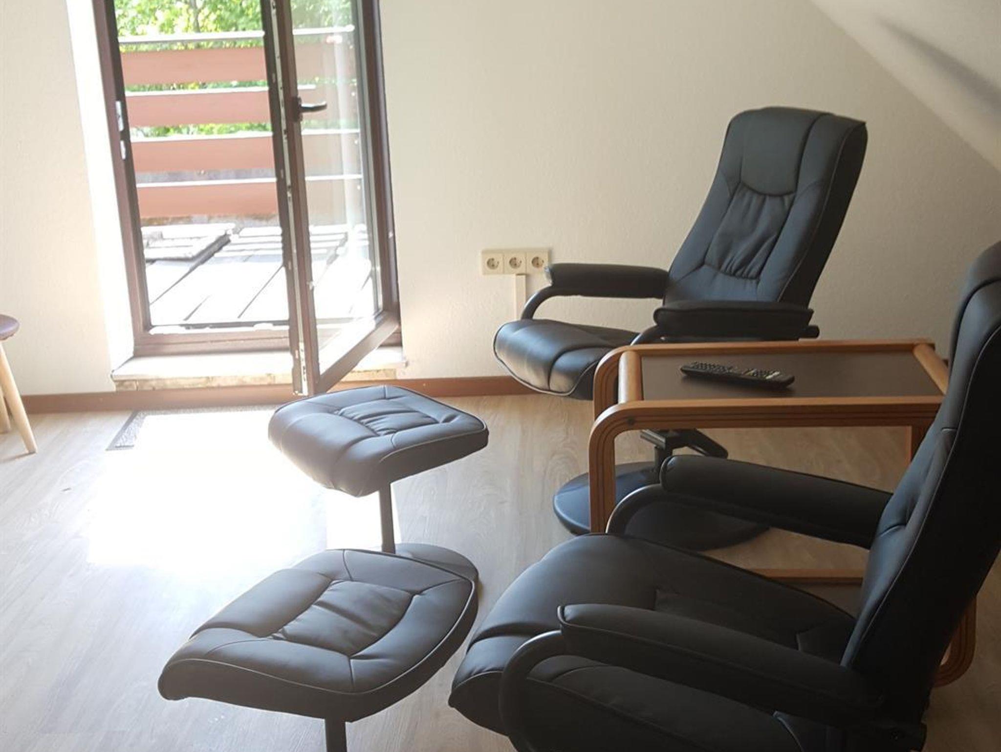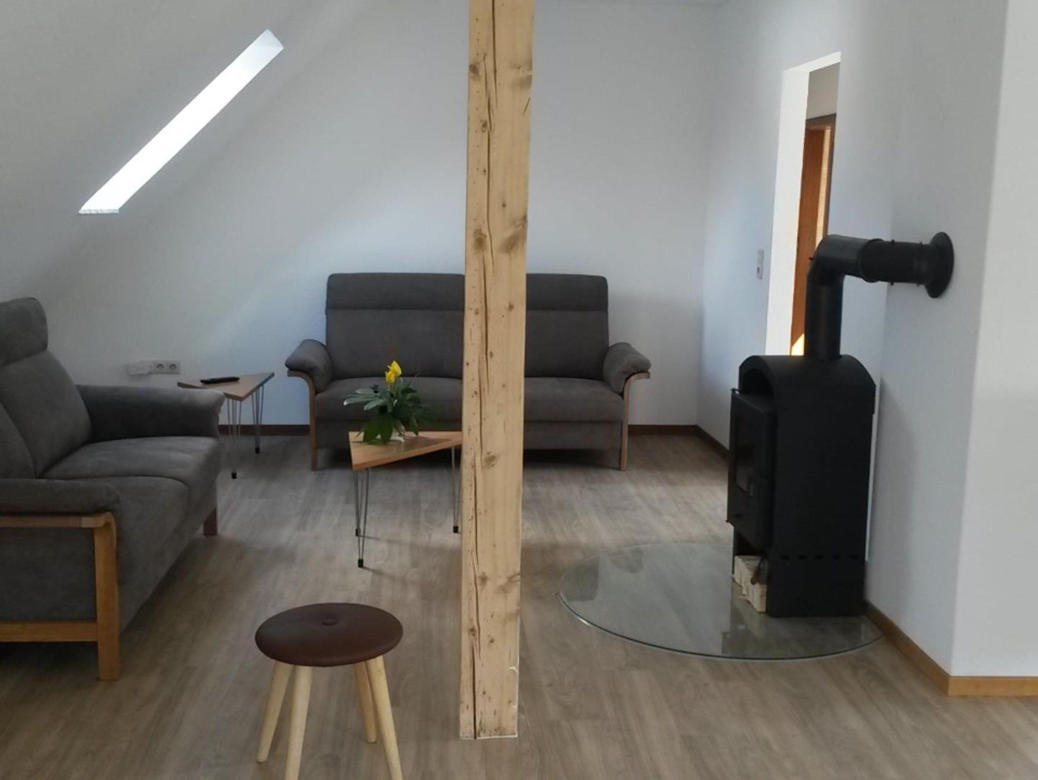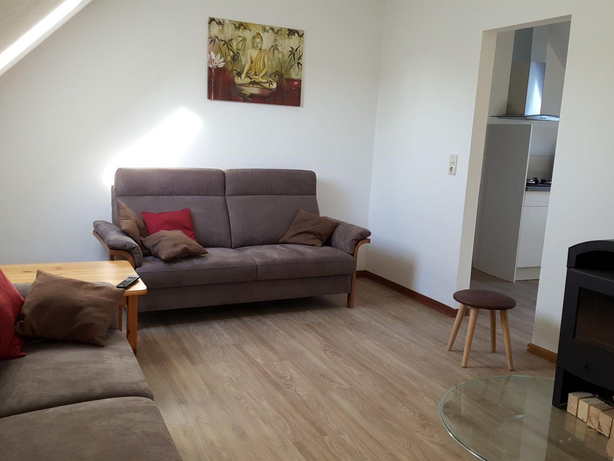 Im Obergeschoss befindet sich die große, neugestaltete Ferienwohnung 1 für bis zu 4 Personen. Sie besteht aus einer großen,hellen Wohnküche, einer gemütliche Wohnecke (Holz-Brennofen, großem Flachbild- TV mit Radio), einer Essecke, eine vollausgestattete Küchenzeile (Gasherd, Mikrowelle mit Heißluft-, Back- und Grillfunktion, Kühlschrank, Geschirrspüler, Kaffeemaschine, Toaster und Wasserkocher) und einem direktem Zugang auf den Süd-Balkon. Zwei Schlafzimmer mit je einem Doppelbett. Ein Bad mit Dusche, WC und Waschtisch und ein separates WC rundet die Wohnung ab.