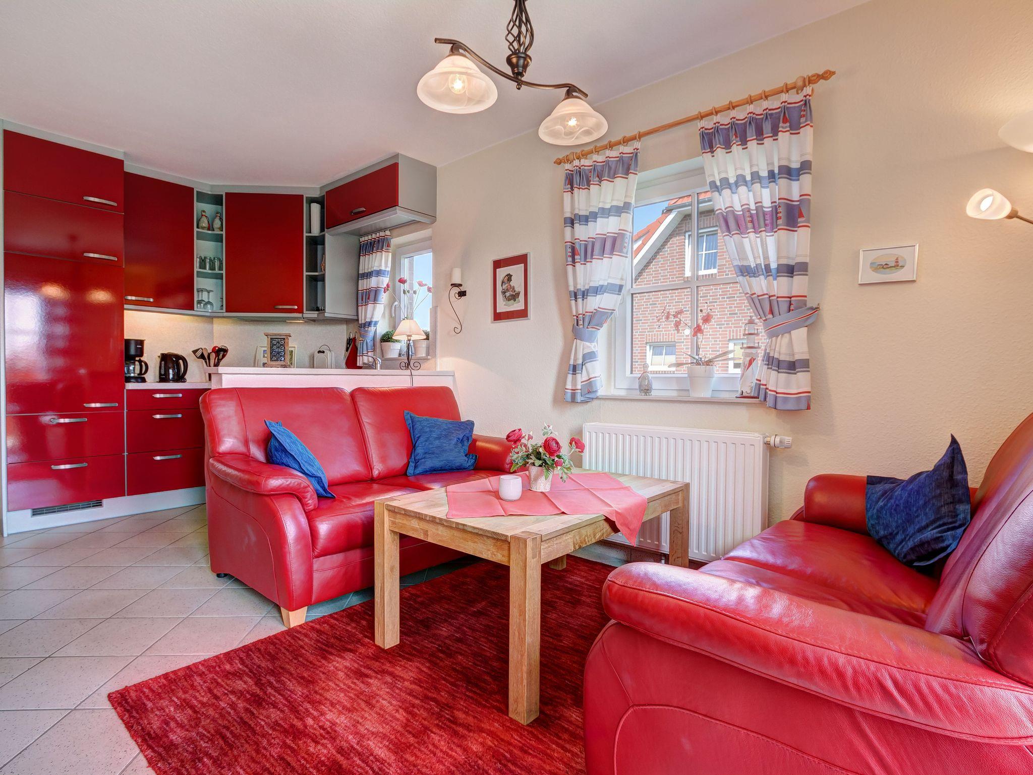 Die gemütliche Ferienwohnung der Kategorie Korsar liegt im neuen Teil des Ferienparks und erstreckt sich über das gesamte Obergeschoss eines Ferienhauses. Auf 50m² finden bis zu 4 Personen ausreichend Platz, um einen wundervollen Aufenthalt zu verbringen. Die Wohnung teilt sich auf in einen großzügigen Wohnraum mit einer offenen, vollständig ausgestatteten Küche, einem Esstisch, komfortablen Sitzmöglichkeiten und einem Flat-TV. Von hier können Sie auf Ihren eigenen Balkon treten und das herrliche Nordseewetter genießen.