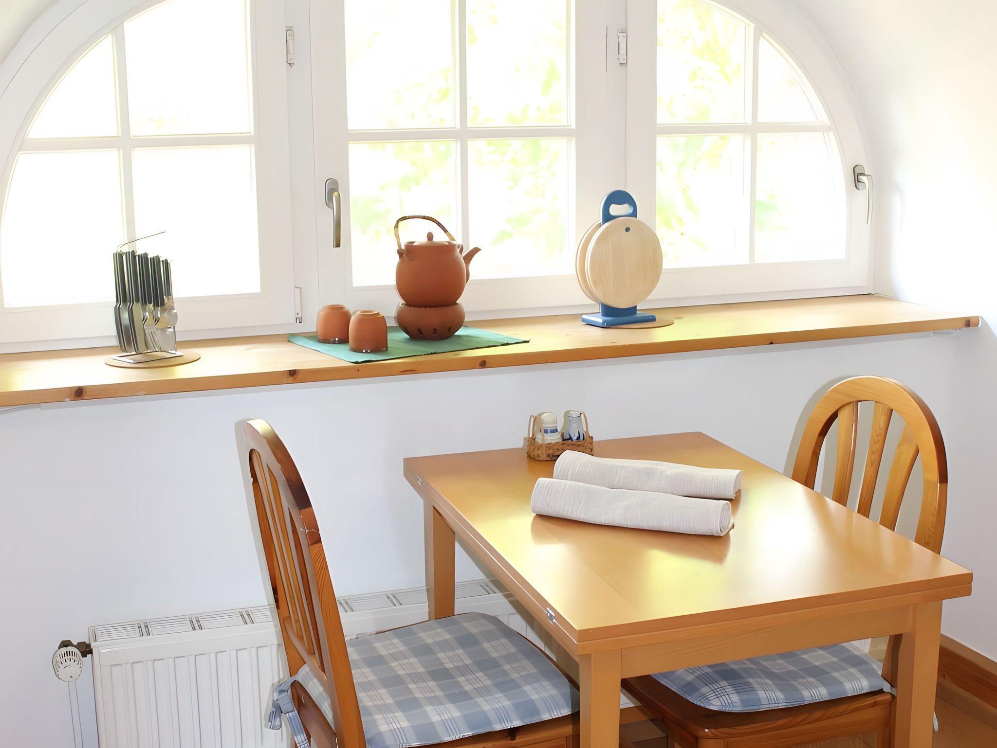 Das kombinierte Wohn-/Esszimmer verfügt über eine gemütlich Sitzecke mit Sofa, Sessel, Flat(Sat)-TV und Radio sowie einen kleinen Esstisch für 2 Personen. Die kleine Küche ist mit Ceranfeld, Backofen, Mikrowelle, Kühlschrank, Wasserkocher, Eierkocher und Toaster ausgestattet (keine Spülmaschine!).