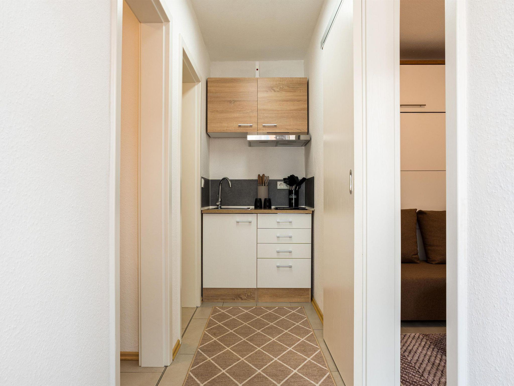 Die kleine, aber gut ausgestattete Küchenzeile verfügt über alles, was Sie zur Zubereitung Ihrer Mahlzeiten benötigen. Mit modernen Geräten und ausreichend Stauraum ist sie perfekt auf die Bedürfnisse einer kompakten Ferienwohnung abgestimmt.
