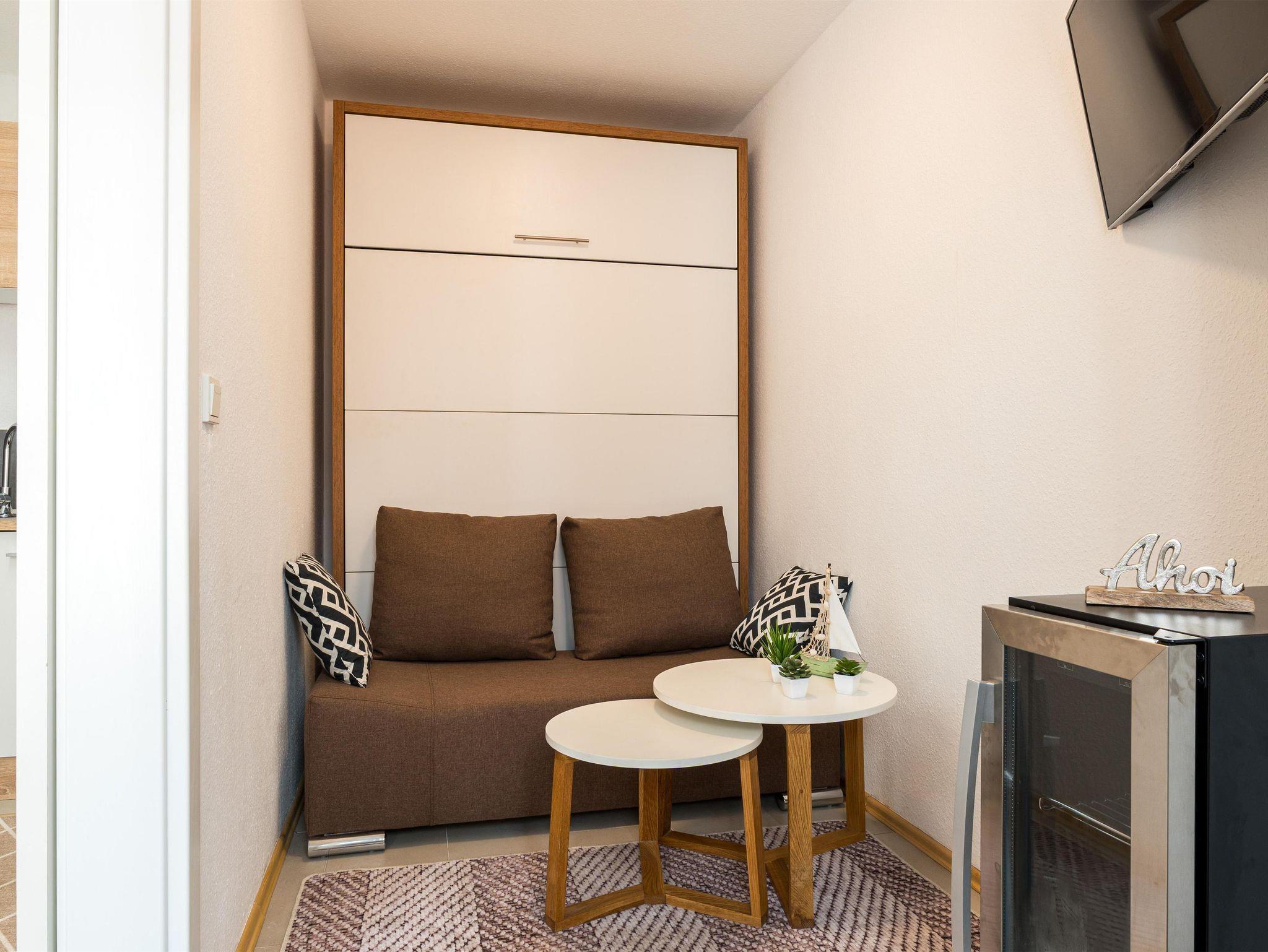 Diese kompakte, aber clever gestaltete Wohnung nutzt jeden Quadratmeter optimal aus. Der Wohn- und Schlafbereich ist mit einem Schrankbett ausgestattet, das bei Bedarf einfach verstaut werden kann, um den Raum flexibel zu nutzen. Ein TV im Schlafzimmer sorgt für gemütliche Unterhaltung. Das moderne Badezimmer verfügt über eine ebenerdige Dusche und ein WC. Der Essbereich mit ausklappbarem Tisch schafft bei Bedarf mehr Platz, während die kleine Küchenzeile alles bietet, was Sie zur Zubereitung Ihrer Mahlzeiten benötigen.
