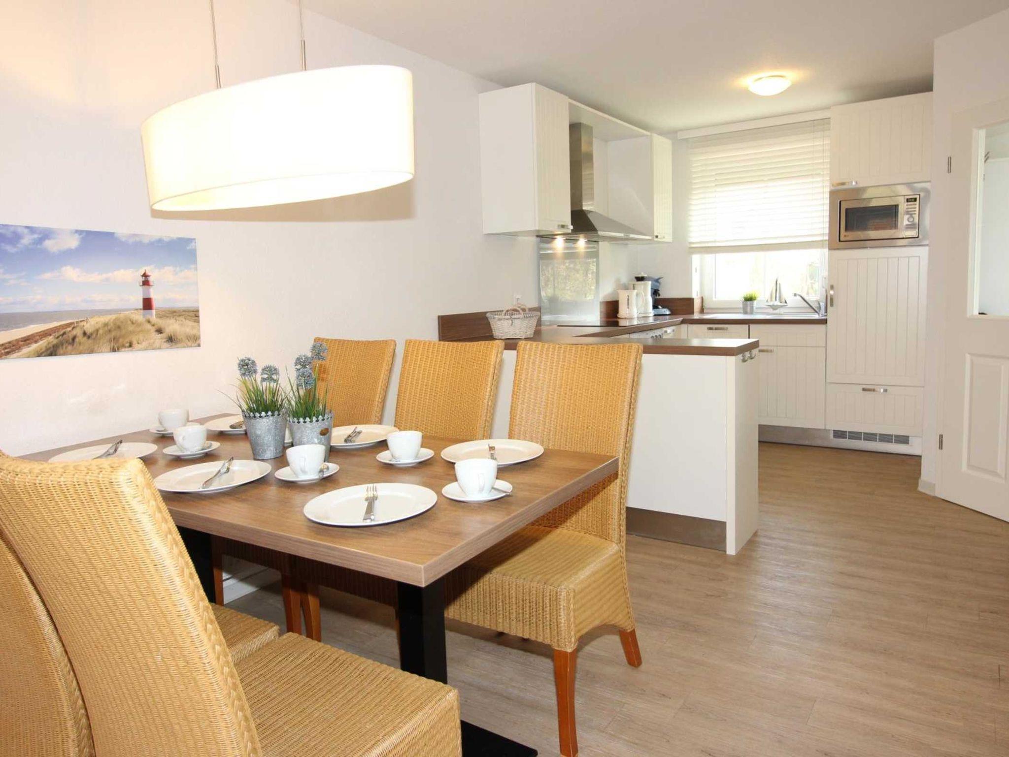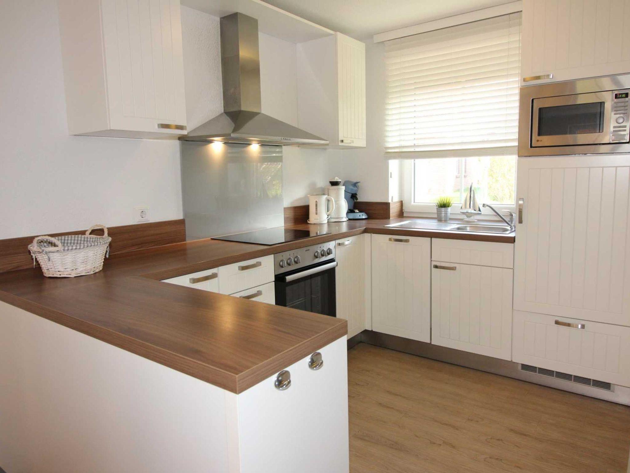 Im Erdgeschoss befinden sich ein Flur mit Garderobe, ein großer Wohn-/Essraum mit einem komplett ausgestatteten Küchenbereich sowie ein Abstellraum. Die Küche ist mit Backofen, Ceranfeld, Geschirrspüler, Kühlschrank mit Gefrierfach, Mikrowelle, Senseo Kaffeemaschine und vielem mehr ausgestattet.