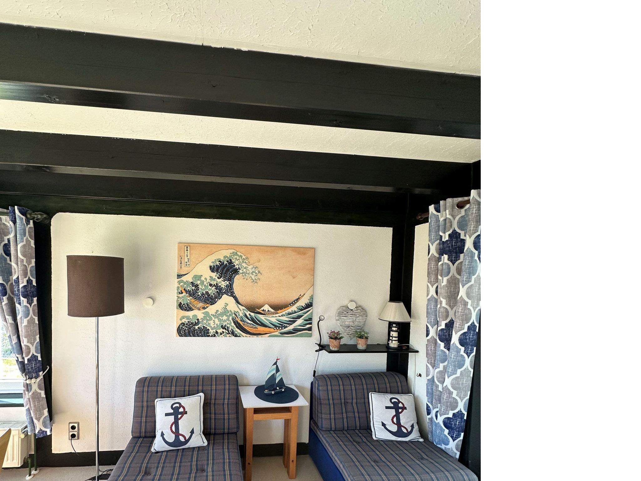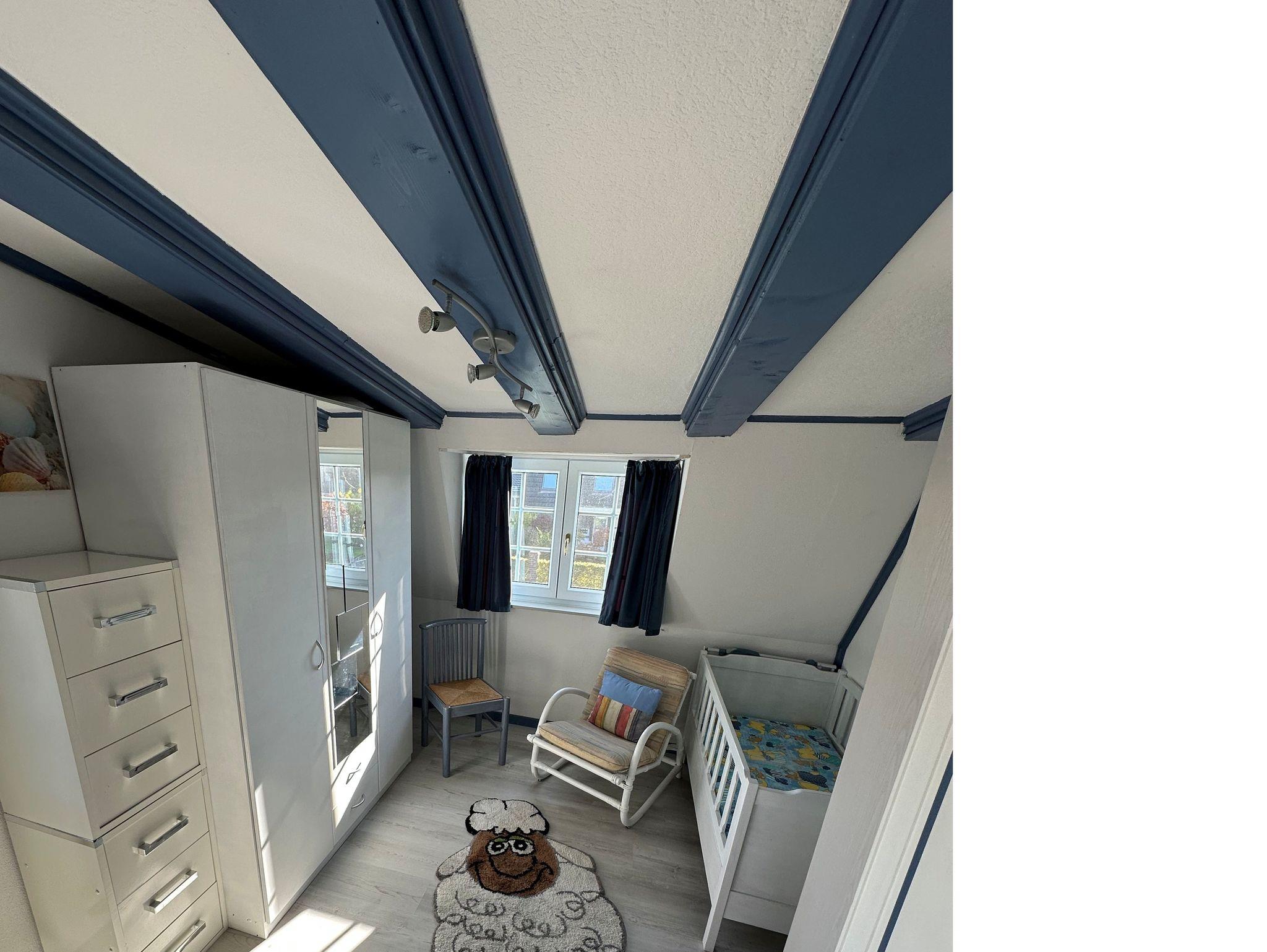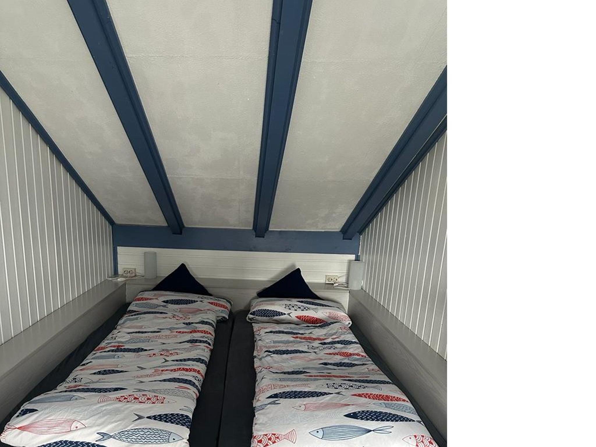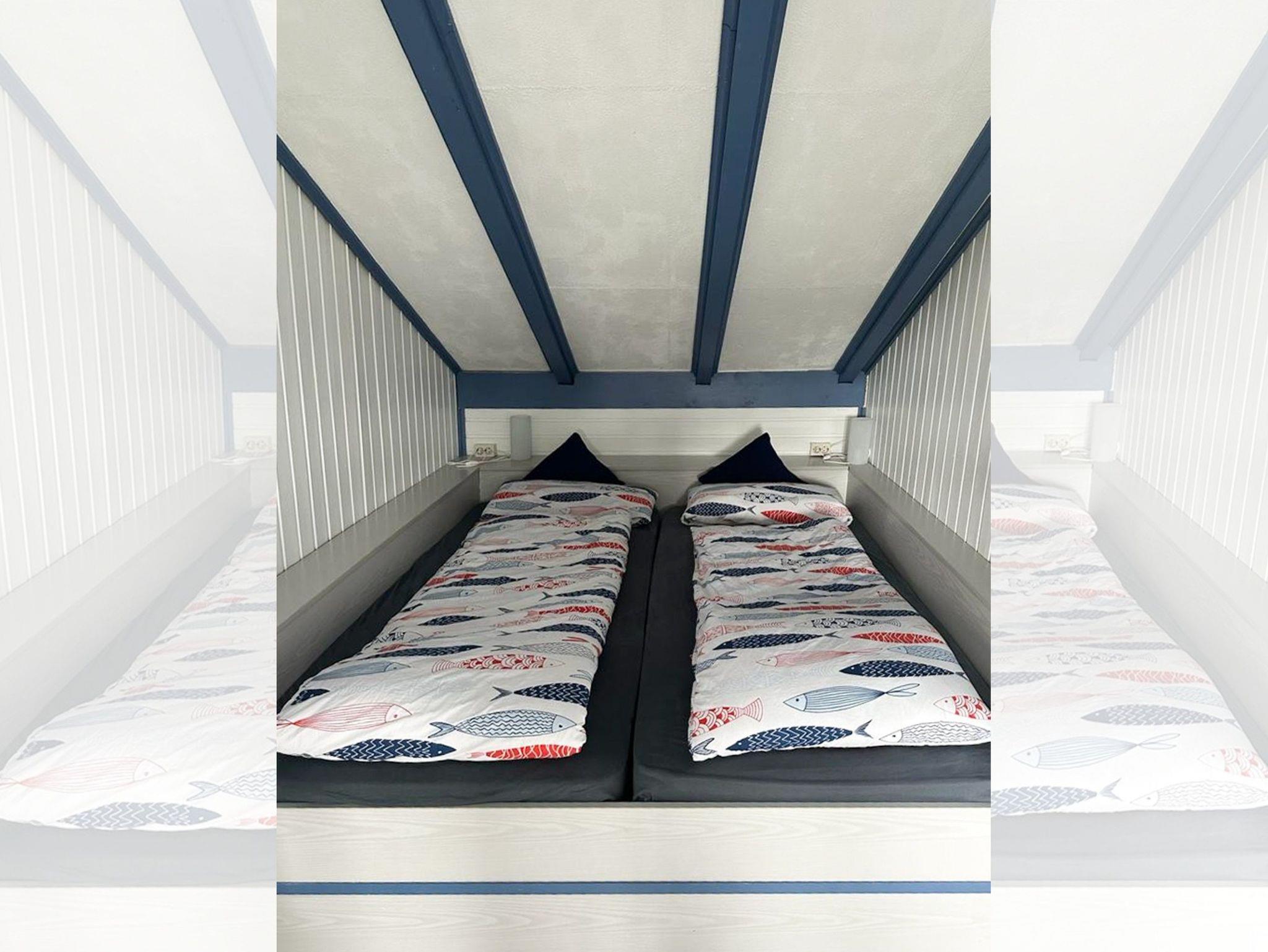 Im Obergeschoss liegen zwei separate Schlafzimmer, die flexible Schlafmöglichkeiten bieten: Eines ist mit einem Doppelbett und einem zusätzlichen Kinderbett ausgestattet, das zweite verfügt ebenfalls über ein Doppelbett sowie einen Smart-TV für gemütliche Filmabende. Beide Schlafzimmer sind mit Kojenbetten gestaltet, was für eine besonders behagliche und geschützte Schlafatmosphäre sorgt.