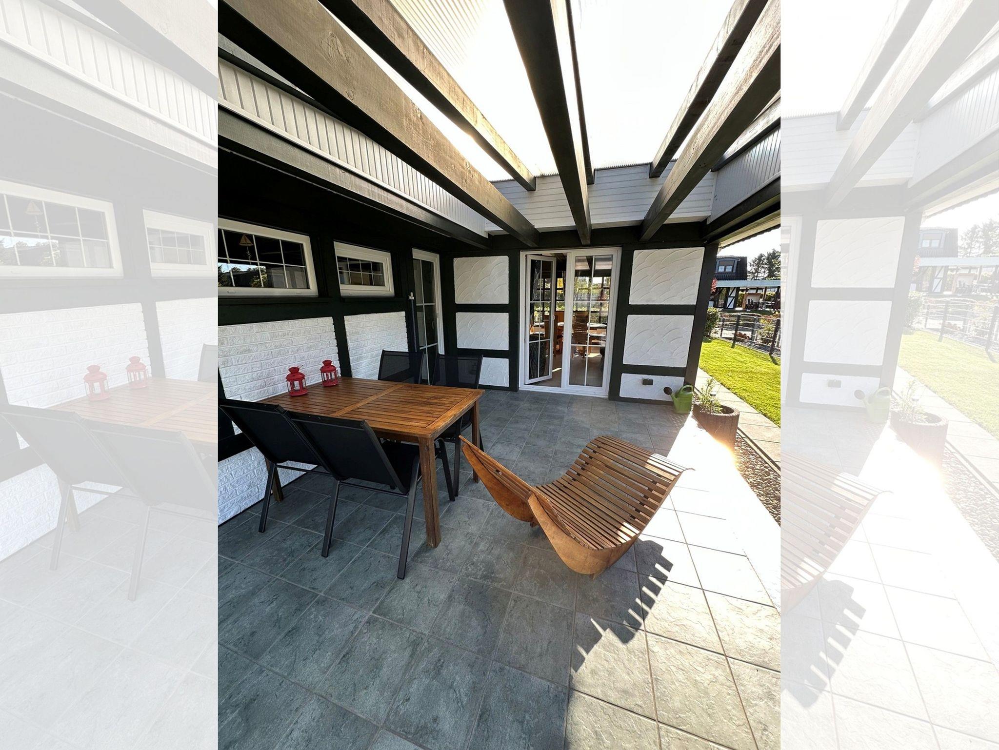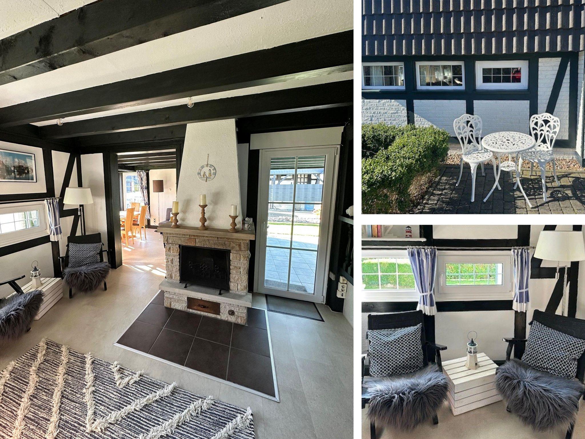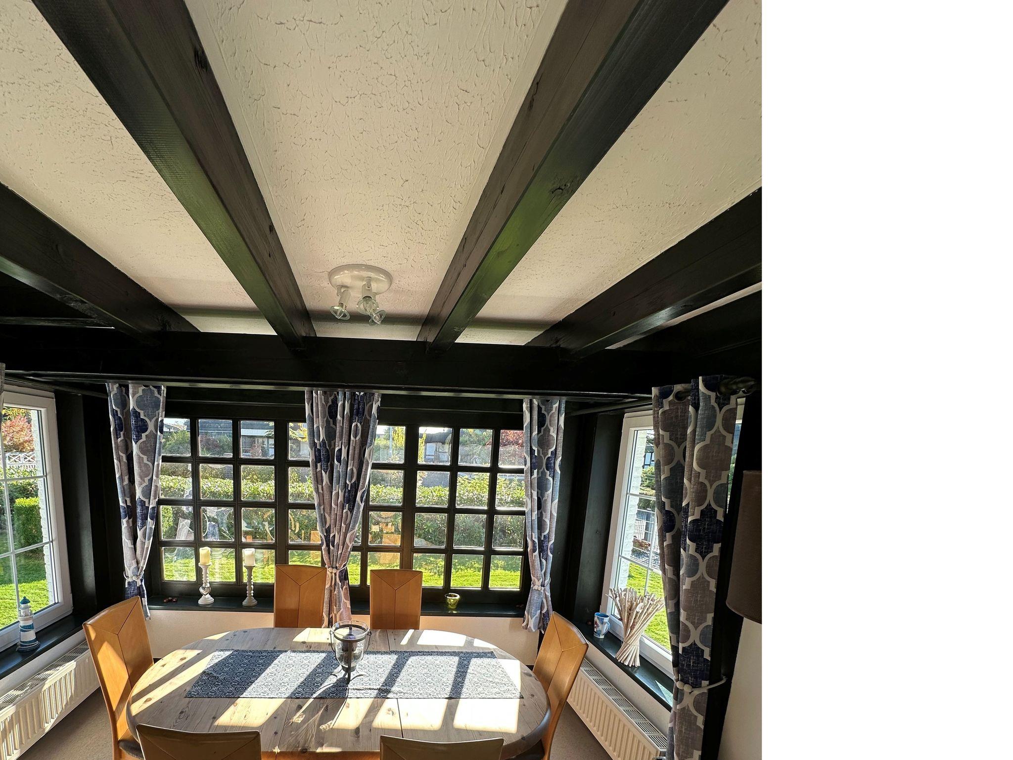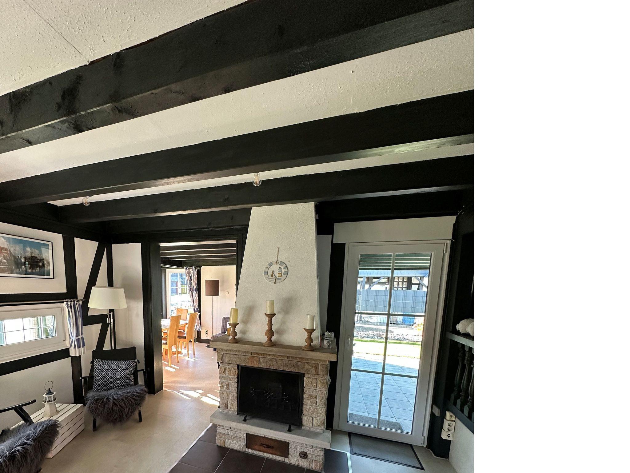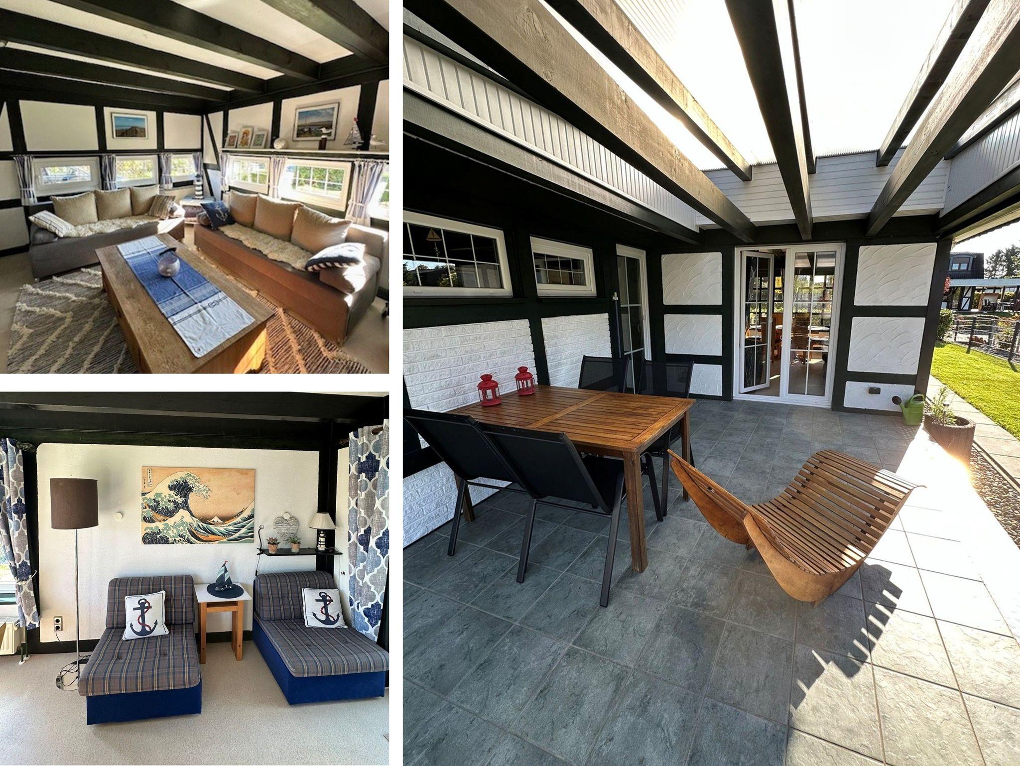 Im Erdgeschoss gelangen Sie vom Wohnbereich direkt in den Garten. Hier befinden sich die offene, voll ausgestattete Küche mit gemütlicher Essecke (u. a. Kaffeemaschine, Padmaschine, Toaster, Wasserkocher, Cerankochfeld, Backofen, Kühl-/Gefrierschrank, Kochutensilien, Geschirr und Besteck, kein Geschirrspüler) sowie das Badezimmer mit Dusche und Waschtisch. Der Wohnraum lädt mit seinem offenen Kamin und einem 55-Zoll-SAT-TV zu entspannten Abenden ein. Von hier und vom Anbau aus erreichen Sie die überdachte Terrasse mit Gartenmöbeln und den großen Garten mit Liegewiese. Im Anbau gibt es einen zusätzlichen Essbereich sowie zwei ausziehbare Schlafsessel, die bei Bedarf als Aufbettung für zwei weitere Personen genutzt werden können.