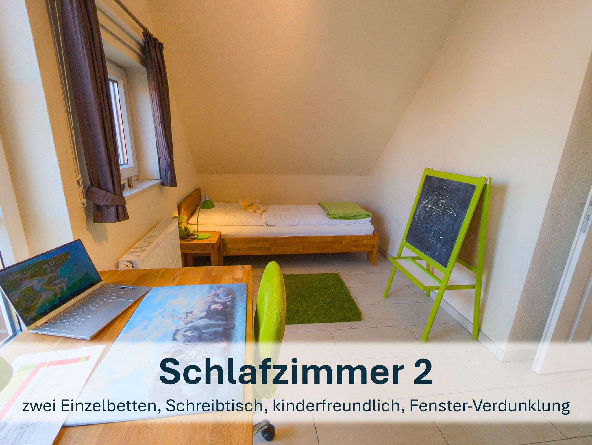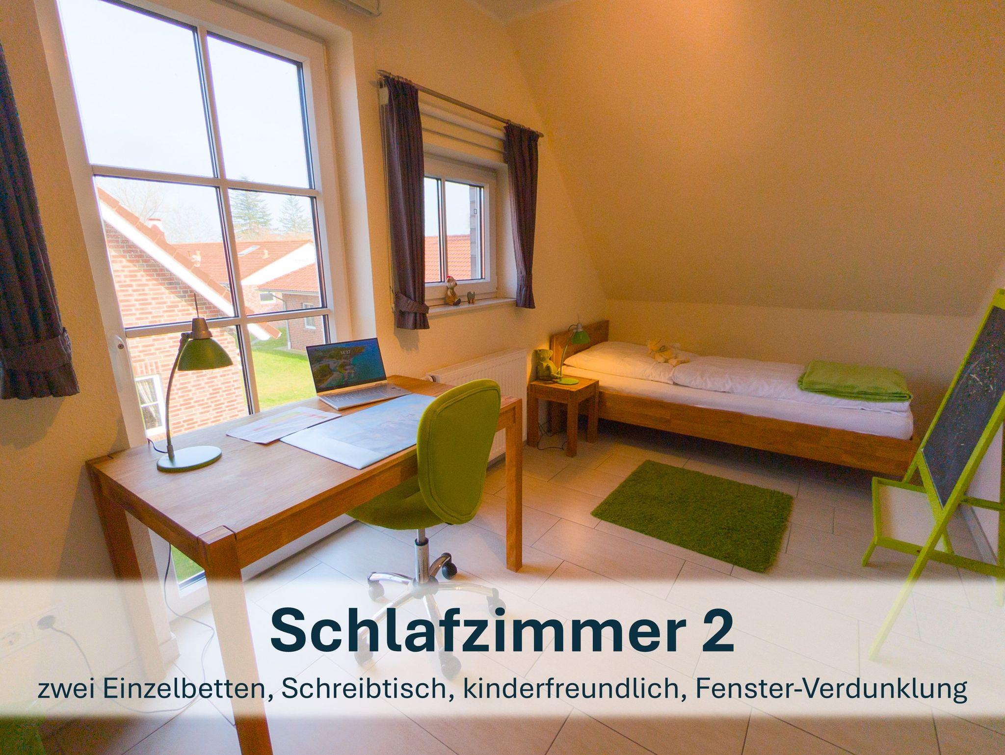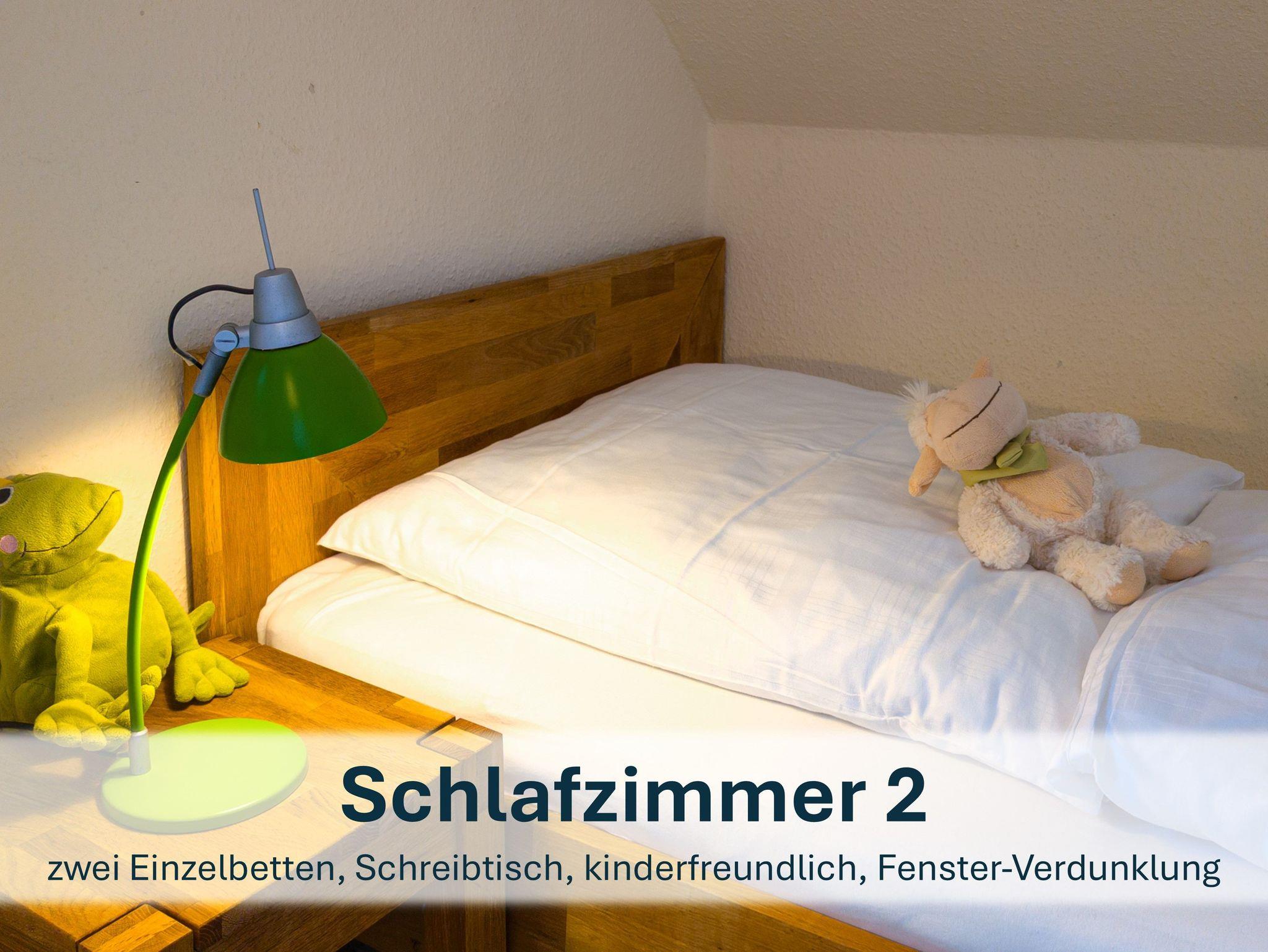 Über die Holztreppe im Flur gelnagen Sie in das Obergeschoss des Hauses.Hier befinden sich zwei weitere Schlafzimmer: ein Kinderzimmer mit zwei Einzelbetten und einem kleinen Schreibtisch, sowie ein Schlafzimmer mit Doppelbett und einer Kommode.