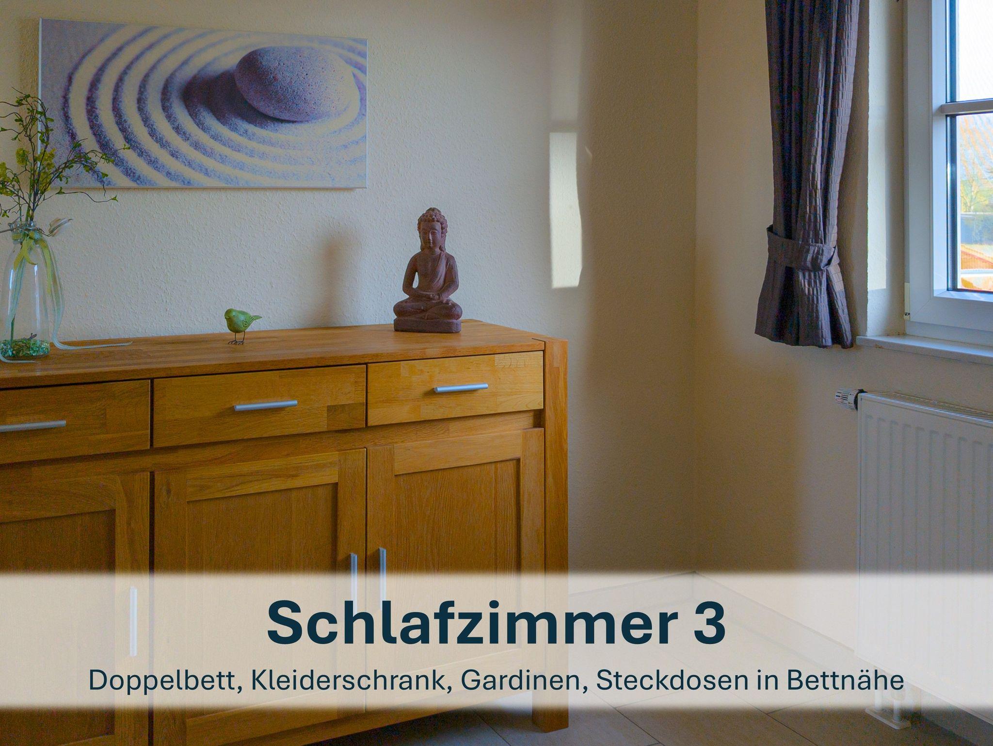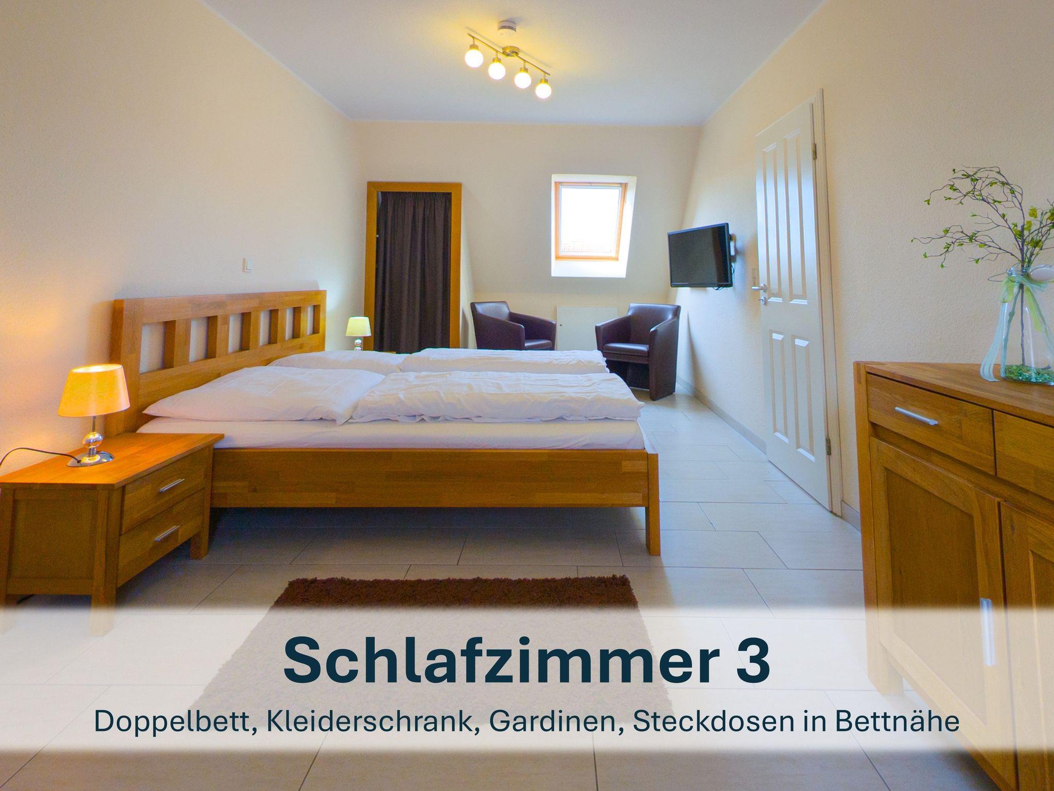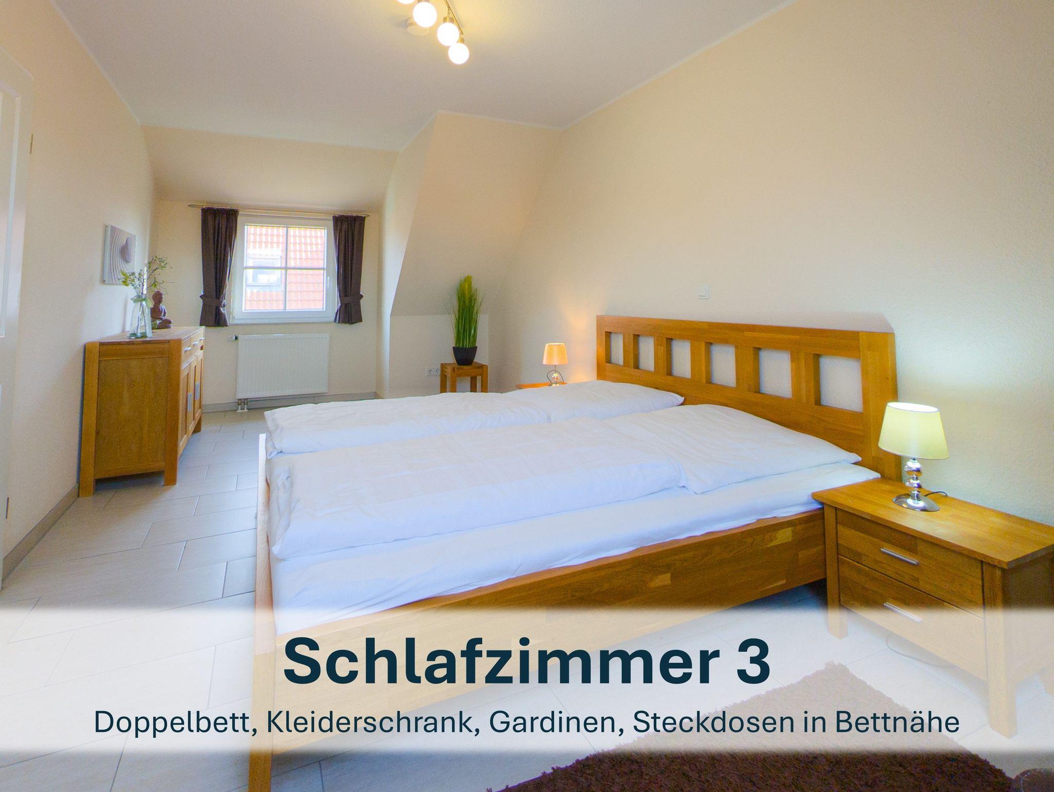 Über die Holztreppe im Flur gelnagen Sie in das Obergeschoss des Hauses.Hier befinden sich zwei weitere Schlafzimmer: ein Kinderzimmer mit zwei Einzelbetten und einem kleinen Schreibtisch, sowie ein Schlafzimmer mit Doppelbett und einer Kommode.
