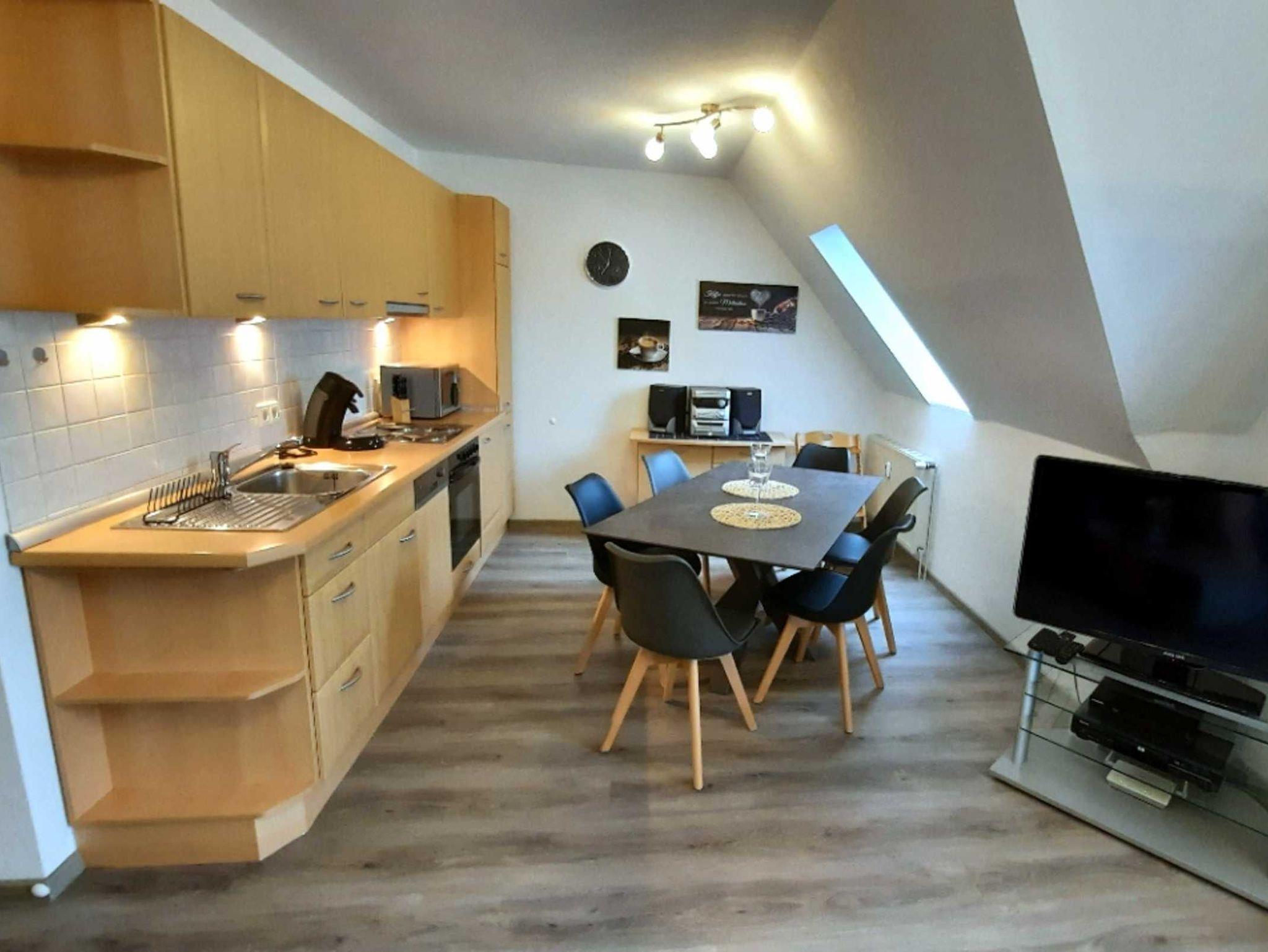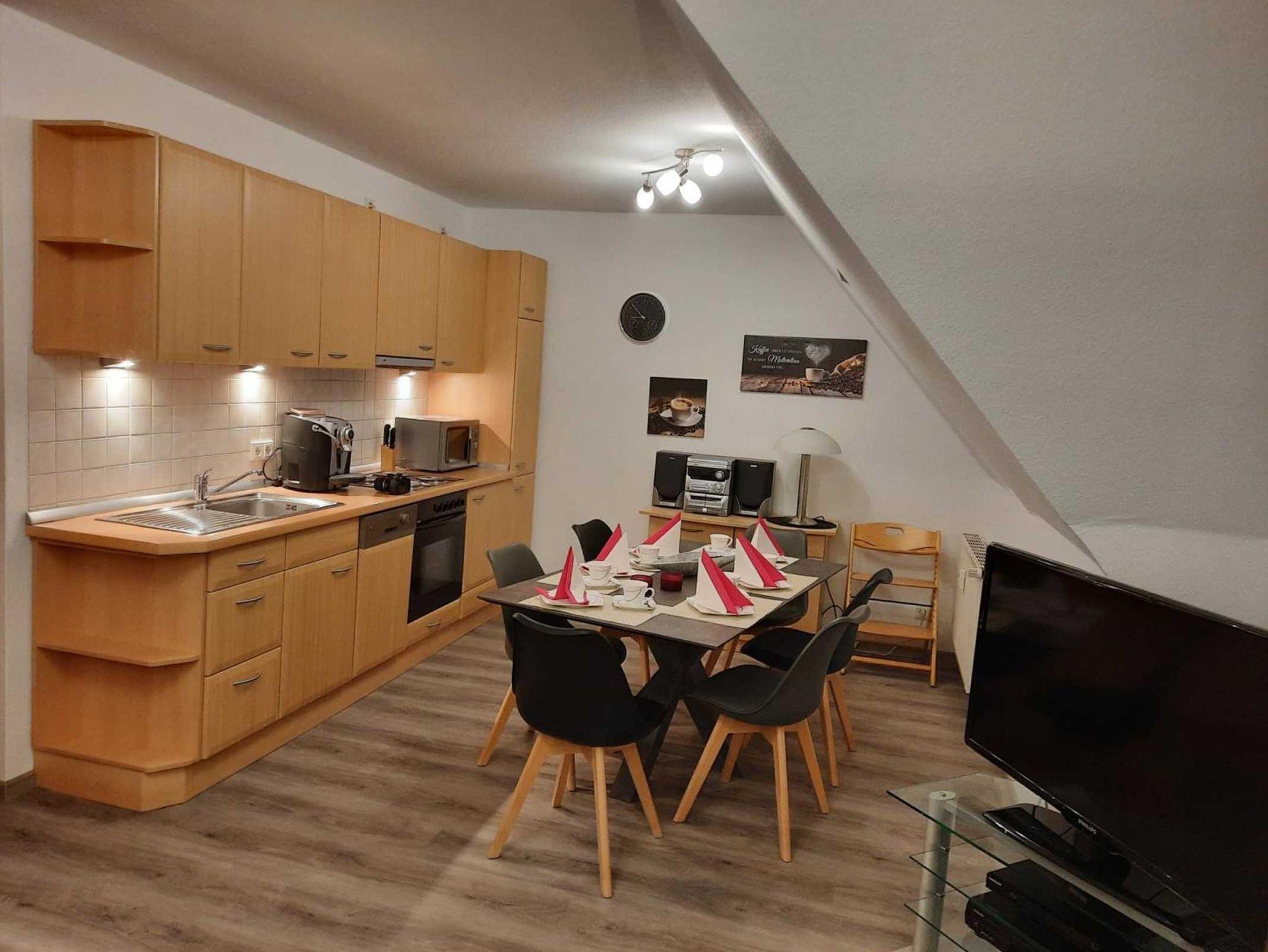 Die vollausgestattete Küche bietet einen Kühlschrank, Gefrierfach, Mikrowelle, Wasserkocher, Backofen, Spülmaschine, sowie eine Kaffeemaschine für Filterkaffee. Der gemütliche Essbereich bietet genügend Platz für gemeinsame Mahlzeiten.