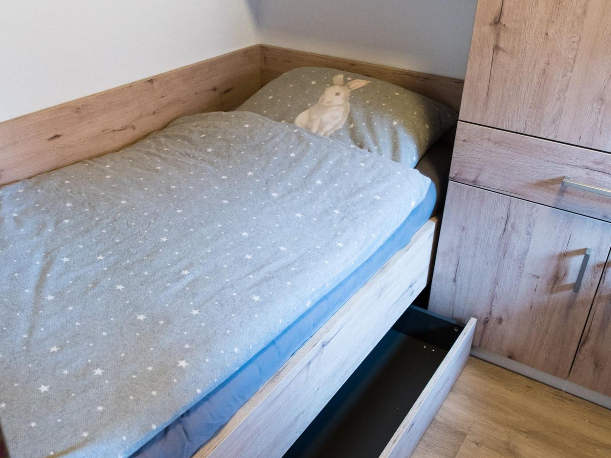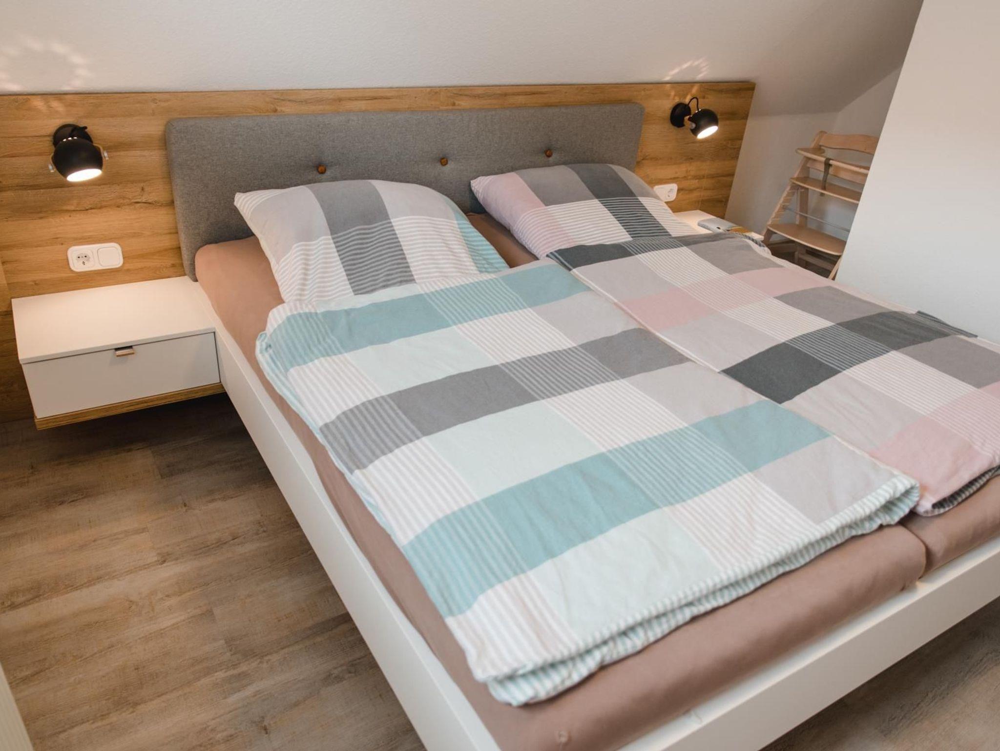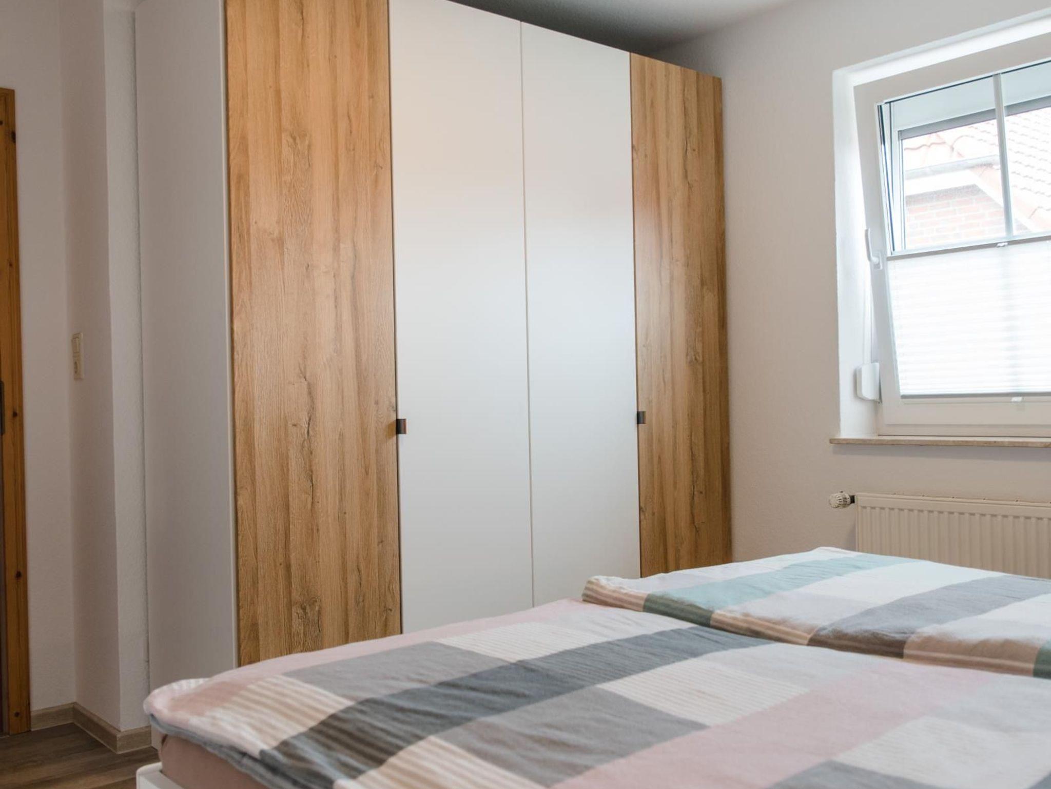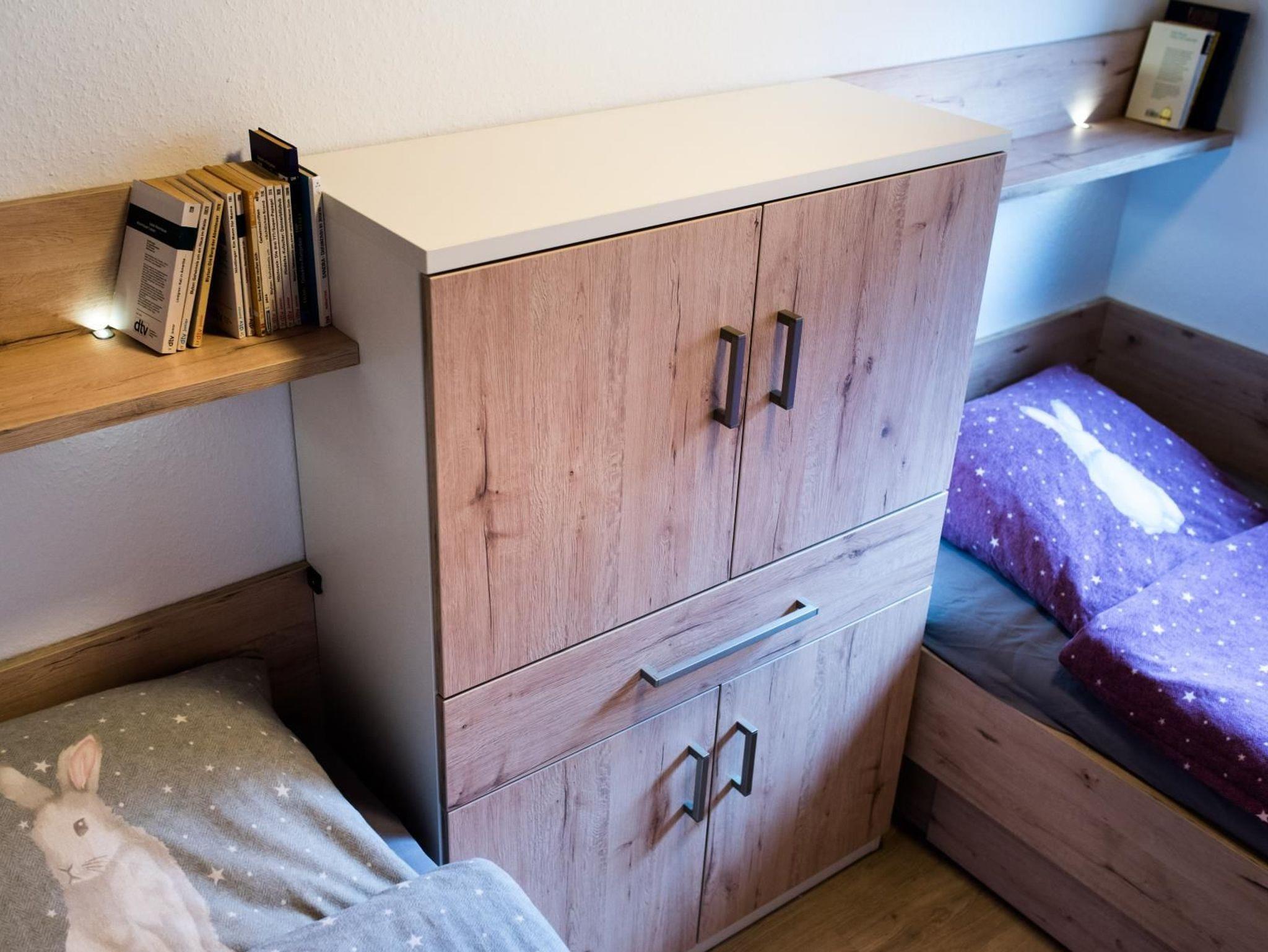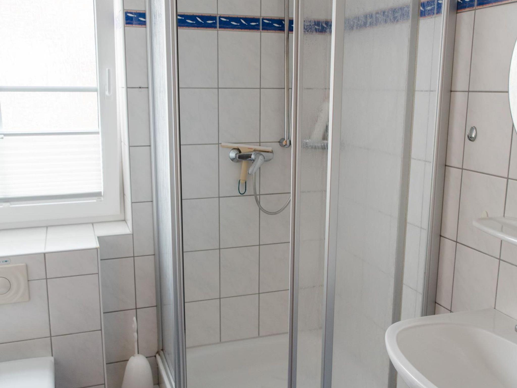 Im Obergeschoss gibt es zwei Schlafräume, einen mit Doppelbett und einen mit zwei Einzelbetten, in dem ein weiterer Fernseher installiert ist. Ebenso befindet sich hier auch ein Duschbad mit WC.
