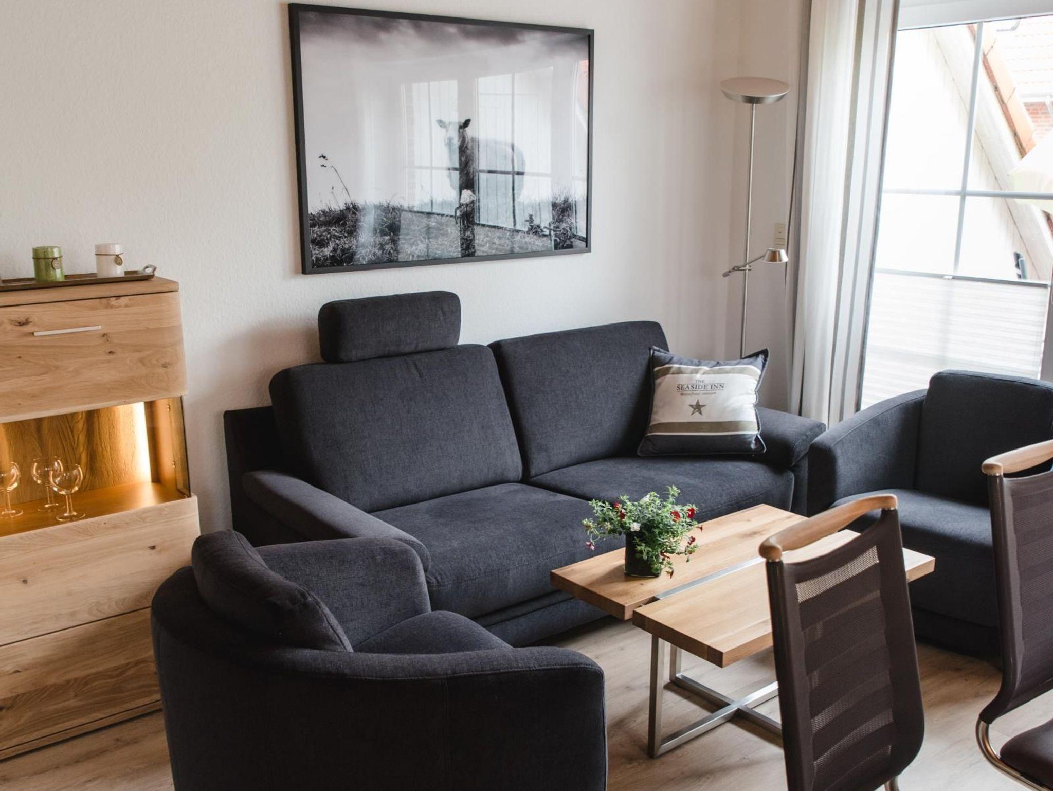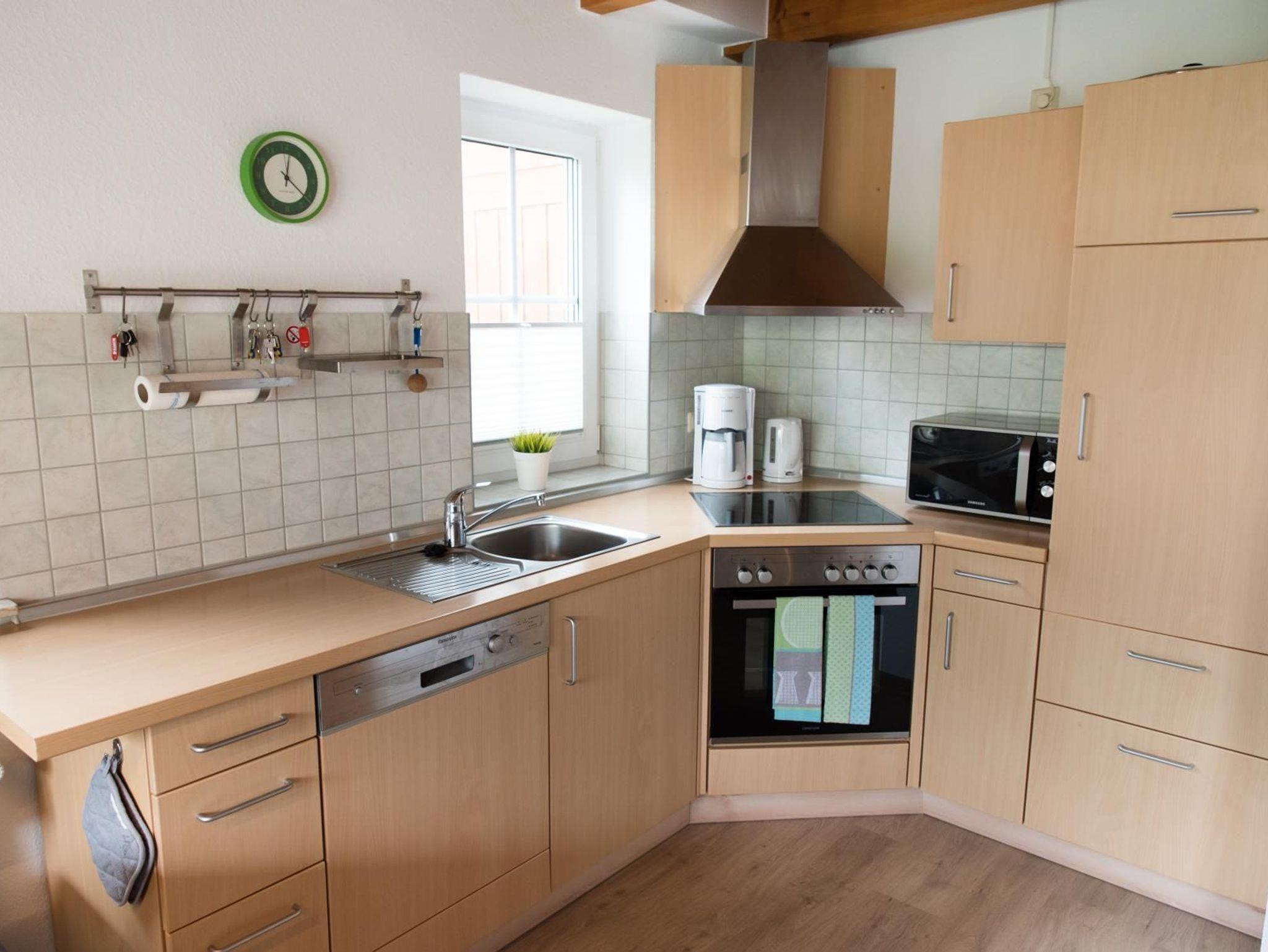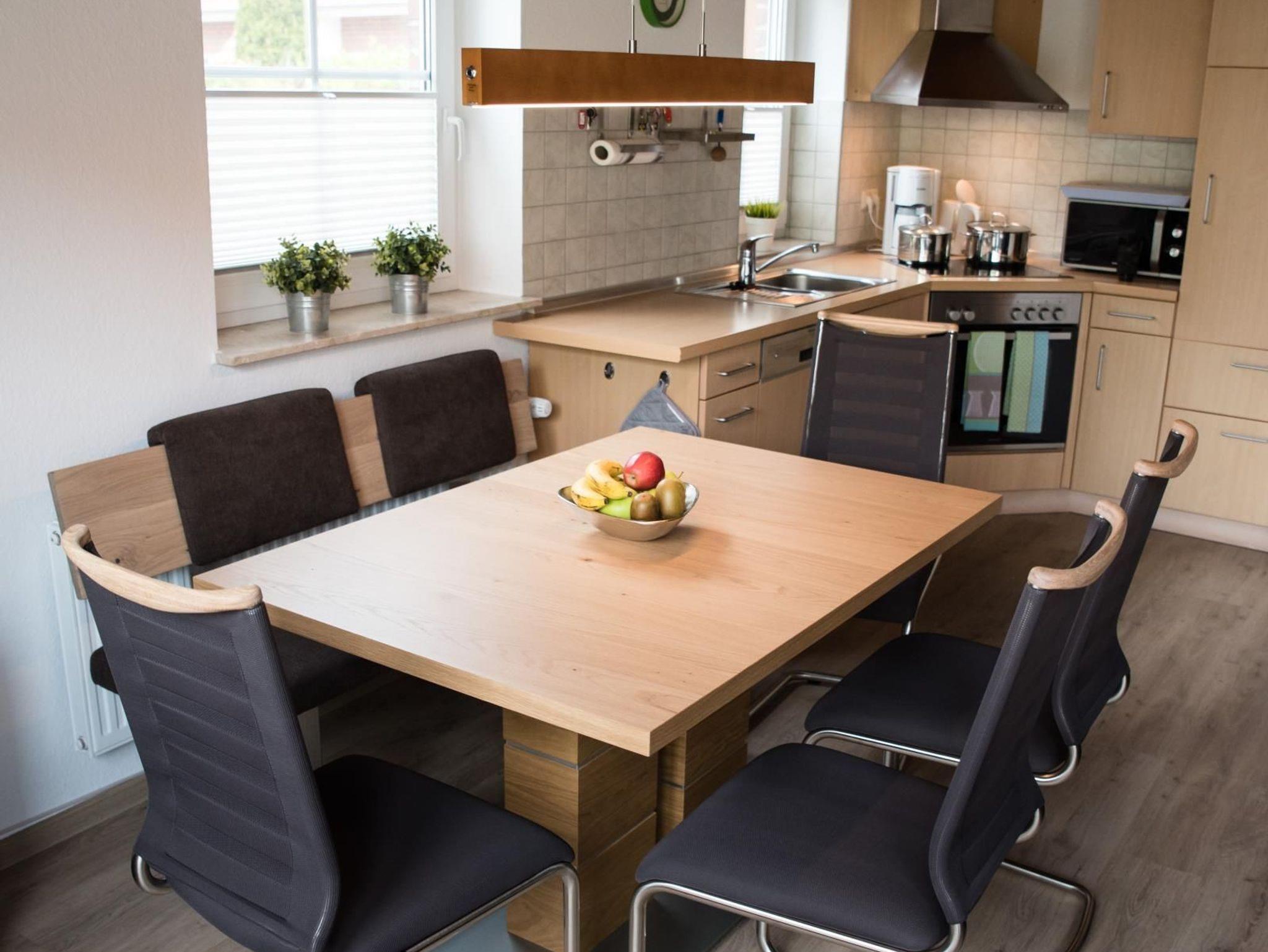 Im Erdgeschoss geht man durch den Flur in einen gemütlichen Wohnbereich mit bequemen Sitzmöbeln. Flat-TV, Hi-Fi-Anlage, CDs und Bücherecke stehen den Gästen zur Verfügung. Ein Esstisch für sechs Personen und eine gut ausgestattete Küche mit allen üblichen Geräten sind selbstverständlich vorhanden. Hier befindet sich noch ein Schlafraum mit zwei Einzelbetten und ausreichendem Stauraum, ebenso eine Nasszelle.