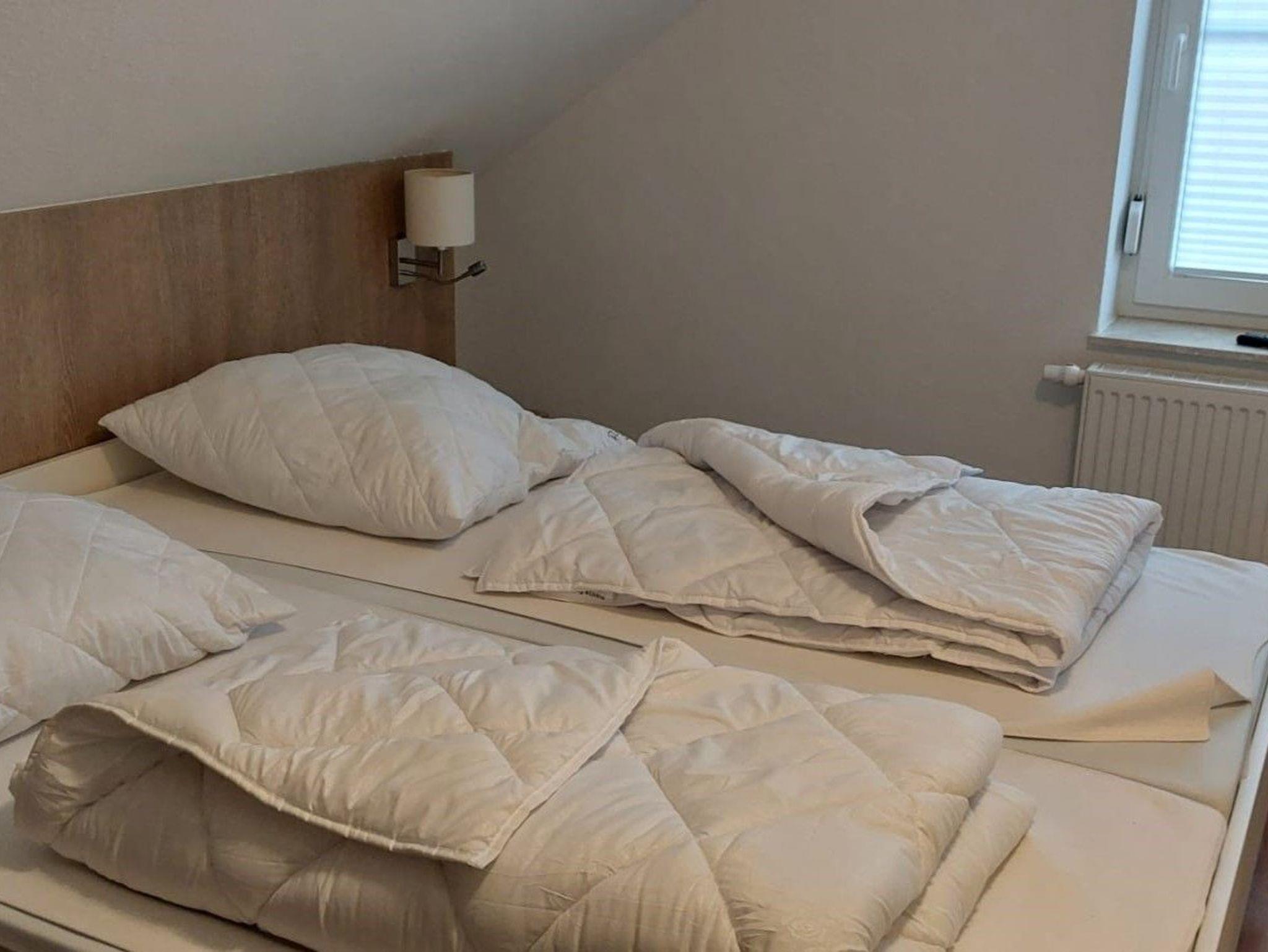 Im Obergeschoss befinden sich drei Schlafzimmer: Das Elternschlafzimmer verfügt über ein Doppelbett mit neuen Matratzen und verstellbaren Lattenrosten sowie einen 42-Zoll-Fernseher. Ein weiteres Zimmer bietet zwei Boxspringbetten und TV, das dritte ein Einzelbett mit ausziehbarem Unterschubbett und ebenfalls einen Fernseher. Außenrollos und Fliegengitter an den Fenstern sorgen für erholsame Nächte.
