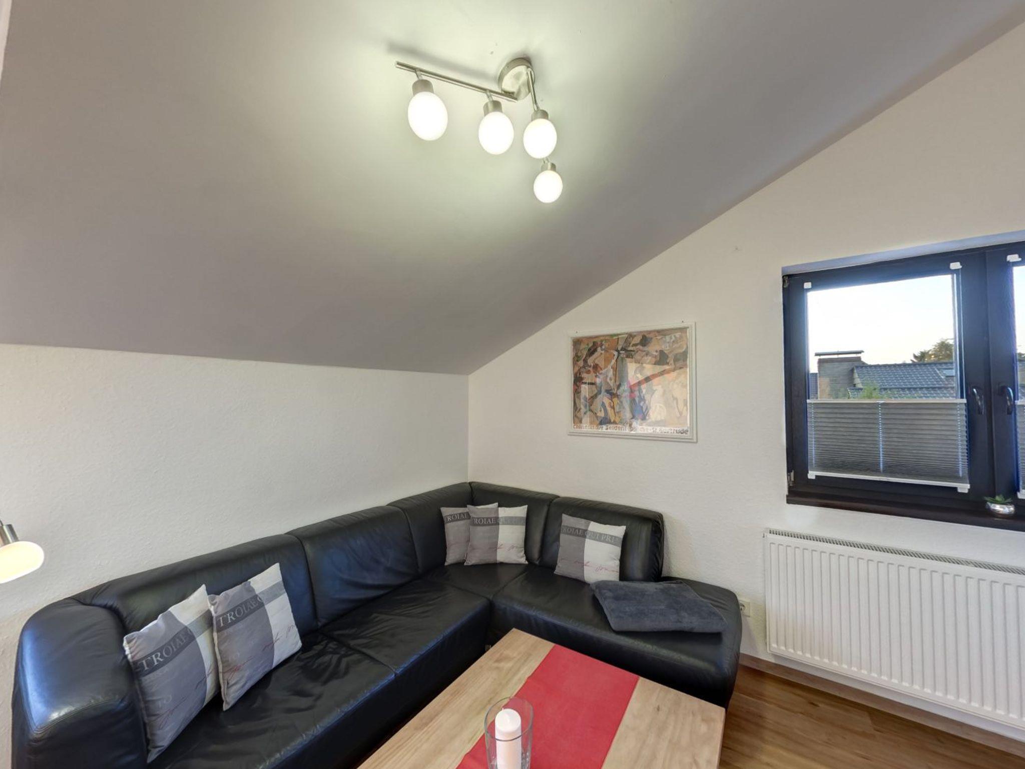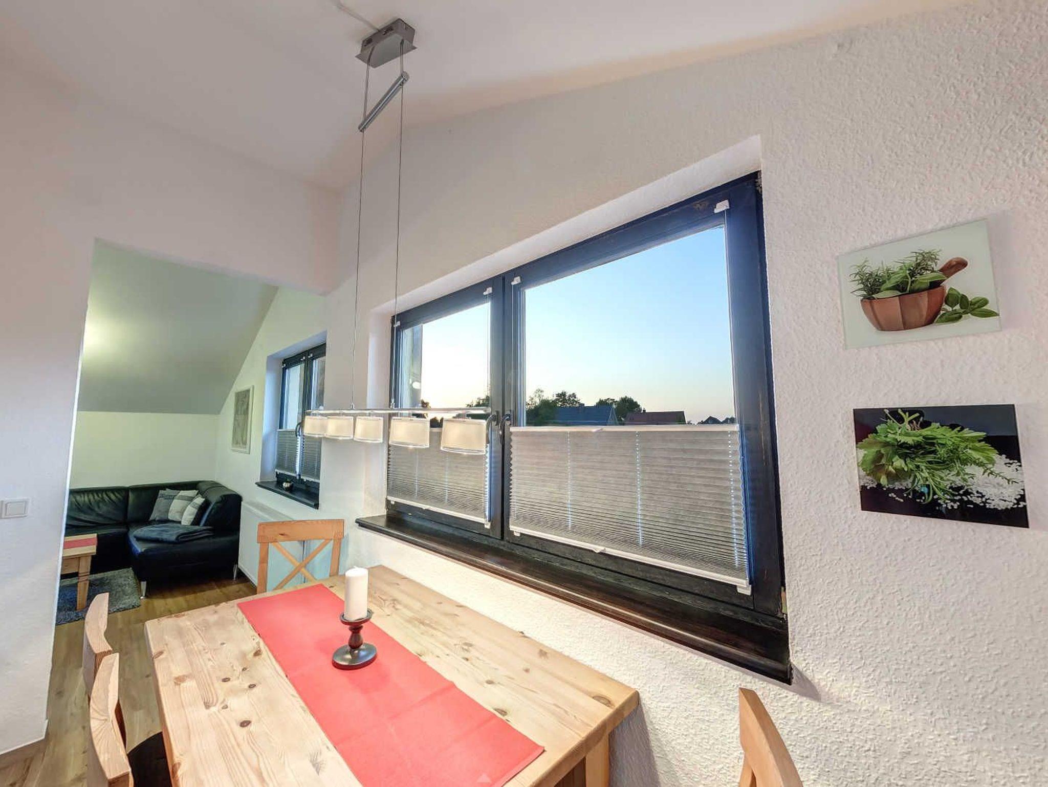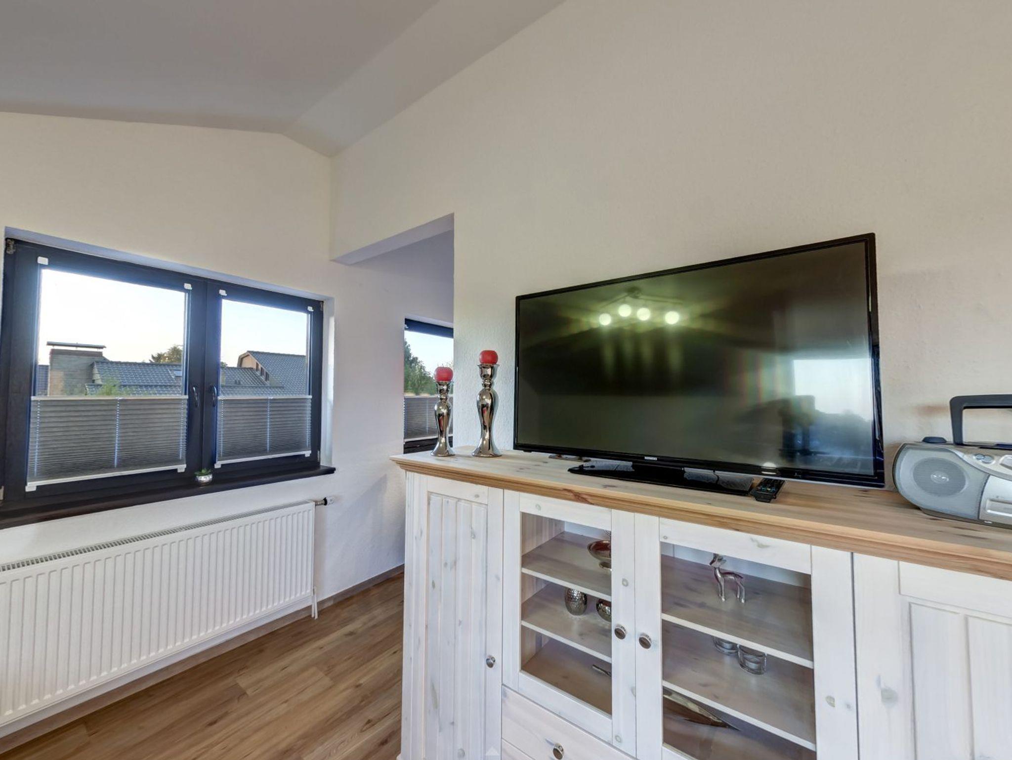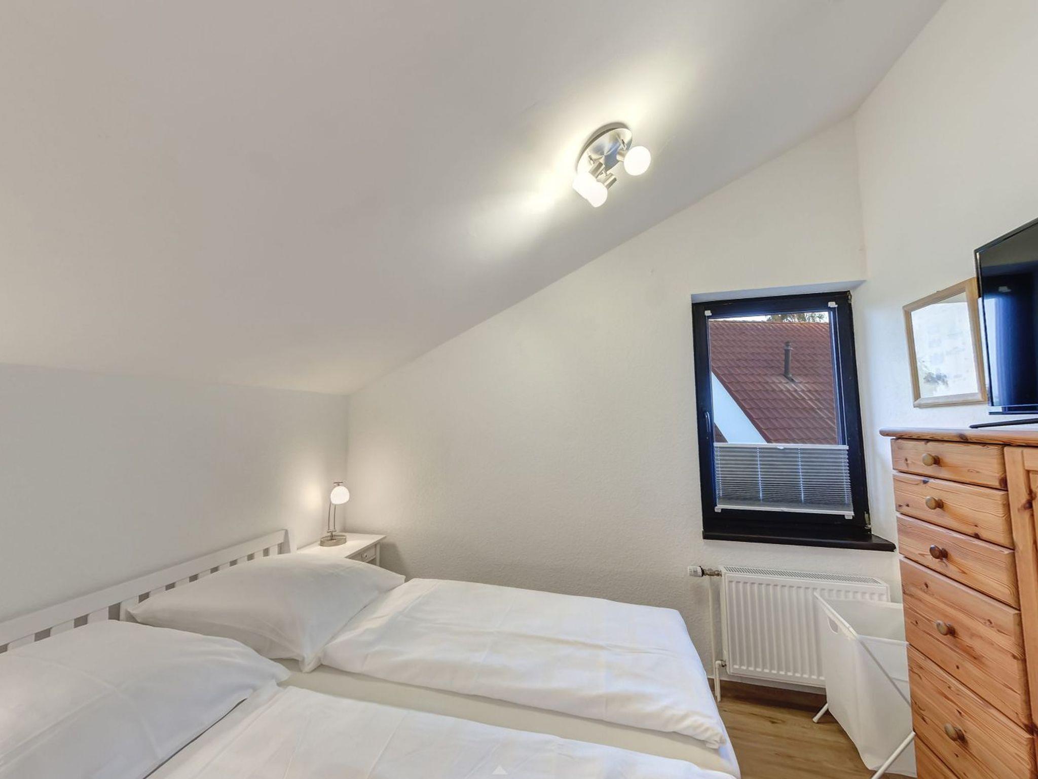 Die offene, komplett ausgestattete Küche mit Esstisch befindet sich hinter dem Wohnzimmer. Das zweite Schlafzimmer mit Doppelbett, Flat-TV und Regal befindet sich direkt neben dem Wohnzimmer.