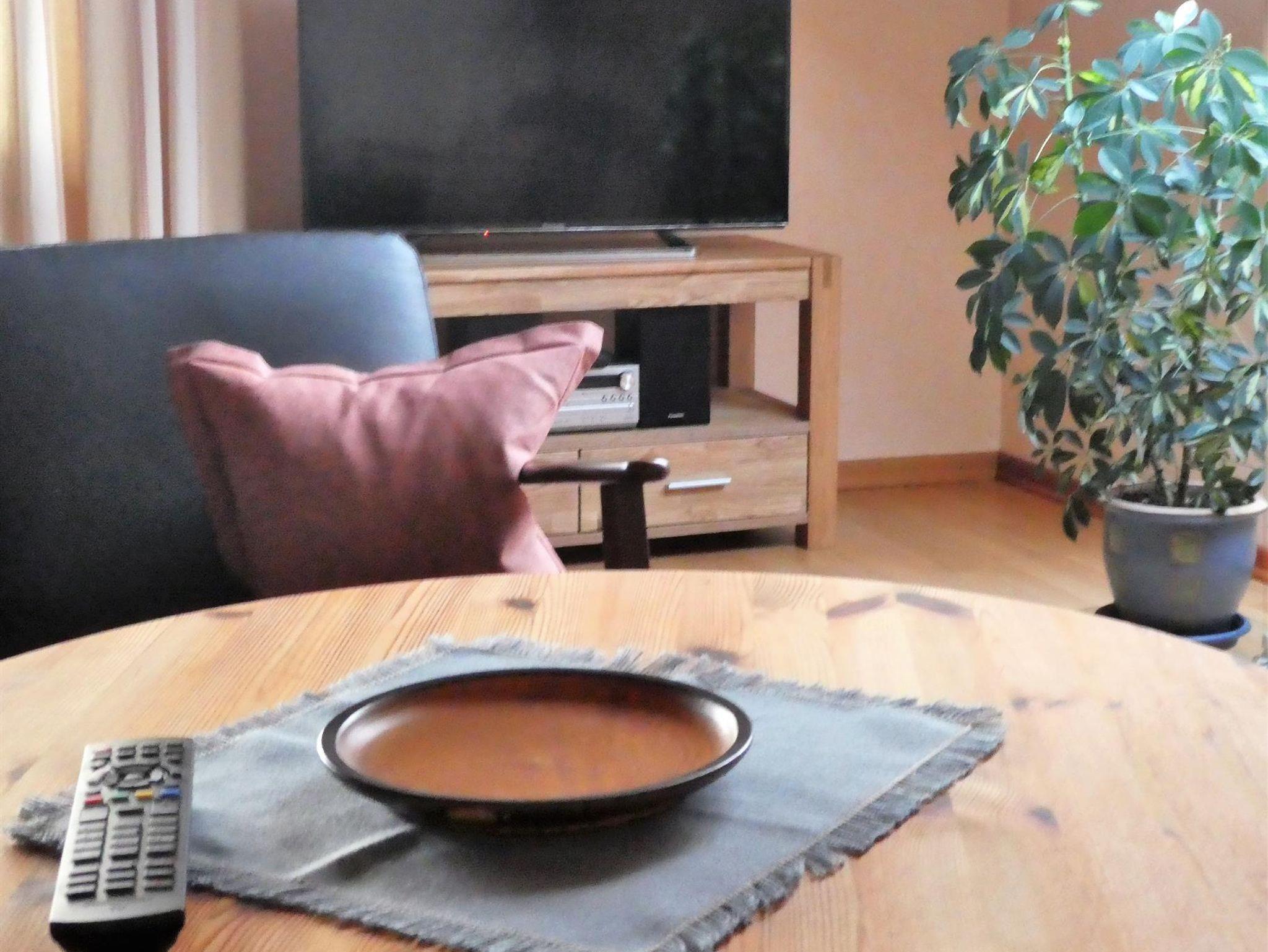 Das geräumige Wohnzimmer verfügt über einen Essplatz und einen Sitzbereich mit TV sowie WLAN. Der überdachte Südbalkon mit Tisch und Stühlen bietet Ihnen Ruhe und Erholung bei einem freien Blick in die Marschenlandschaft.