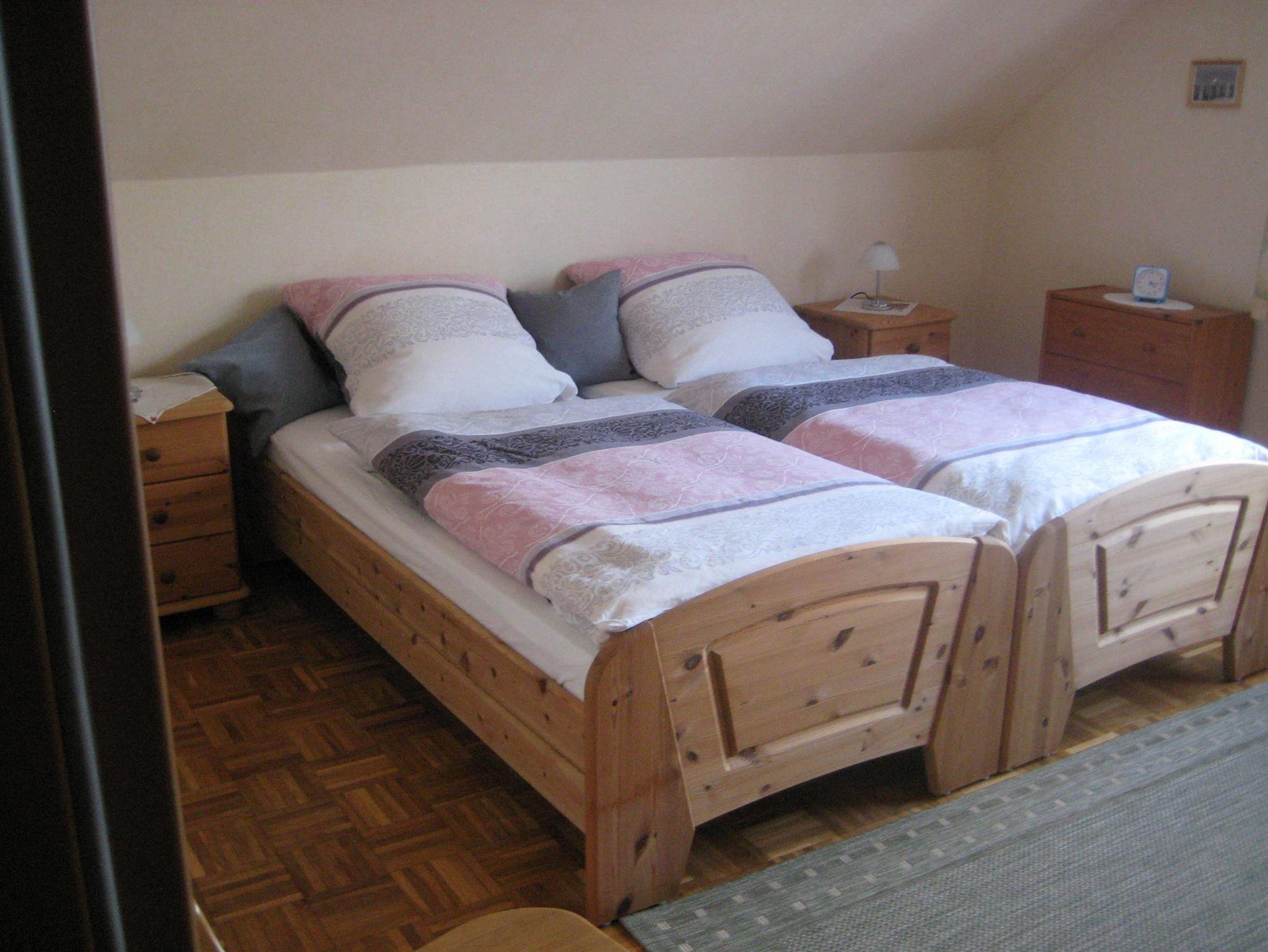 Ein Schlafzimmer verfügt über ein Doppelbett (200x200 cm) und ein Schlafzimmer ist ausgestattet mit einem französischen Bett (140x200 cm), zudem verfügen beide Schlafzimmer über einen Kleiderschrank. Die Küche mit Essplatz ist ausgestattet mit Kühlschrank, Herd, Geschirrspüler, Mikrowelle, Filter-Kaffeemaschine, Toaster und diversen Küchengeräten.