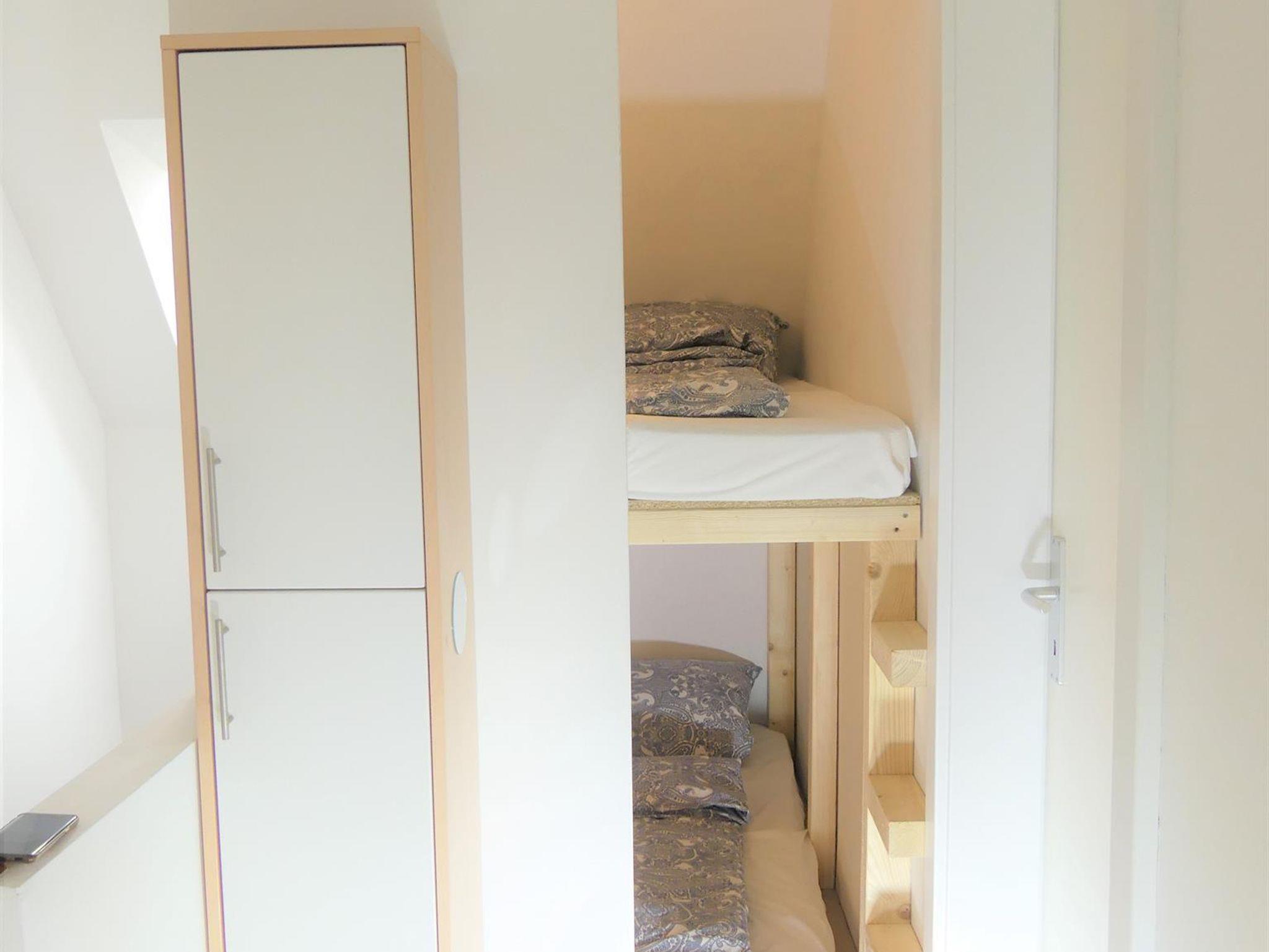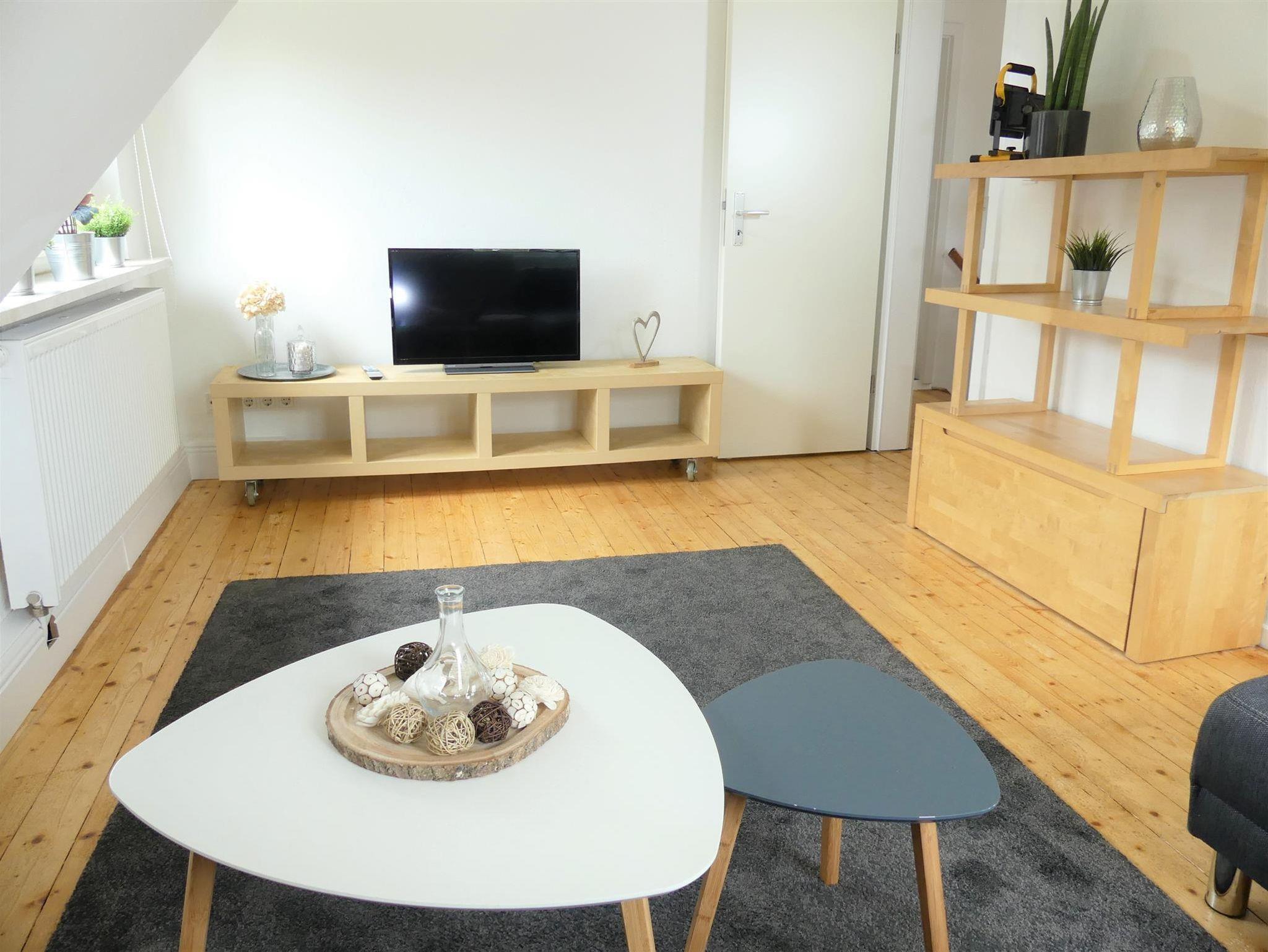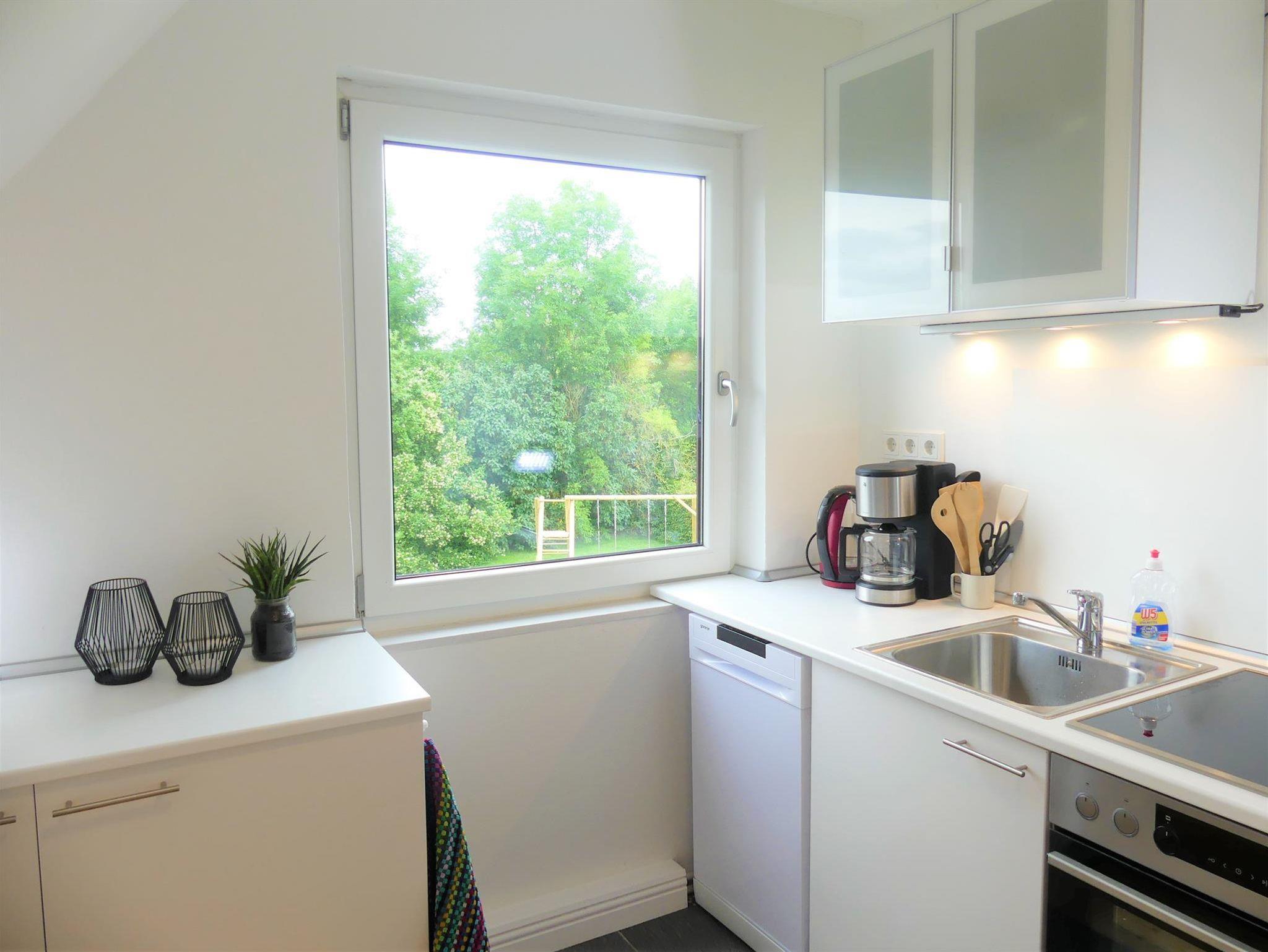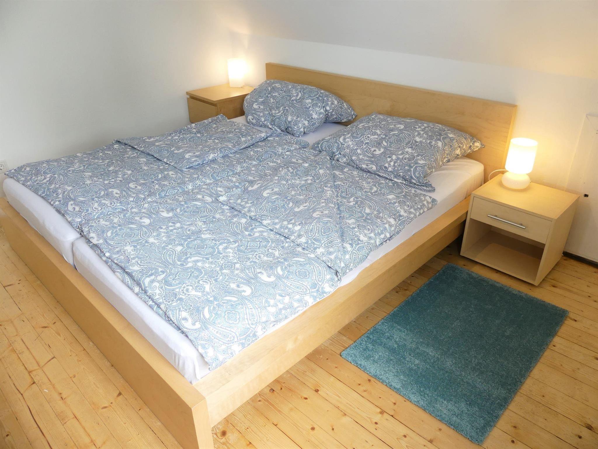 Über eine kleine Treppe erreichen Sie die Wohnung im 1. Obergeschoß. Sie hat ein Wohnzimmer, ein Schlafzimmer, eine Küche und ein großes Bad. Das Wohnzimmer lädt auf einer gemütlichen modernen Sofaecke zum abendlichen Spielen und Filme gucken ein. Das Schlafzimmer hat ein großes Doppelbett. Für die Kinder haben wir zwei separate Alkovenbetten gebaut mit 1,80m und 1,90m Länge. Unsere Kinder wollen gar nicht wieder raus aus ihrem „Nest“. Die Küche hat alles was man braucht zum Kochen; eine Kühlgefrierkombination, Backofen, Spülmaschine, Filterkaffeemaschine, Wasserkocher und einen gemütlichen Esstisch. Einen Kinderhochstuhl stellen wir gerne auf Anfrage zur Verfügung. Das Badezimmer mit Doppelwaschbecken und Dusche ist richtig groß und liegt zum Garten.