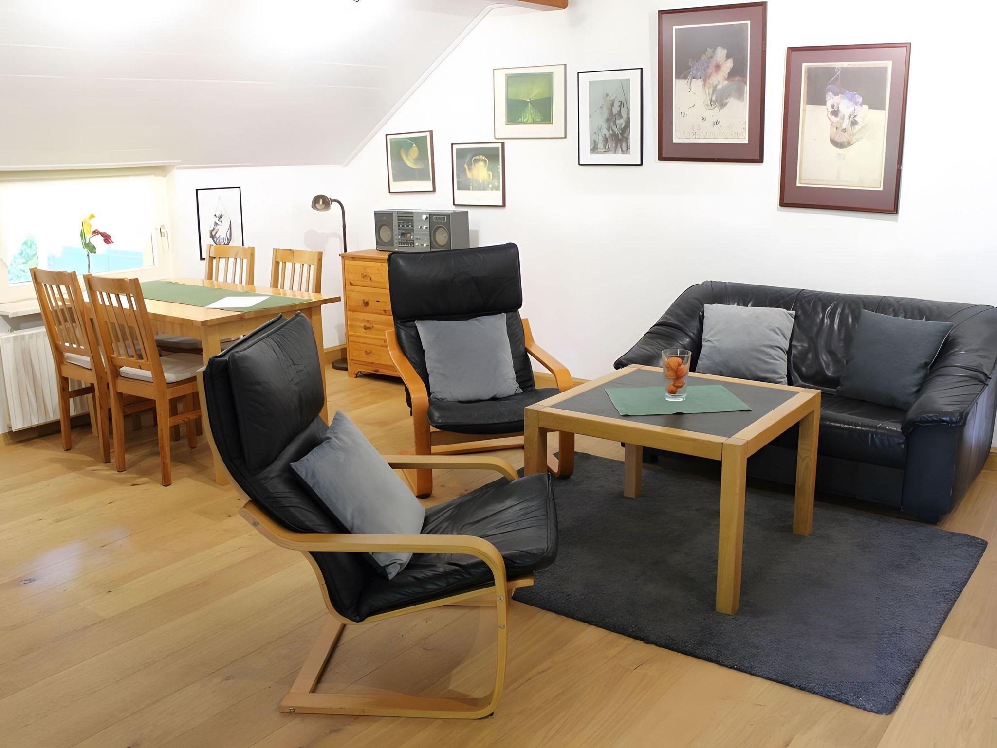 Das kombinierte Wohn-/Esszimmer verfügt über eine gemütlich Sitzecke mit Sofa, Sessel, Flat(Sat)-TV und Radio sowie einen Esstisch für 4 Personen. Die sich anschließende offene Küche ist mit Ceranfeld, Backofen, Mikrowelle, Kühlschrank, Kaffeemaschine, Wasserkocher und Toaster ausgestattet (keine Spülmaschine!).