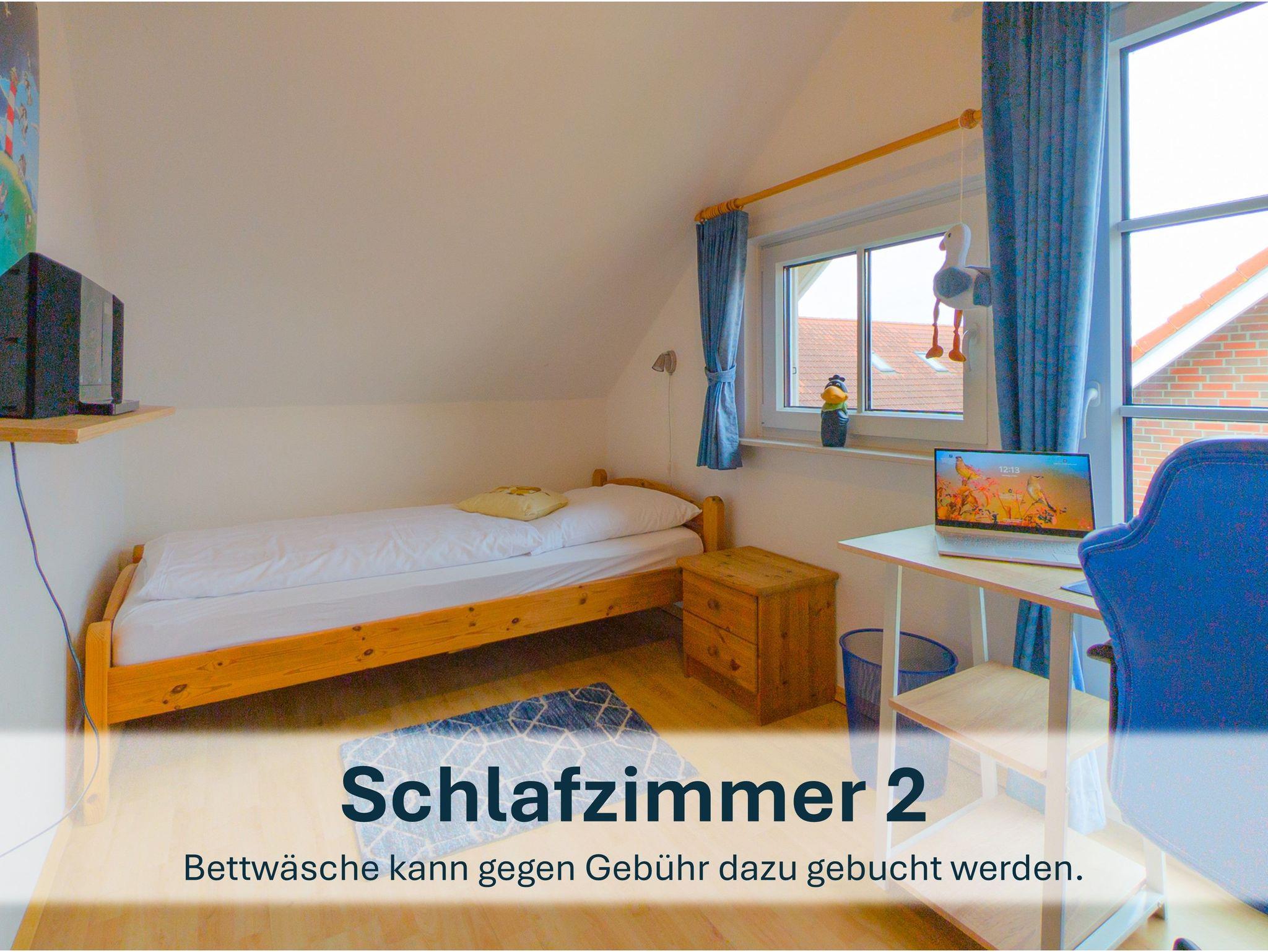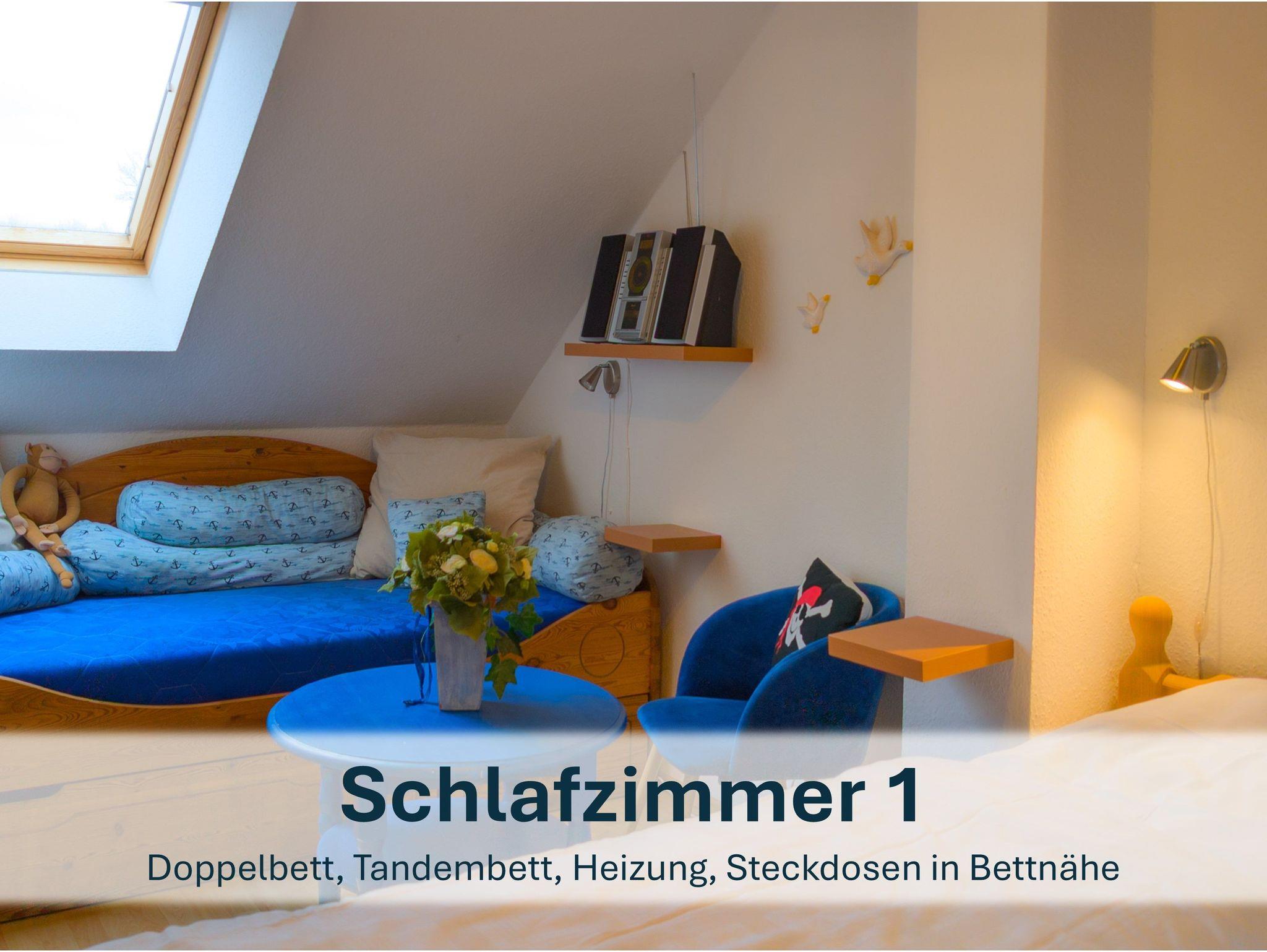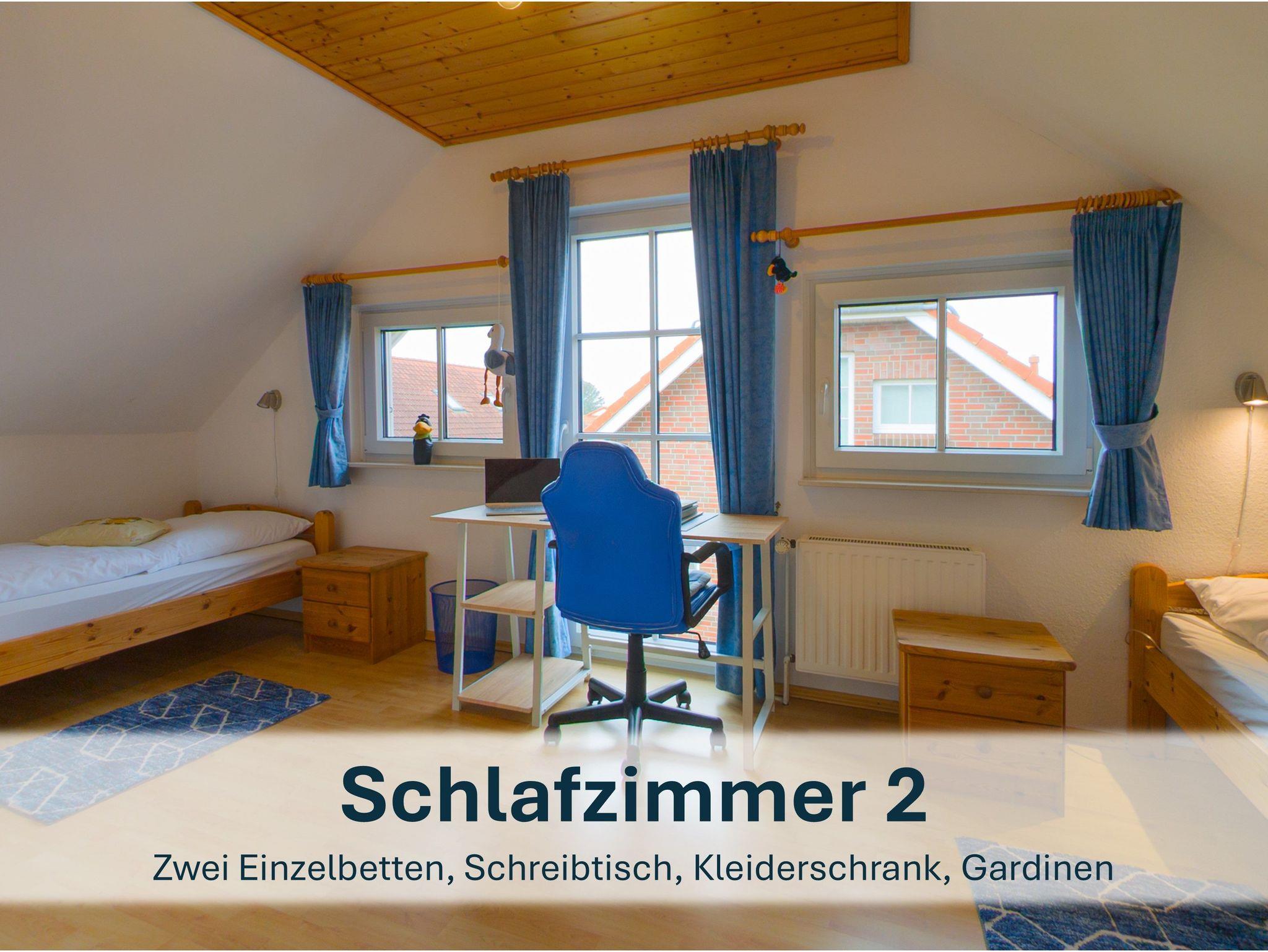 Über die Holztreppe im Flur gelnagen Sie in das Obergeschoss des Hauses.Hier befinden sich zwei weitere Schlafzimmer: ein Kinderzimmer mit zwei Einzelbetten und einem kleinen Schreibtisch, sowie ein Schlafzimmer mit Doppelbett und einer Kommode.