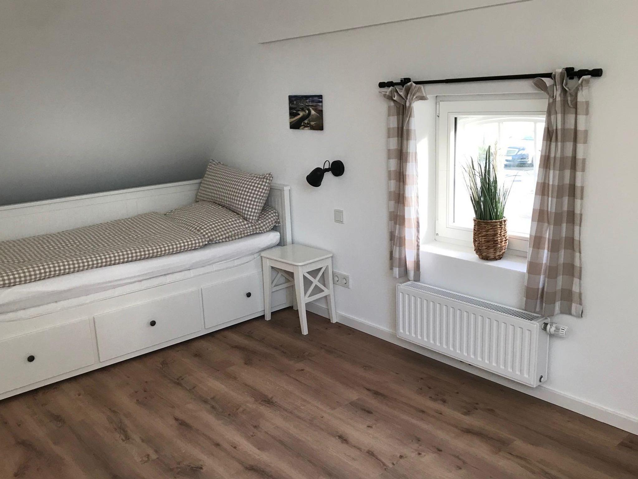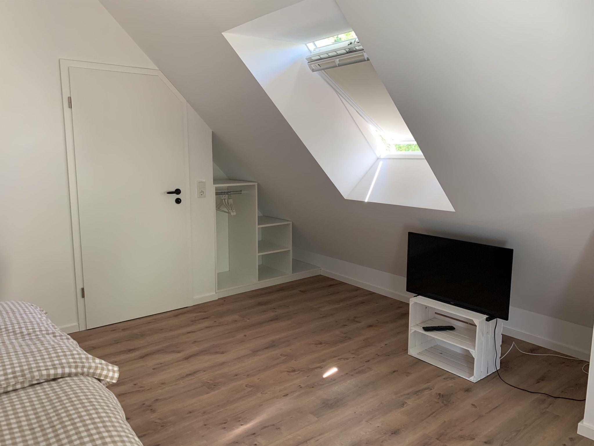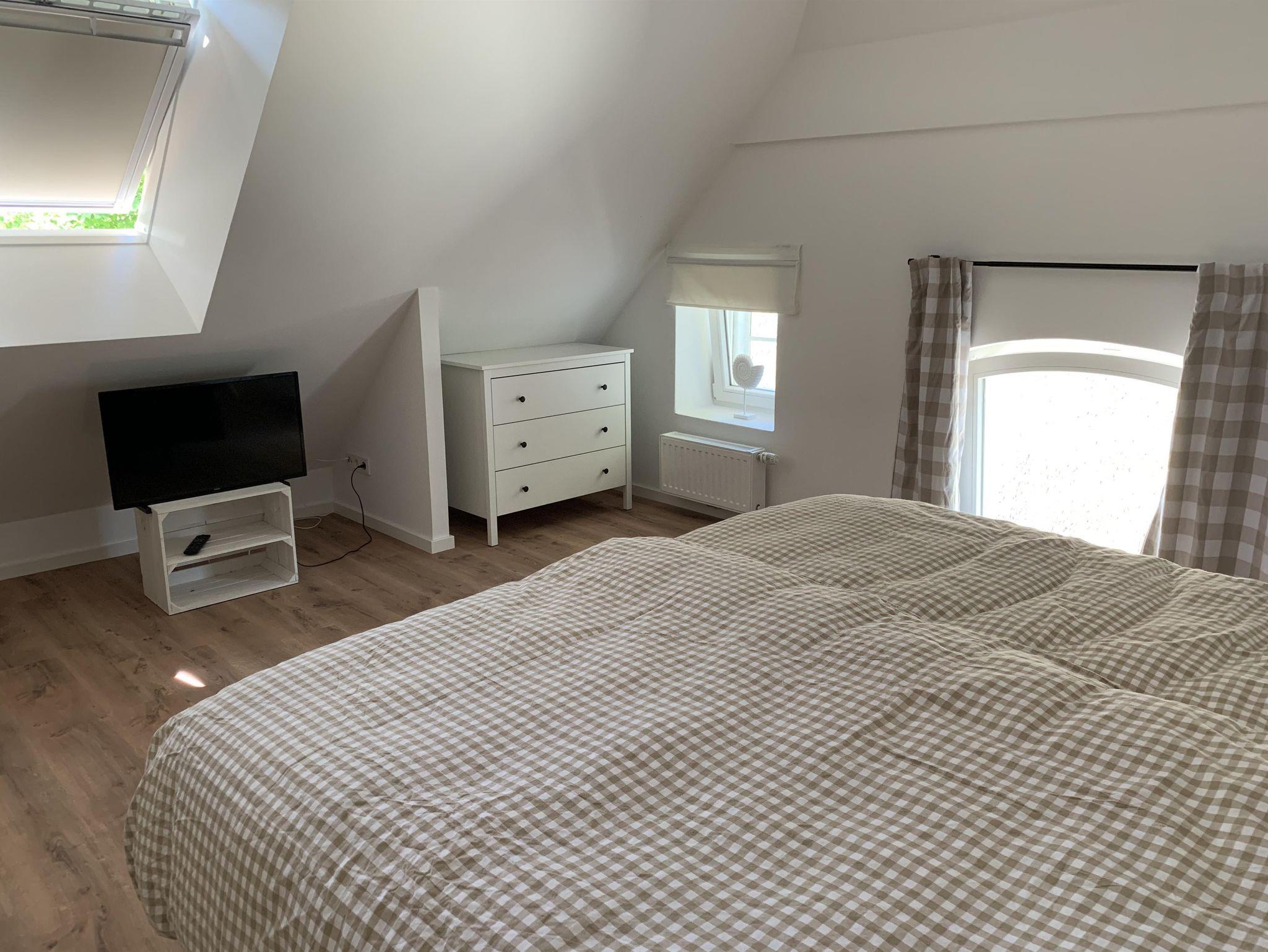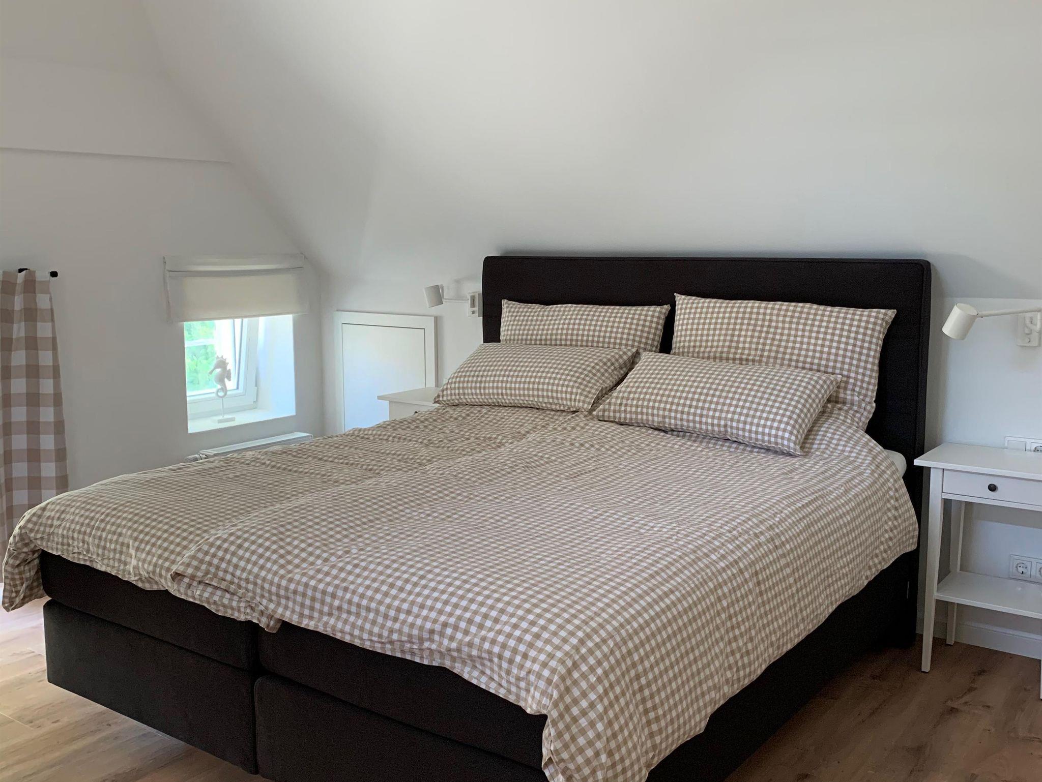 Das Dachgeschoss verfügt über eine Wohnfläche von ca. 30qm zzgl. Stauraum. Von einem kleinen Flur gelangt man in ein größeres Schlafzimmer mit Doppelbett sowie ein kleineres Schlafzimmer mit zwei Einzelbetten. Grundsätzlich ist das Haus für 4-5 Personen ausgelegt. Es besteht die Möglichkeit, die Einzelbetten auszuziehen, sodass bis zu 5 Personen im Haus Platz finden. Die Schlafzimmer haben jeweils große Veluxfenster, die die Räume hell ausleuchten mit einem wunderschönen Blick in den Garten.