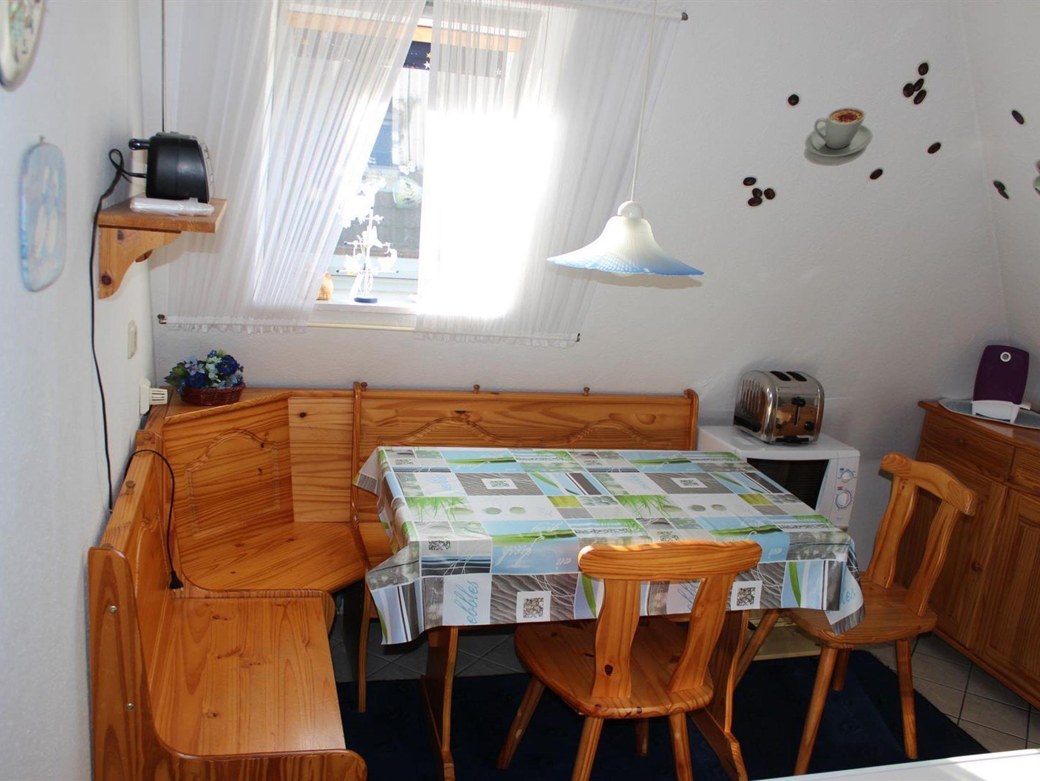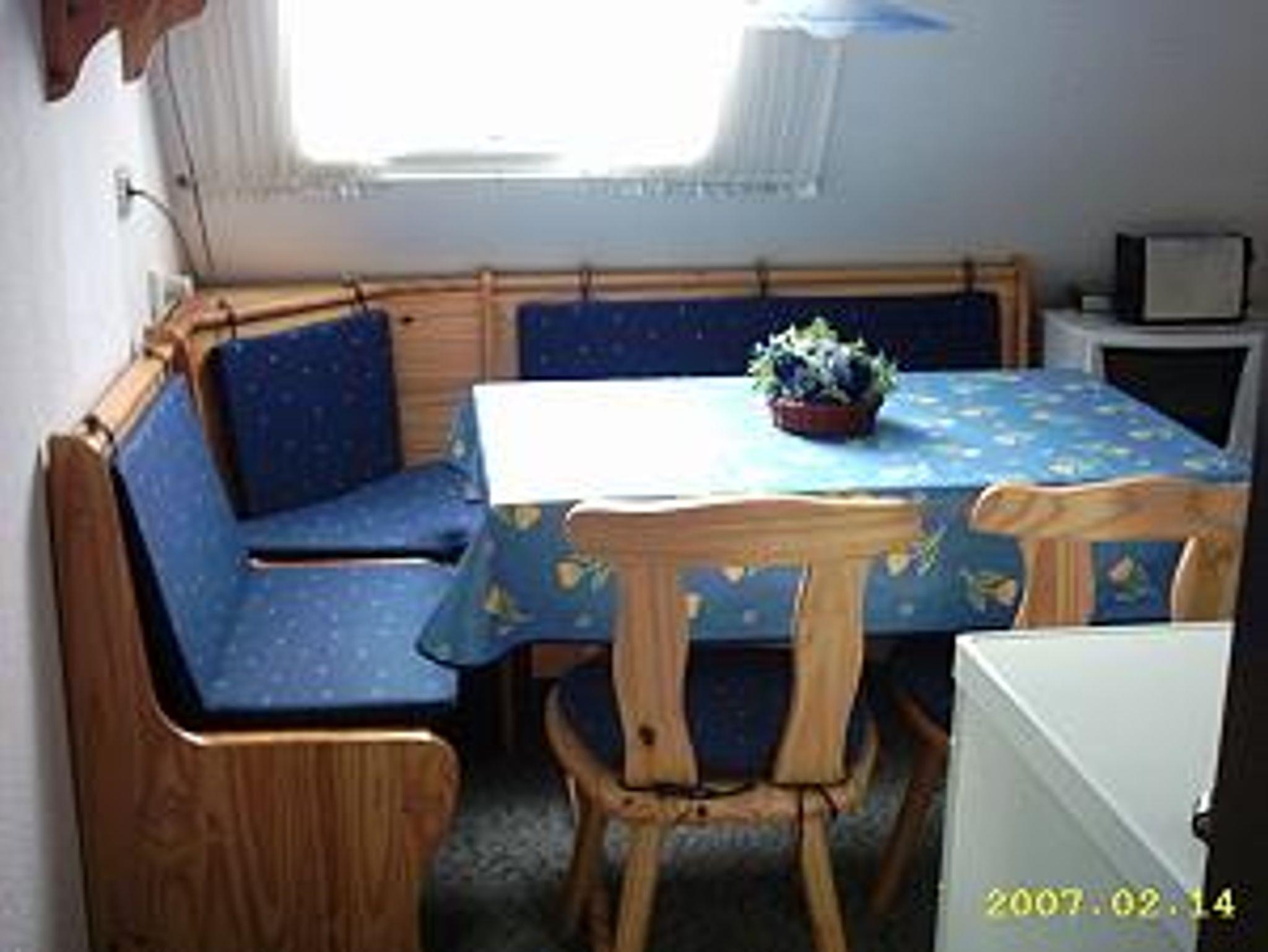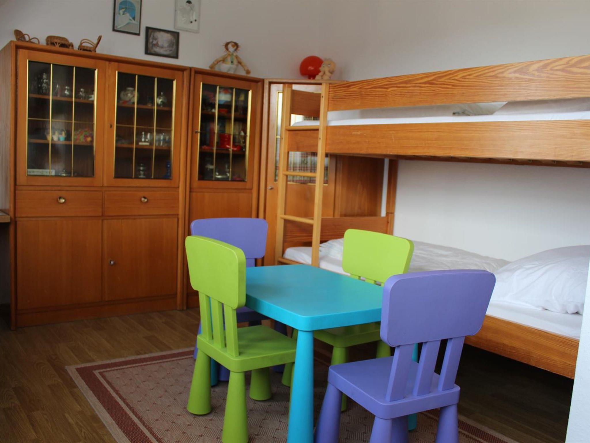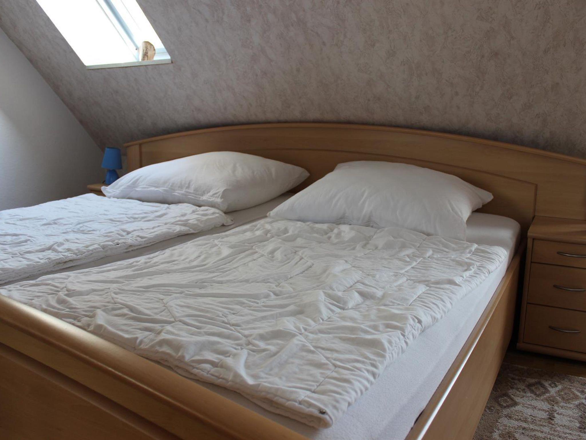 Die Ferienwohnung 1 hat ein gemütlich eingerichtetes großes Wohnzimmer, in dem Sie nicht nur TV sondern auch Spiele zur Verfügung haben. Die Küche mit Essgruppe ist u.a. mit einem Backofen, Kühlschrank mit Gefrierfach, Mikrowelle, Eierkocher und Toaster sehr gut ausgestattet. Im Doppelschlafzimmer steht zusätzlich ein Gästebett und ein Fernseher, im zweiten Schlafzimmer befindet sich, ein Fernseher, ein Kindergitterbett sowie Etagenbetten, die aber auch einzeln stellbar sind. Das Bad hat Dusche/WC und eine Waschmaschine (die gegen eine Gebühr benutzt werden kann). Diese Wohnung verfügt über einen Balkon mit Sitzmöbel.