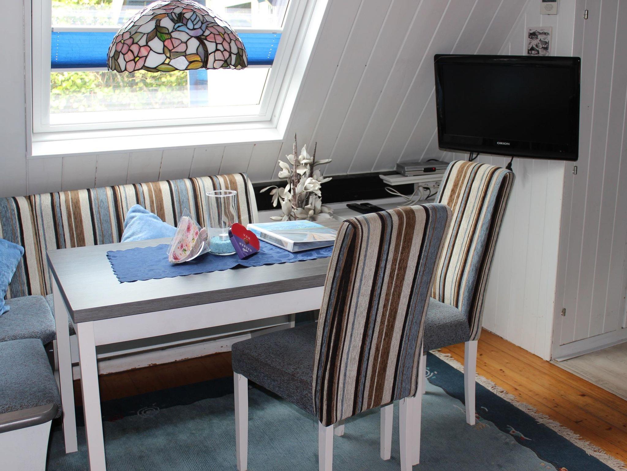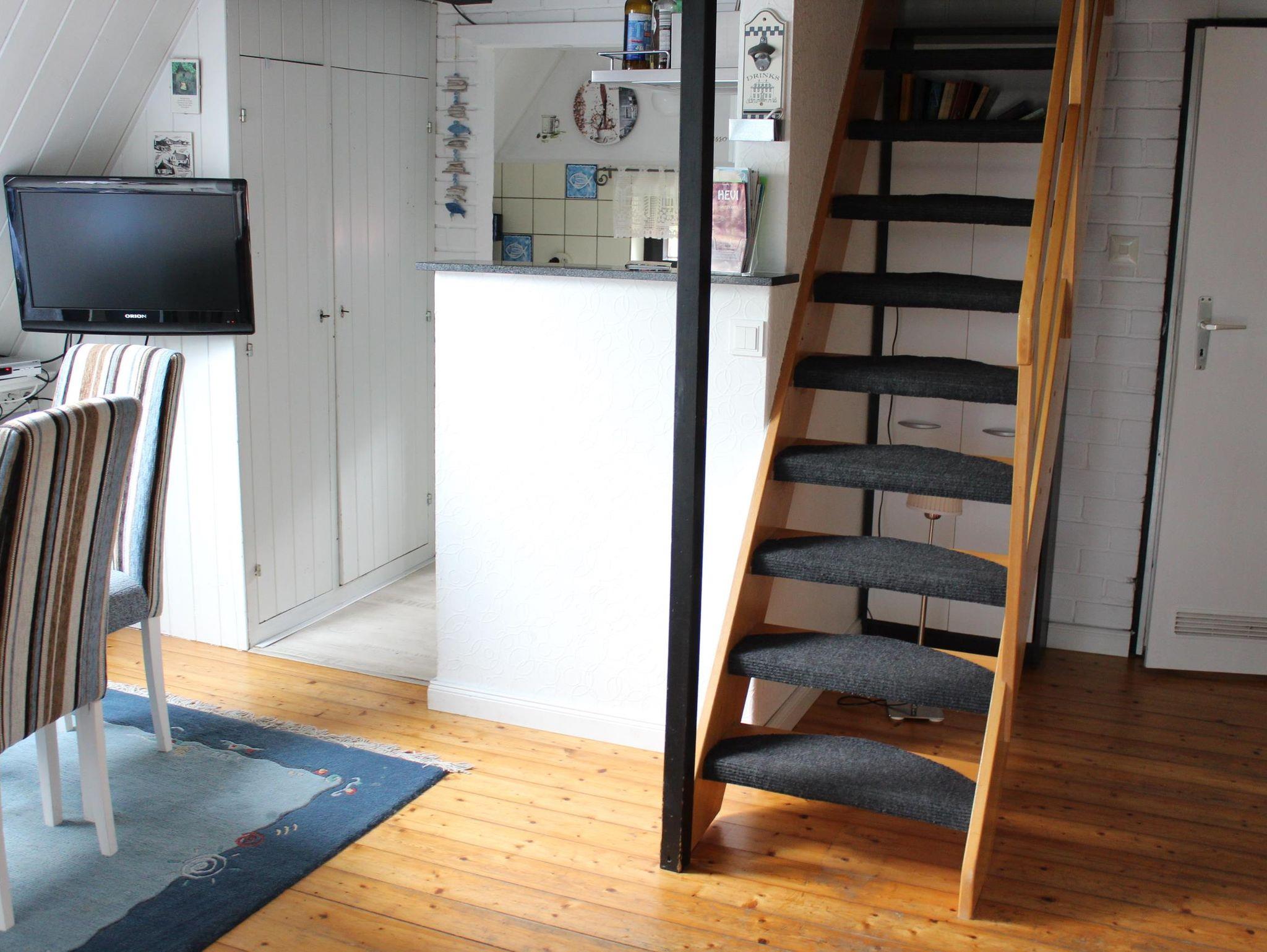 Das kleine aber sehr gemütliche Ferienhaus in Burhave wurde im Jahr 2016 um ein Schlafzimmer vergrößert und renoviert. Es besteht im Erdgeschoss aus einem hellen Wohnraum mit Essecke und einer Schlafcouch, einer offenen Küchenzeile mit Senseo-Kaffeemaschine und Spülmaschine, einem Doppelschlafzimmer und einem renovierten kleinen Bad. Im Dachgeschoss befindet sich das Schlafzimmer, in dem bei Bedarf auch ein Kinderbett aufgestellt werden kann.