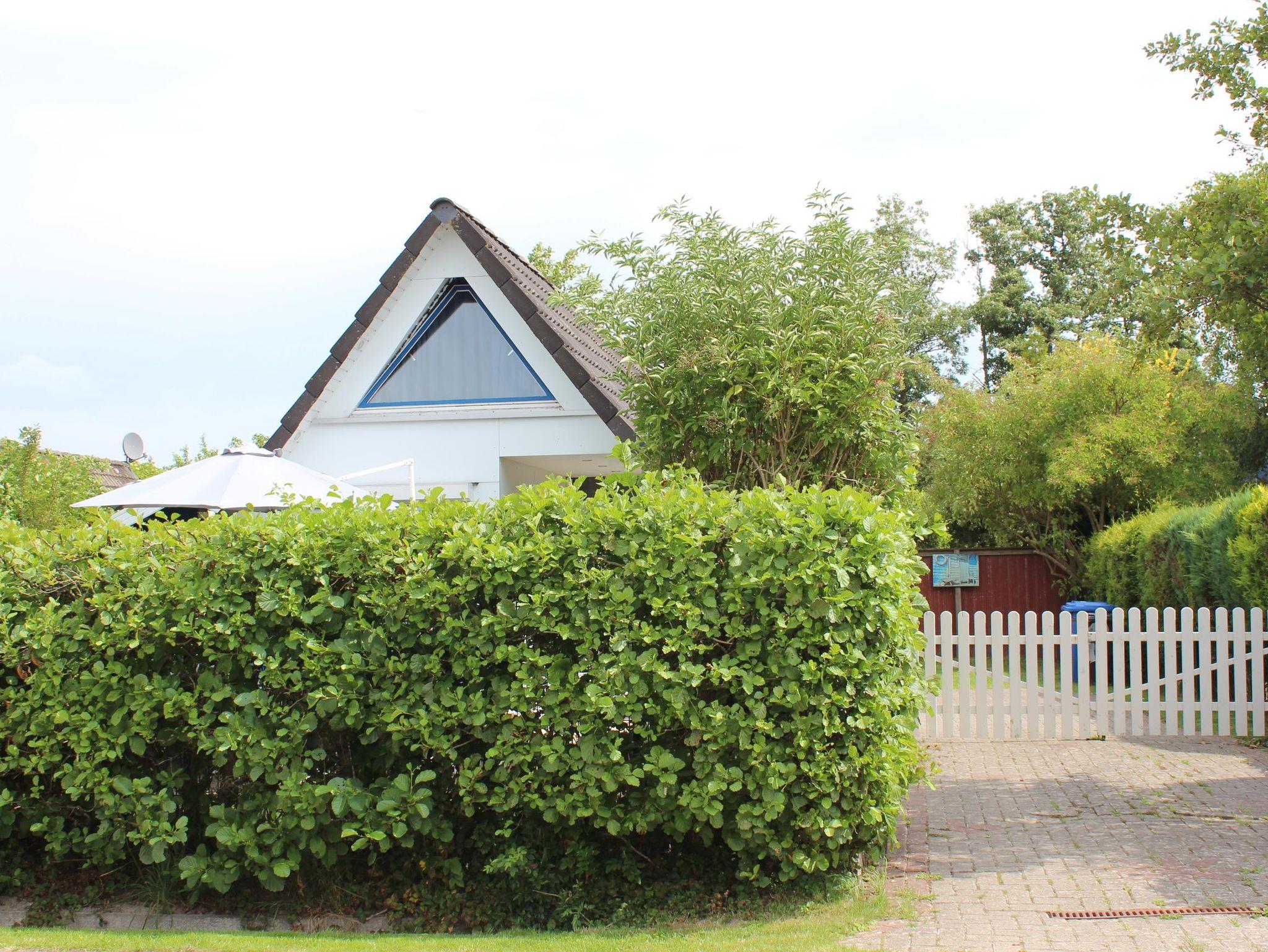 Auf dem eingezäunten und hundefreundlichen Rasengrundstück befindet sich auch eine Terrasse mit Terrassenmöbeln und mit Strandkorb am Haus.