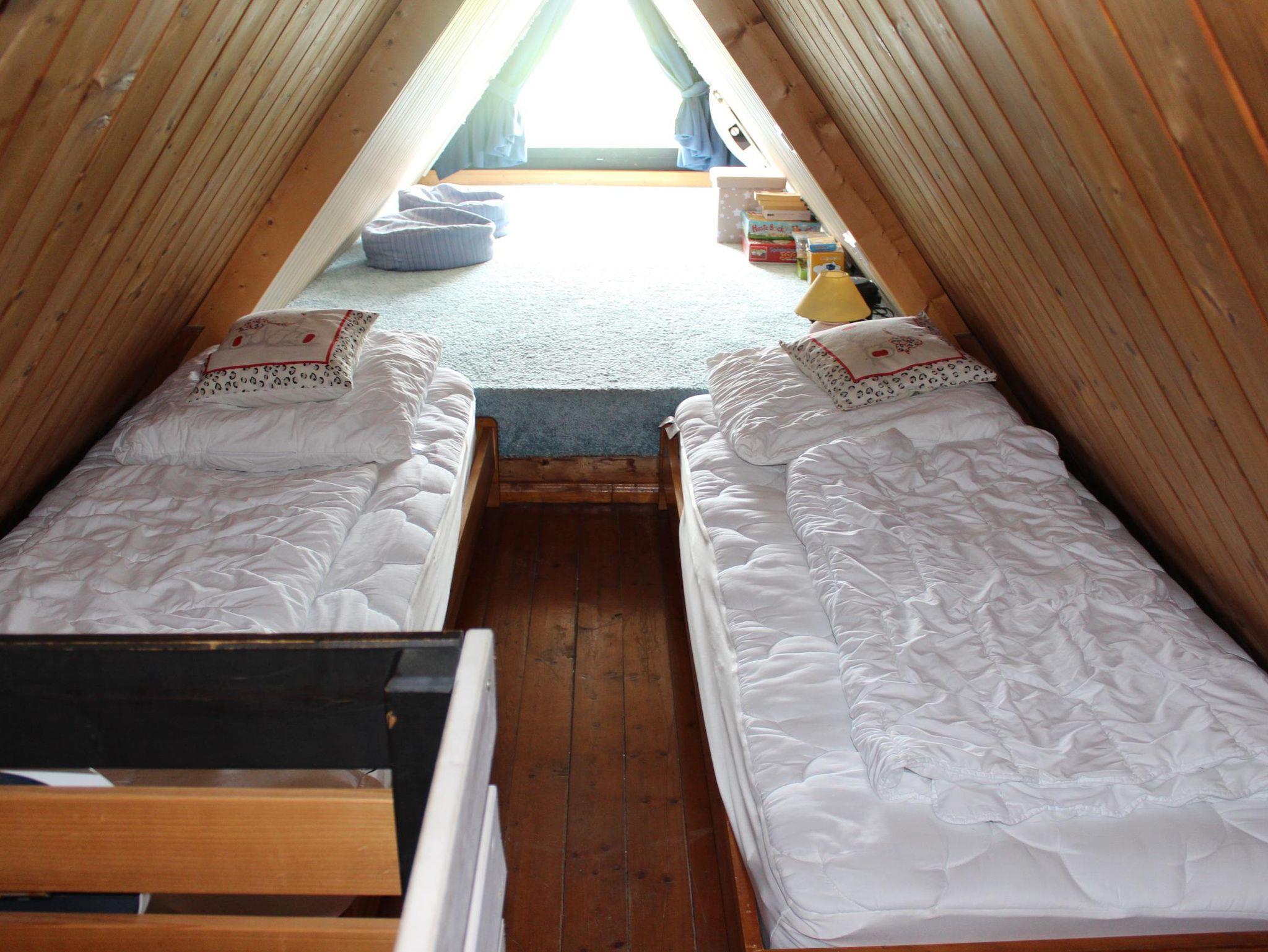 Das kleine und gemütliche Ferienhaus besteht im Erdgeschoss aus einem großen hellen Wohnraum mit offener Küchenzeile und Tresen. Essecke ist mit einer Sitzbank ausgestattet. Die Wohnecke besteht aus einem gemütlichen Sofa, einem Relexstuhl, Flachbildschirm und Radio. Die Küche hat einen Geschirrspüler, Kühlschrank und E-Herd. Ebenfalls befindet sich im Erdgeschoss ein Schlafzimmer mit Doppelbett und ein Bad mit Dusche, WC und Waschtisch. Über eine freie Raumspartreppe geht es ins Obergeschoss, dort befinden sich 2 Schlafplätze. Hier befindet sich sich auch noch Platz für ein Kinderbett.