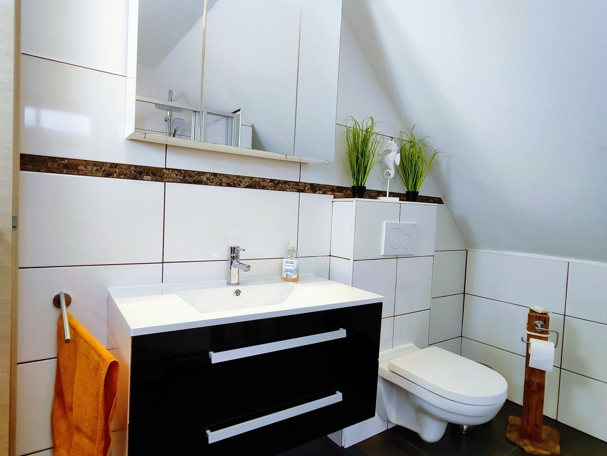 Die 2022 neu ausgebaute Ferienwohnung ist großzügig und modern eingerichtet. Sie befindet sich im 1. Stock und verfügt über 3 Schafzimmer. Eins ist augestattet mit einem Doppelbett, eins mit einem Einzelbett und eins mit einem Bett mit Auszug zum Doppelbett. Das großzügige Wohnzimmer verfügt über einen Essbereich, in dem alle Platz finden. Im Duschbad befindet sich eine Rainshowerdusche, ein WC und die Waschmaschine.In der Küche findet man alles, was die Familie braucht: Kaffeemaschine, Kühlgefrierschrank, Mikrowelle, Geschirrspülmaschine, Backofen mit Ceranfeld,einen Wasserkocher und natürlich einen kleine Sitzecke. Zur Wohnung gehört zudem eine Terrasse und ein eigener Gartenbereich.