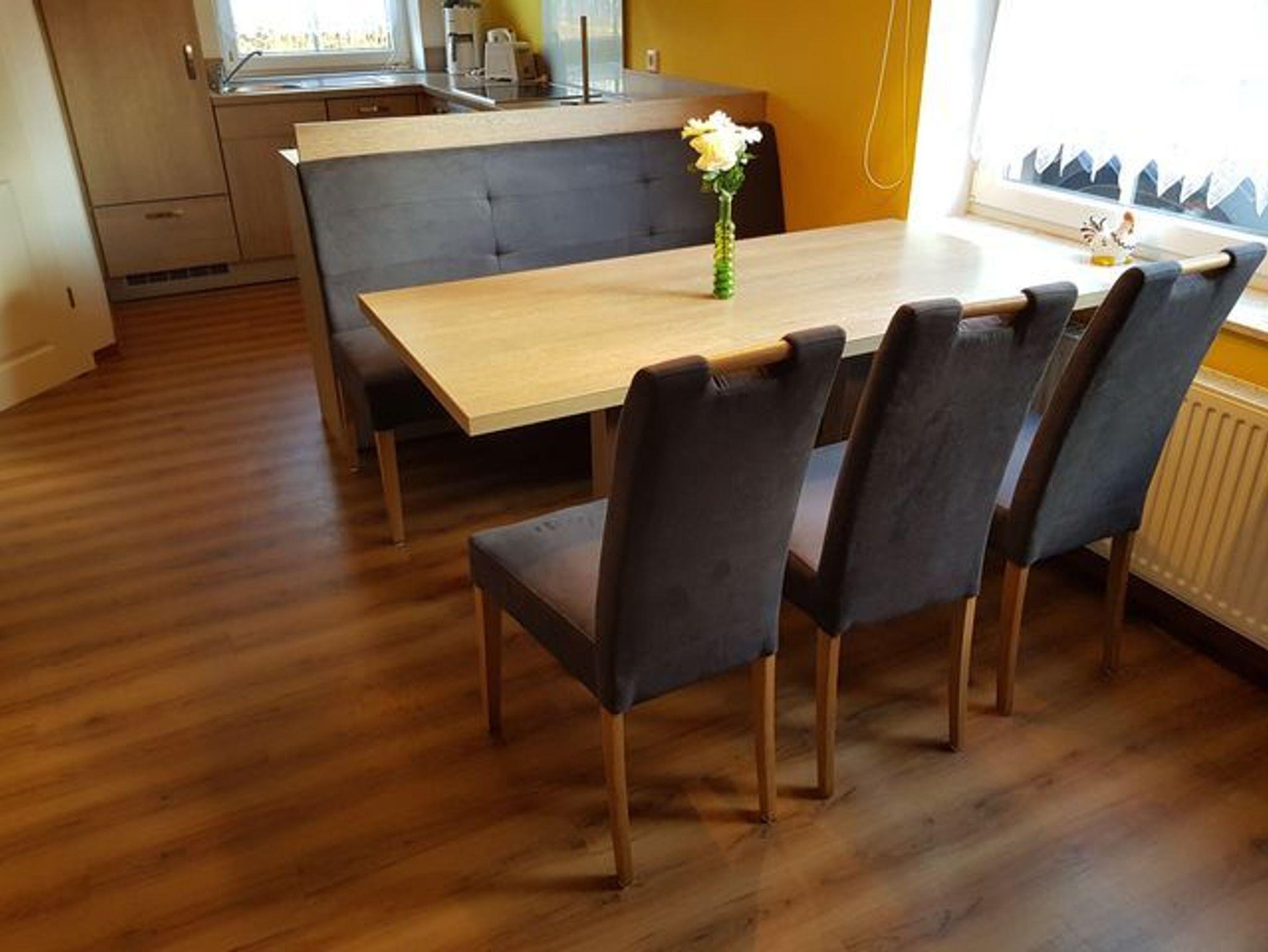Essplatz für bis zu 6 Personen mit Loungebank und drei Stühlen