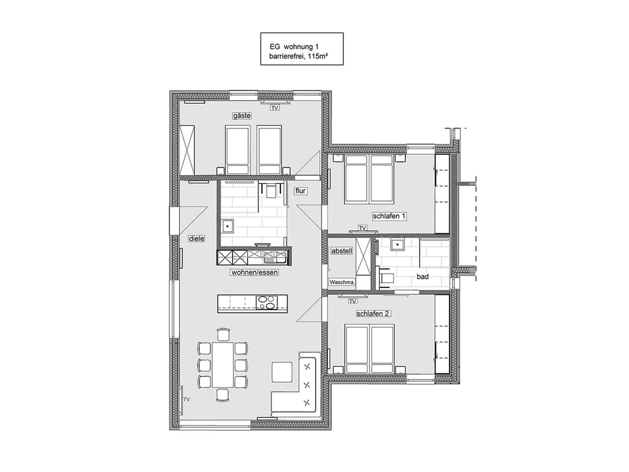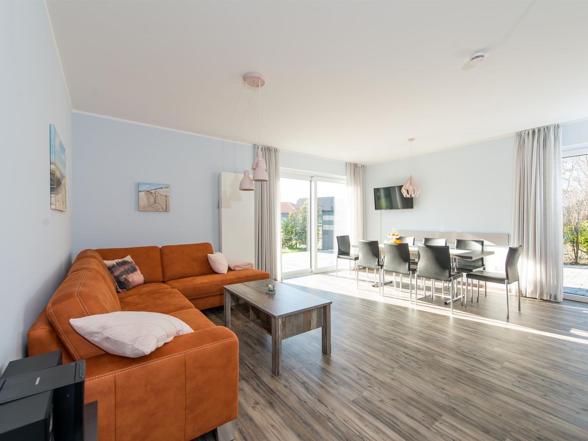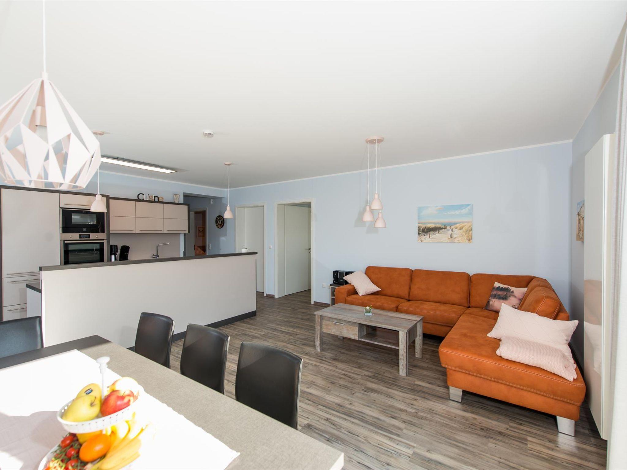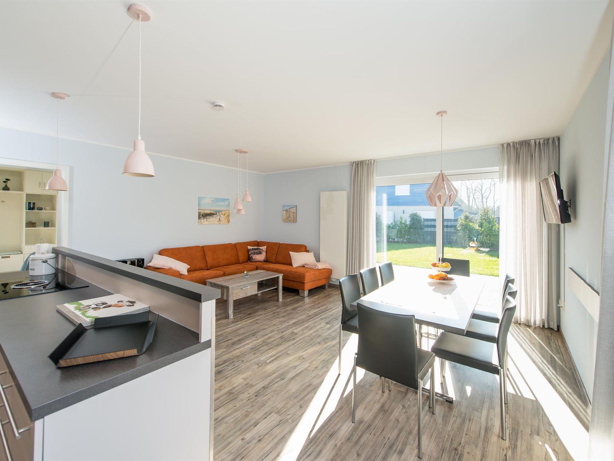 Die ebenerdige und barrierefreie Wohnung lässt keine Urlaubswünsche offen, auch für Menschen mit Gehbehinderung und Rollstuhlfahrer bietet sie tollen Komfort. Ankommen und Wohlfühlen ist hier die Devise. Schon beim Betreten besticht der offene und luxuriöse Koch- und Wohnbereich. Die Küchenzeile mit Mittelblock ist mit allem ausgestattet, was das Herz begehrt und garantiert gesellige Stunden. Vom Wohn-/Essbereich mit Smart-TV und Hifi-Anlage geht es auf die großzügige Terrasse, die mit Strandkorb, Gartenmobiliar und Kugelgrill für erholsamen Aufenthalt im Freien sorgt.