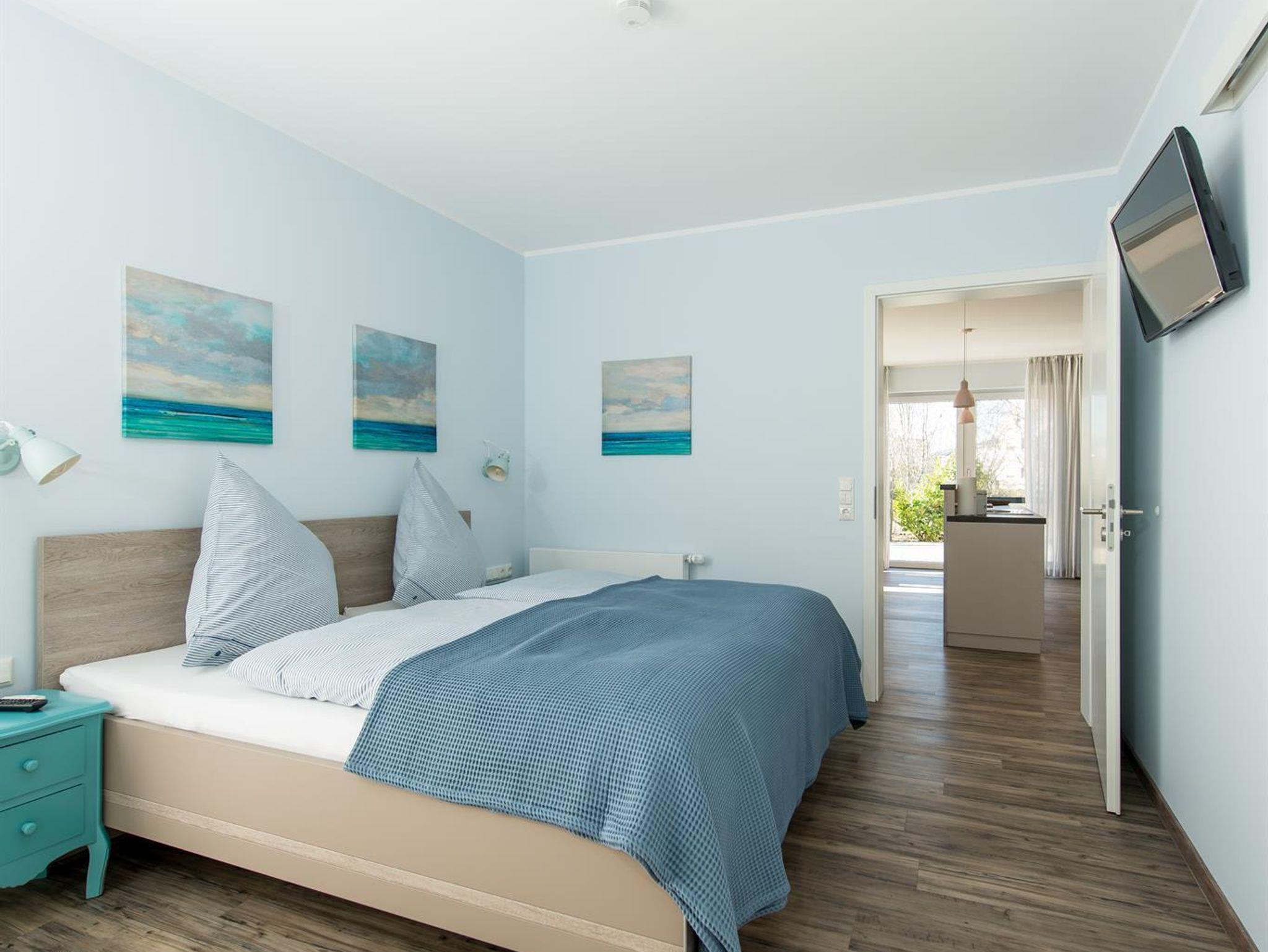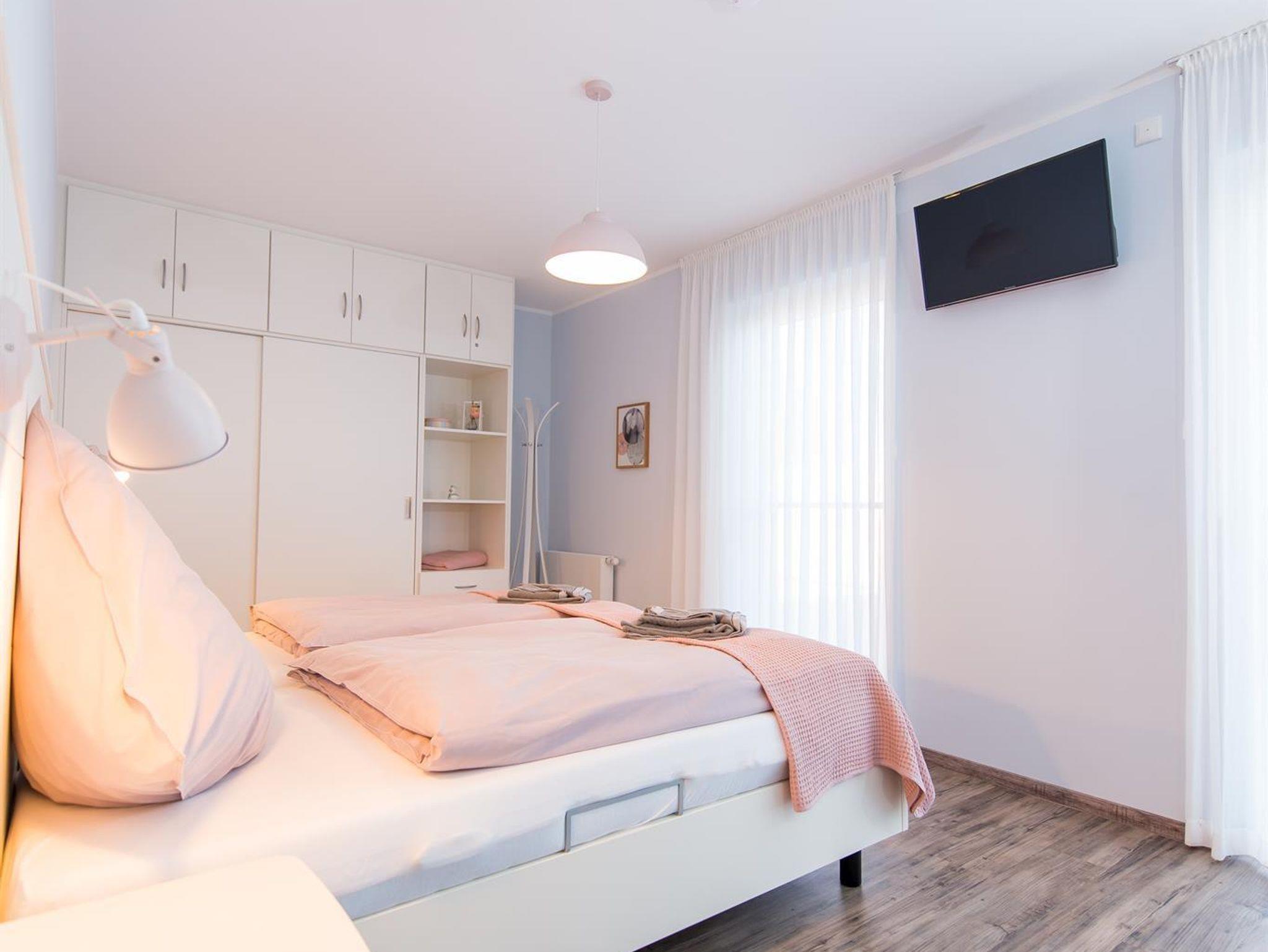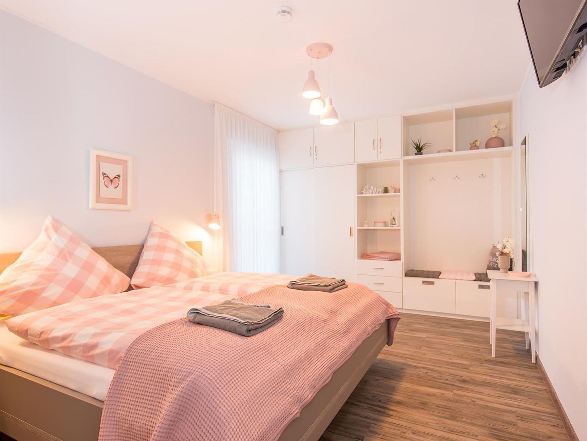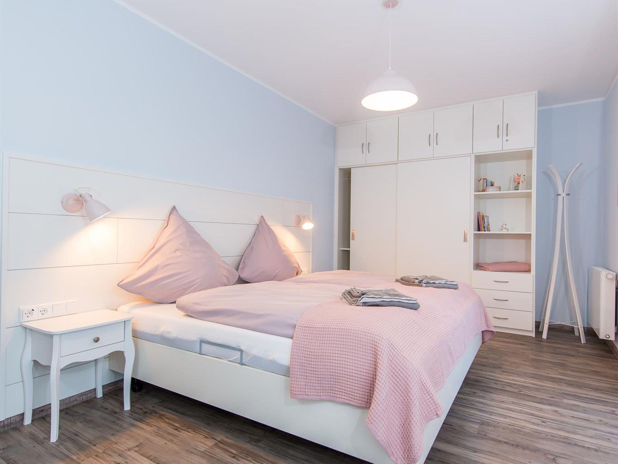 Die 3 Schlafzimmer verfügen über Doppel- und Einzelbetten. Auf Anfrage können die Schlafmöglichkeiten um ein Beistellbett ergänzt werden. Für kleine Gäste steht ein Kinderreisebett kostenfrei zur Verfügung. Jeder Schlafraum ist mit Flachbildschirm und einem geräumigen Einbauschrank versehen.