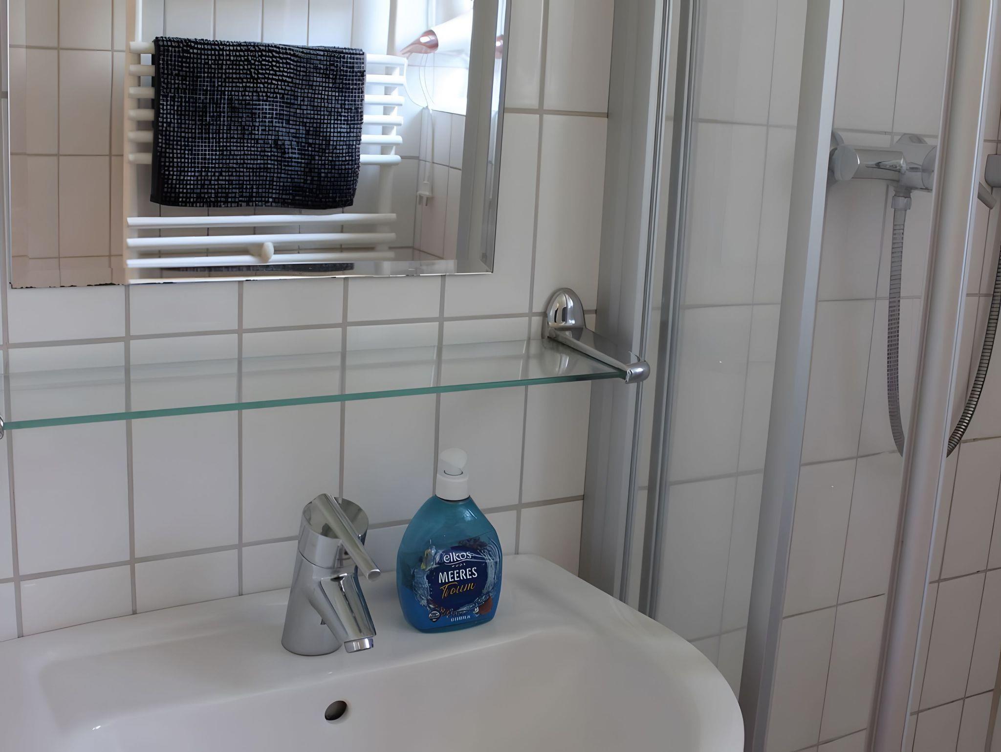 Das Bad verfügt über Waschbecken, WC, Dusche und einen Föhn.