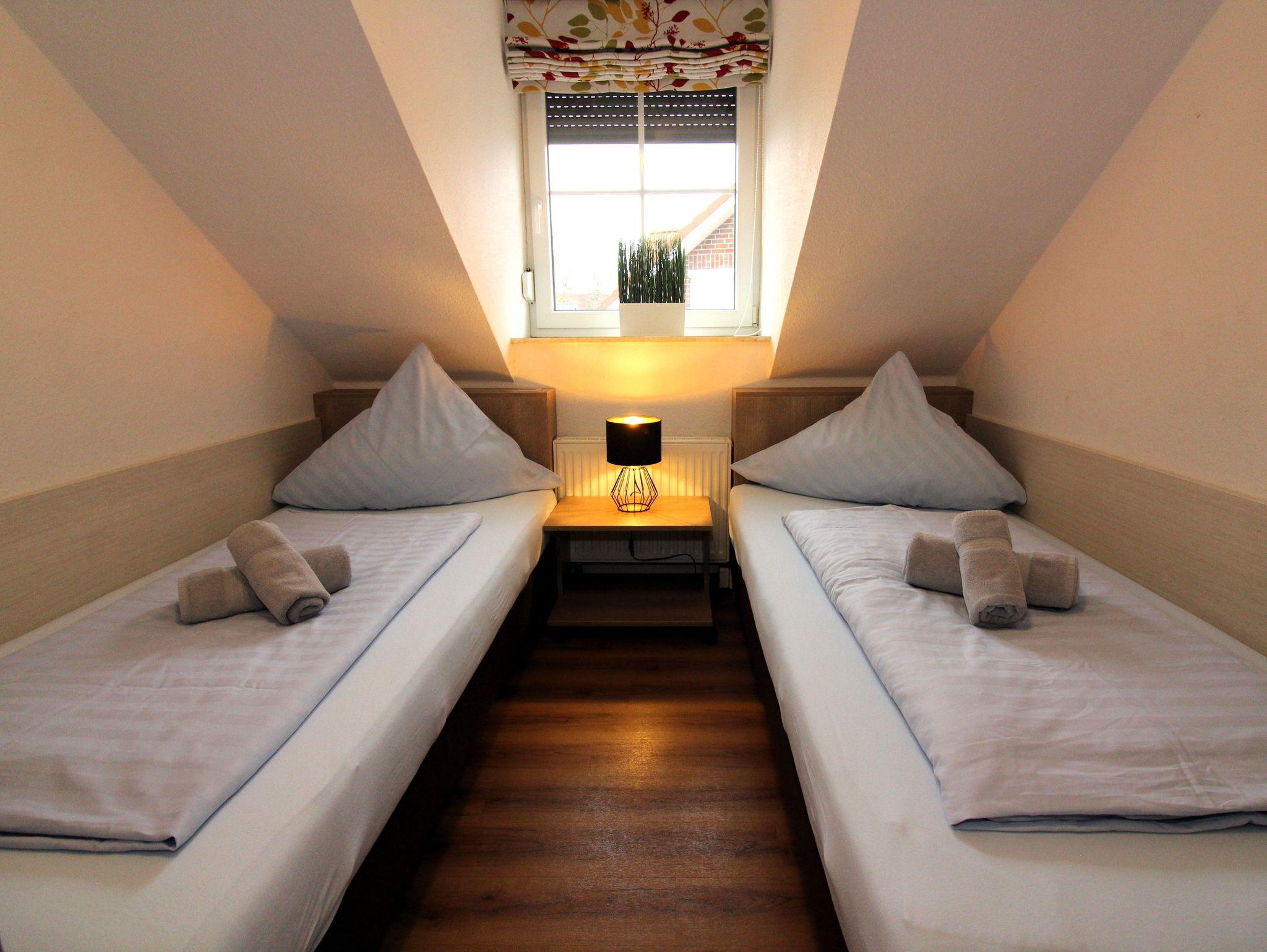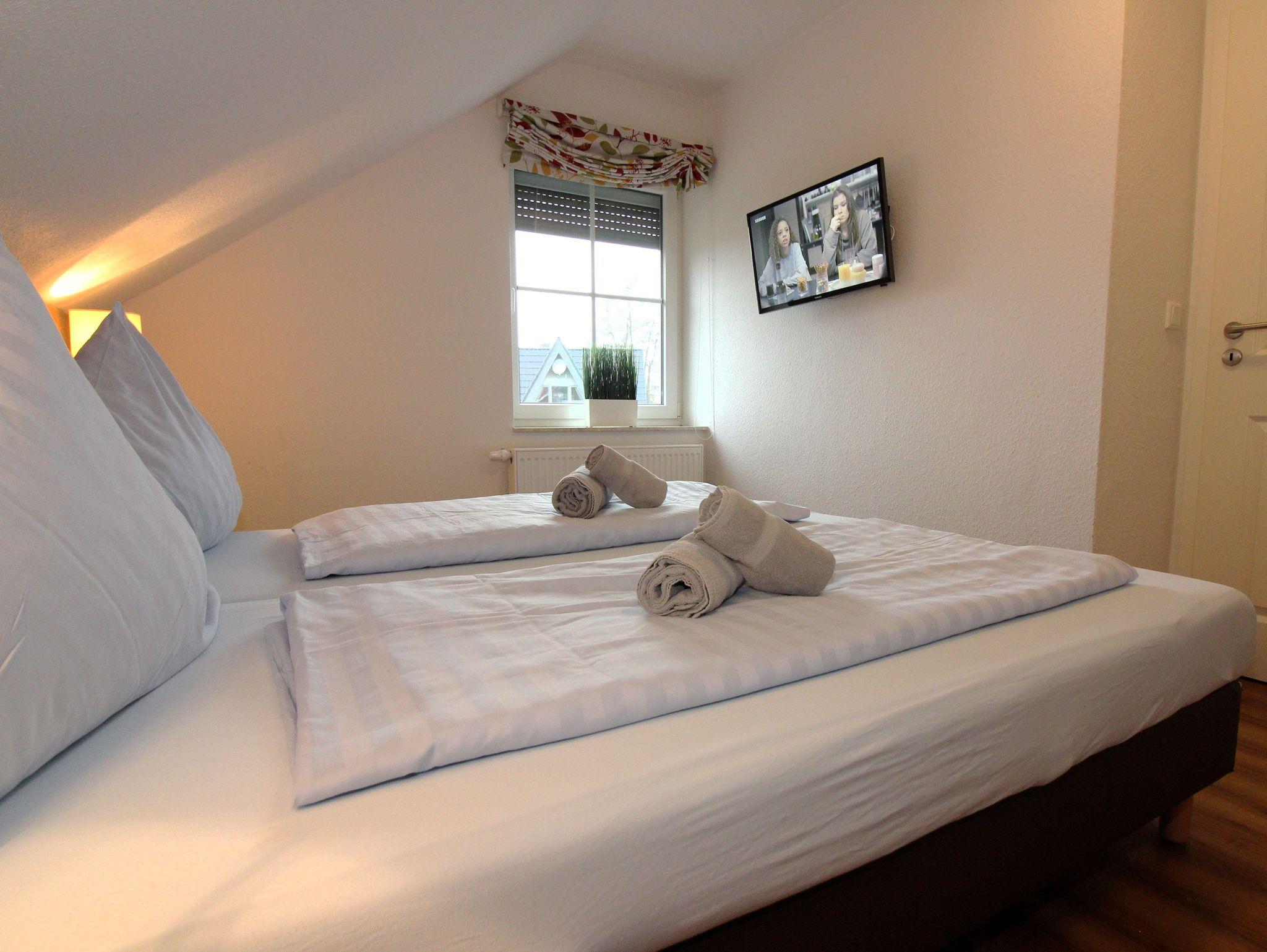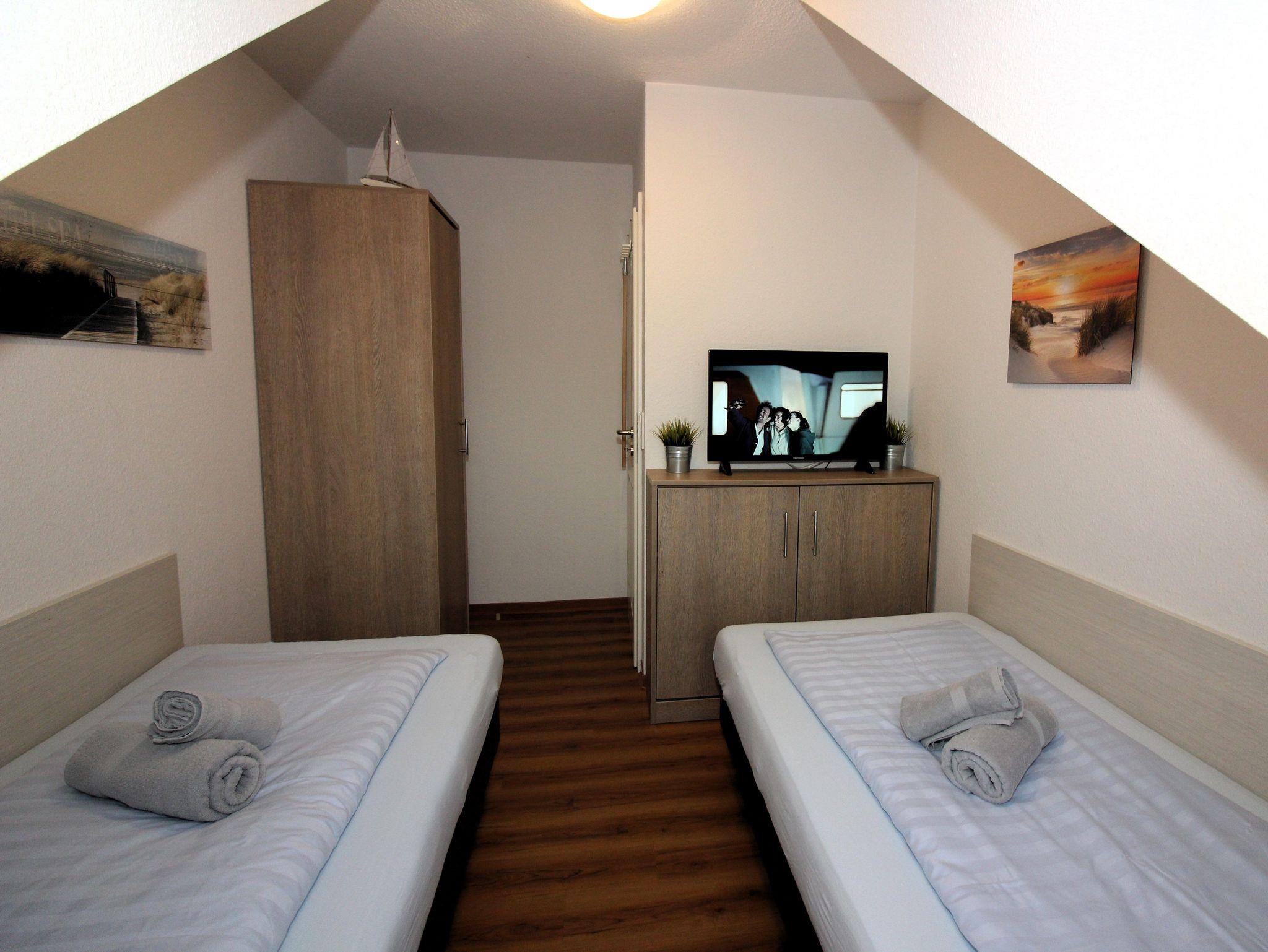 ein Schlafzimmer mit zwei getrennten Boxspring-Betten, 32“-LED-Fernseher, Radio-USB-CD-Player