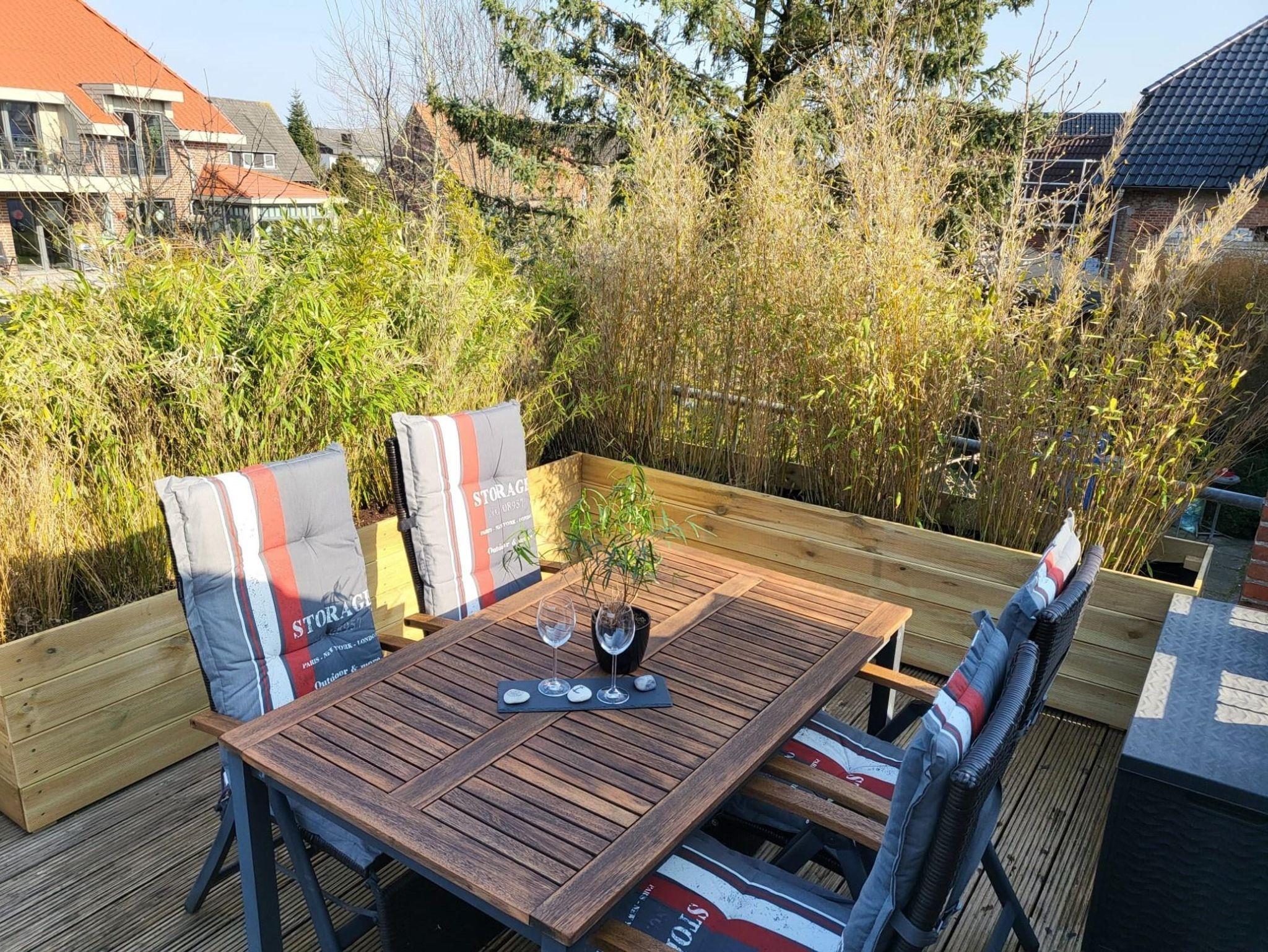 Die moderne und lichtdurchflutete Wohnung im Obergeschoss bietet auf rund 50qm Platz für bis zu 3 Gäste zzgl. Kinderbett für Kleinkinder. Aufgeteilt sind die Schlafbereiche in 2 separate Zimmer mit komfortablen Boxspringbetten für eine Einzelperson bzw. als Doppelbett. Eine gut ausgestattete Küche, ein modernes Bad und ein gemütliches Wohnzimmer runden das Angebot ab. Zusätzlich verfügt die Wohnung über eine großzügige Dachterrasse mit Gartenmöbeln und Grill.