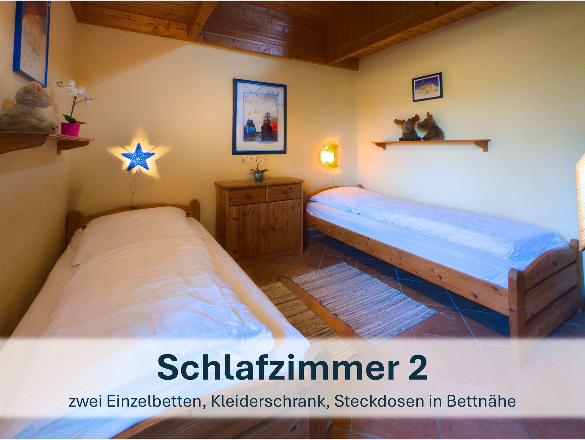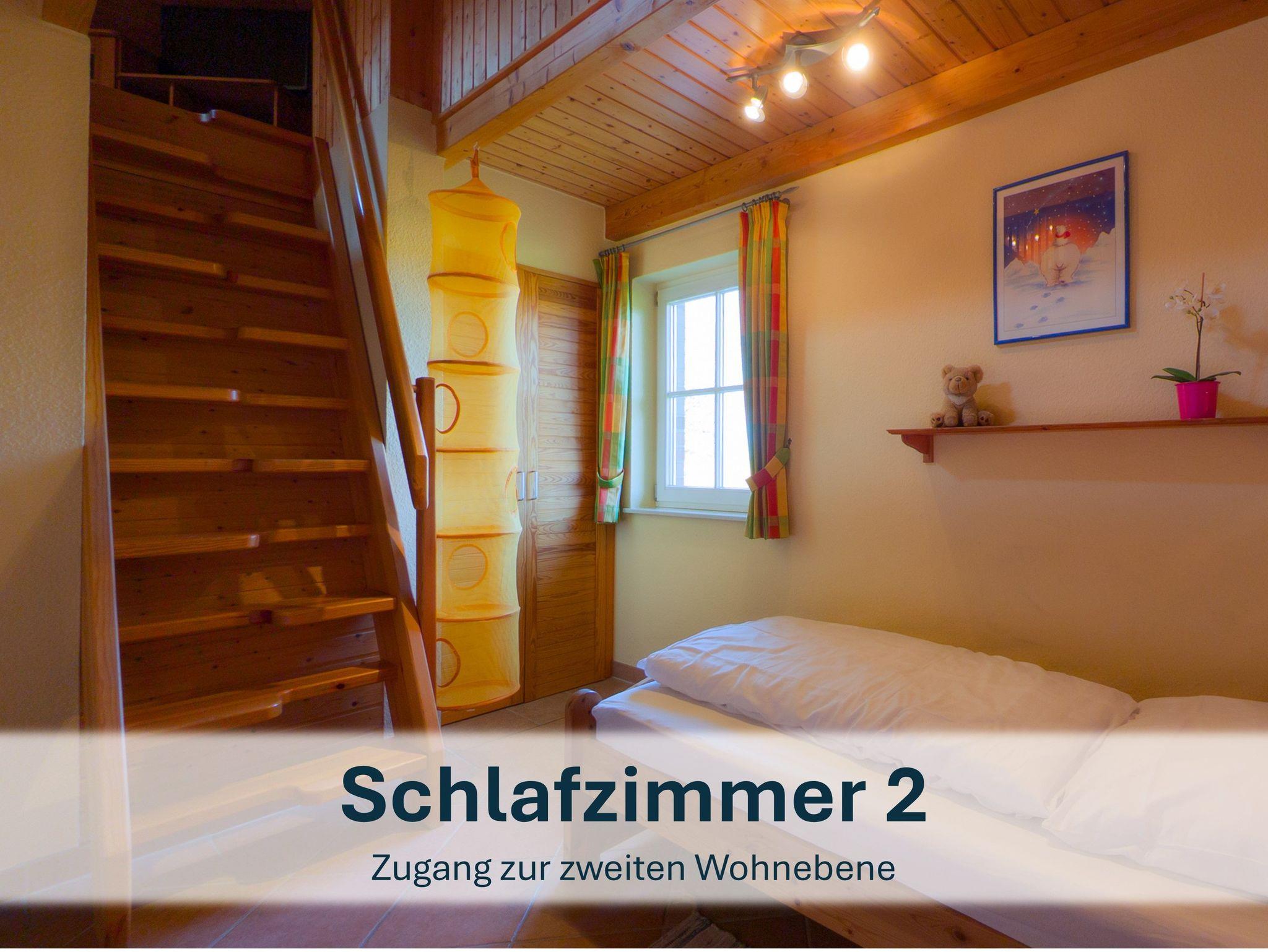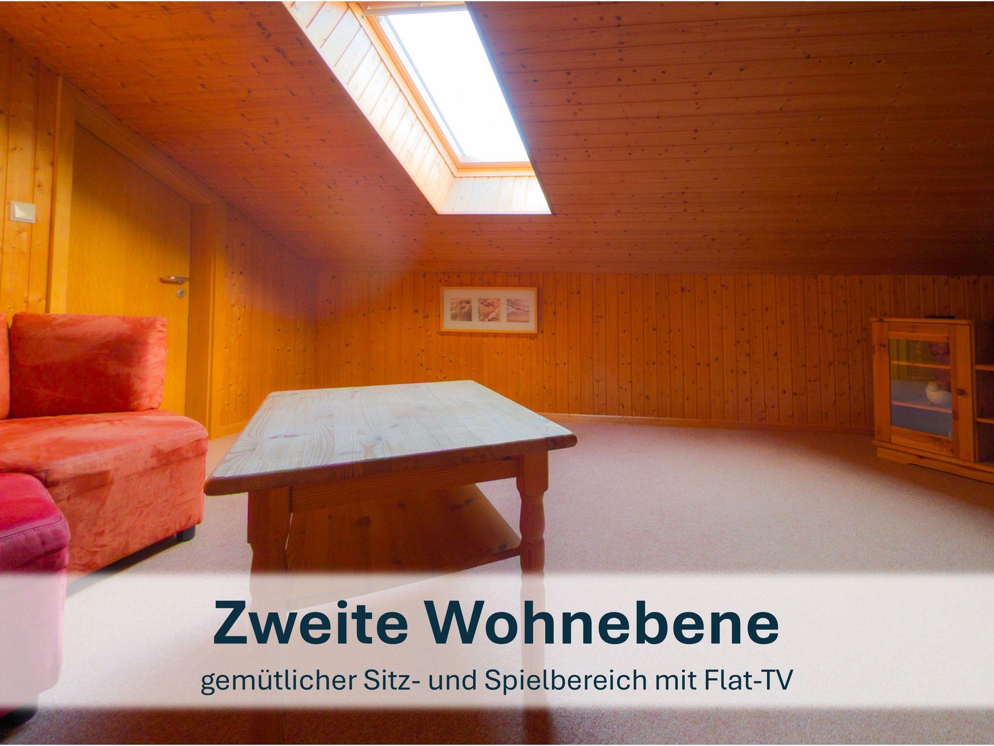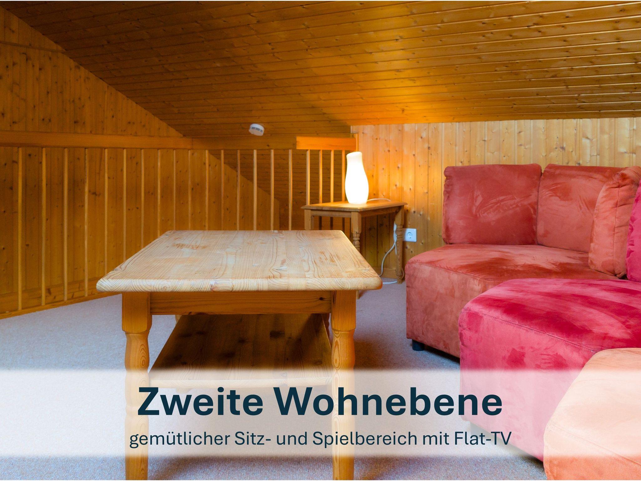Großzügig geschnittener Bungalow für max. 6 Personen (zzgl. einem Kleinkind). Gemütlicher Wohnraum mit Kaminofen, eine gut ausgestattete Küche mit Essbereich sowie 2 Bäder mit Dusche und WC und 3 Schlafräume (einmal mit Doppelbett, zweimal mit zwei Einzelbetten). Von einem der drei Schlafzimmer führt eine Holztreppe zur 2. Wohnebene auf eine Empore mit einem zweiten Fernseher - ein eigenes kleines Reich für kleine und große Kinder!