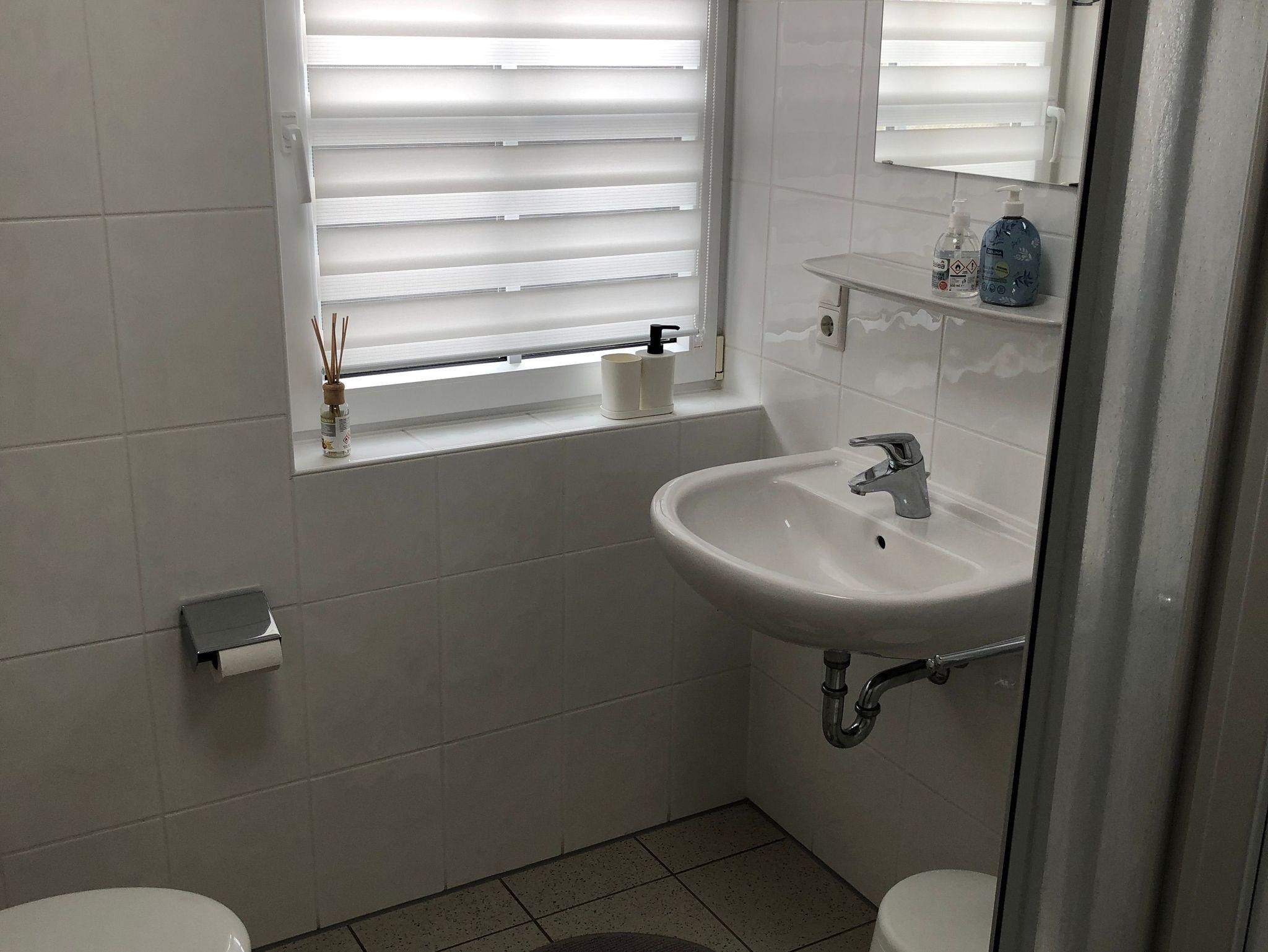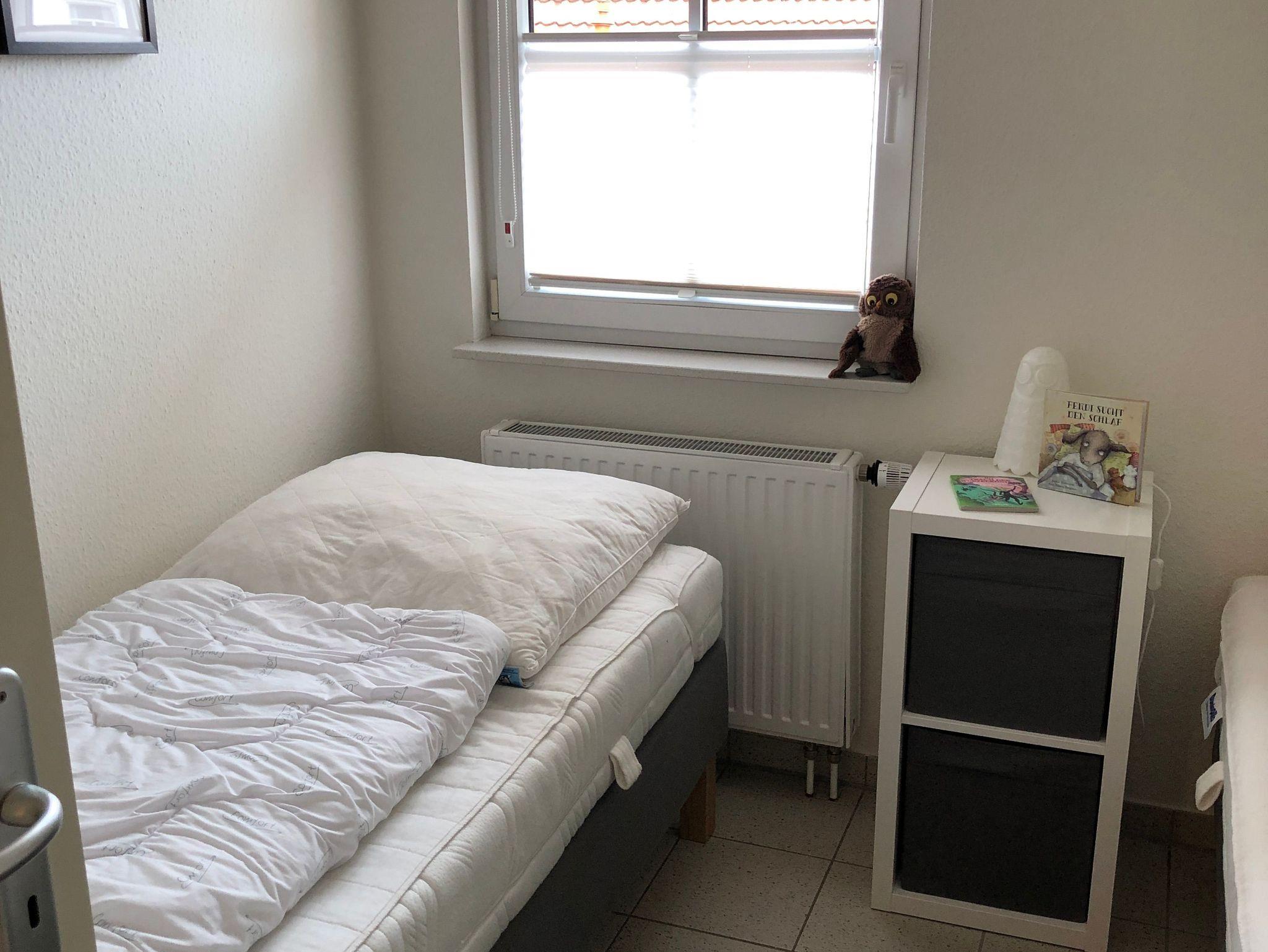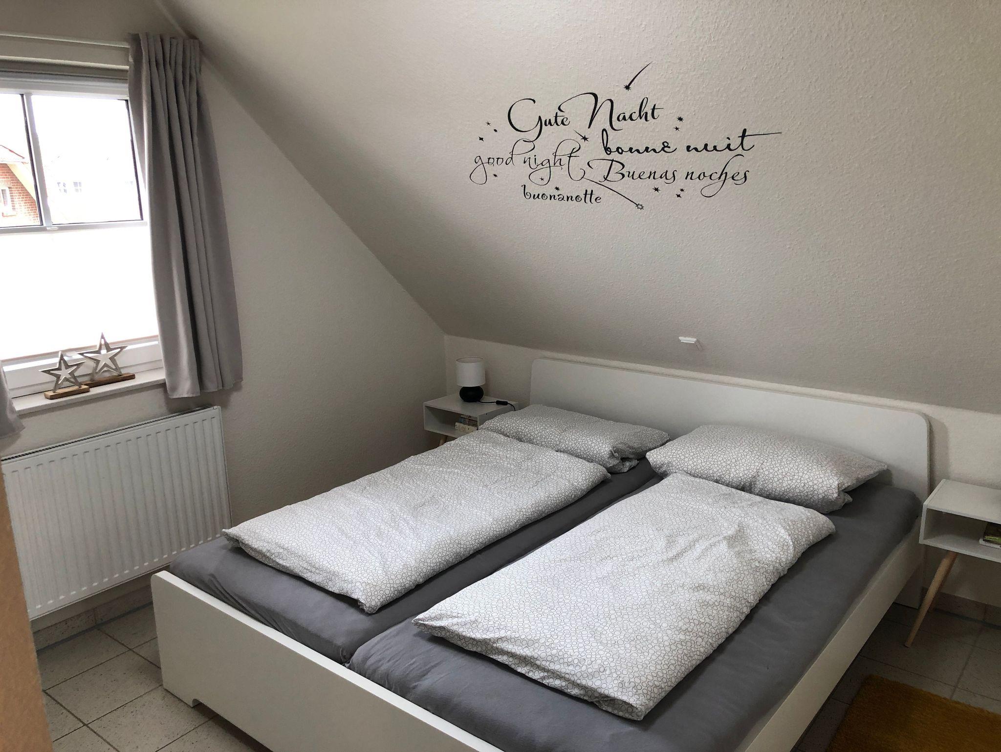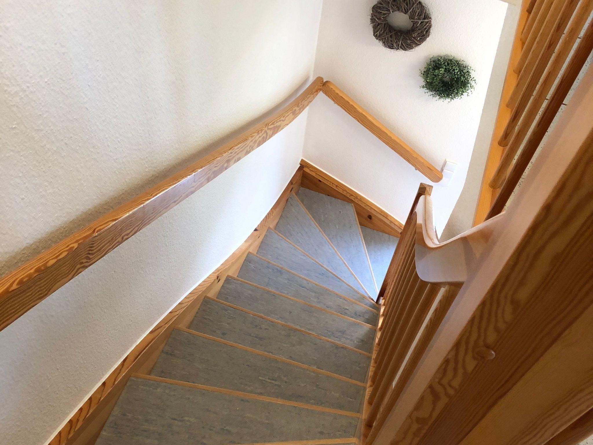 Das Obergeschoss der Doppelhaushälfte erreichen Sie über eine Holztreppe. Hier befindet sich ein Schlafzimmer mit Doppelbett und ein weiteres Schlafzimmer mit einem oder zwei Einzelbetten. Ein zweites Badezimmer mit Dusche und WC finden sie ebenfalls hier.