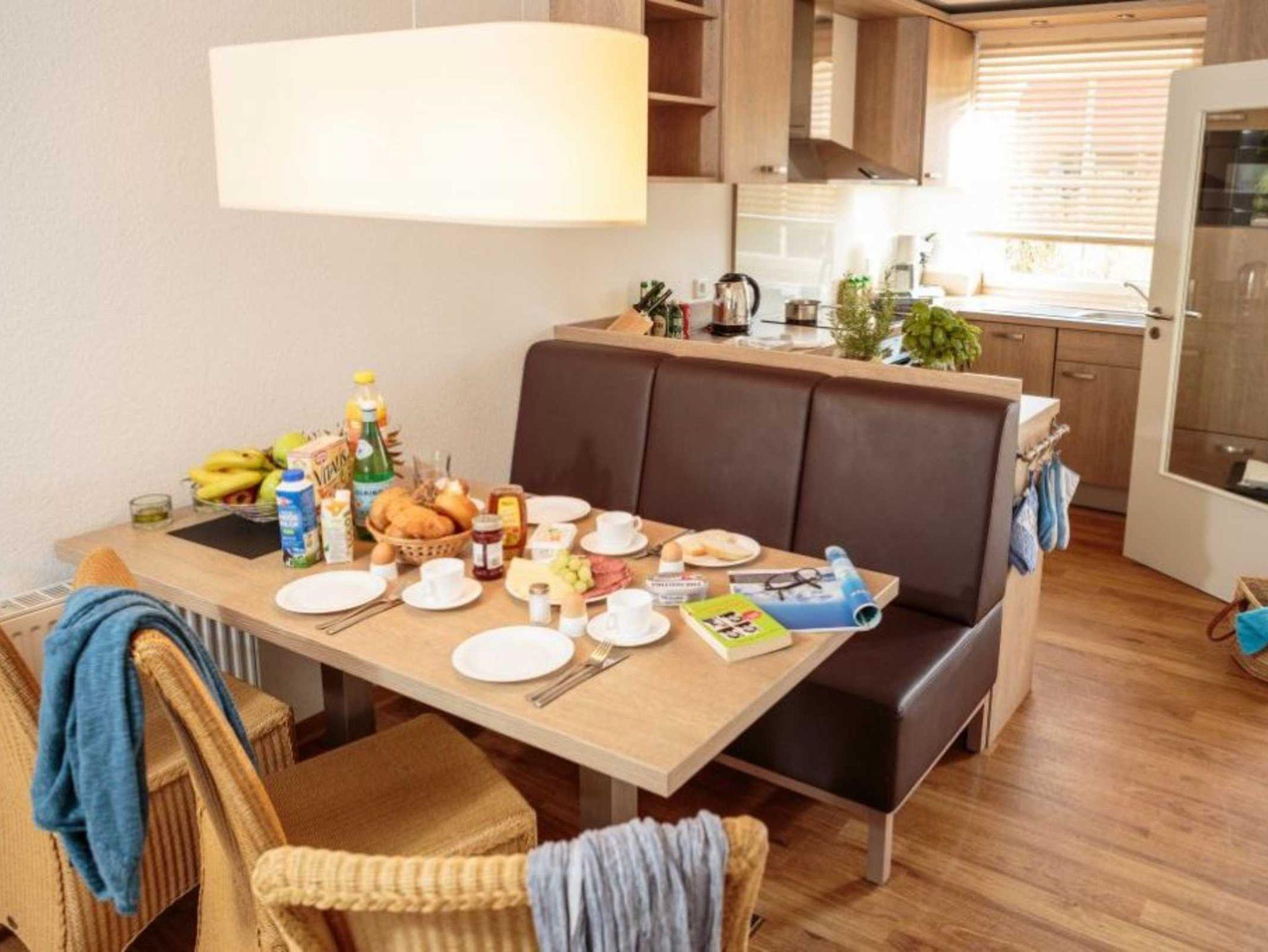 • Offene Küche, vollausgestattet mit Spülmaschine, Kühlschrank, Herd, Mikrowelle, Toaster, Kaffeemaschine, Senseo, Eier- und Wasserkocher, Handrührgerät, Waffeleisen und Sterilisator, Mülltrennsystem, Geschirr und Besteck