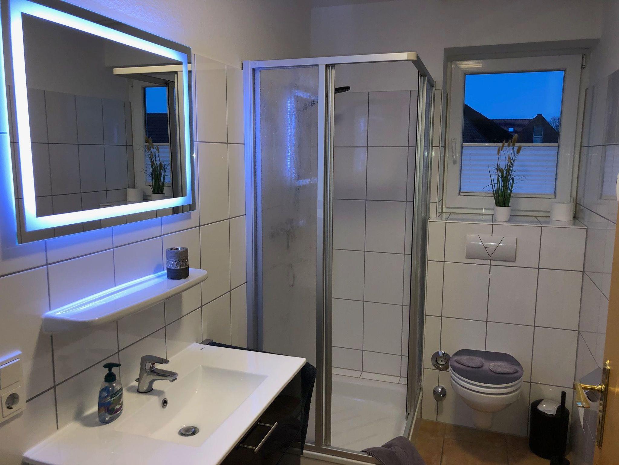 Badezimmer: Fenster, moderner Waschtisch, Dusche, WC, Handtuchheizkörper, Schrank, Föhn.