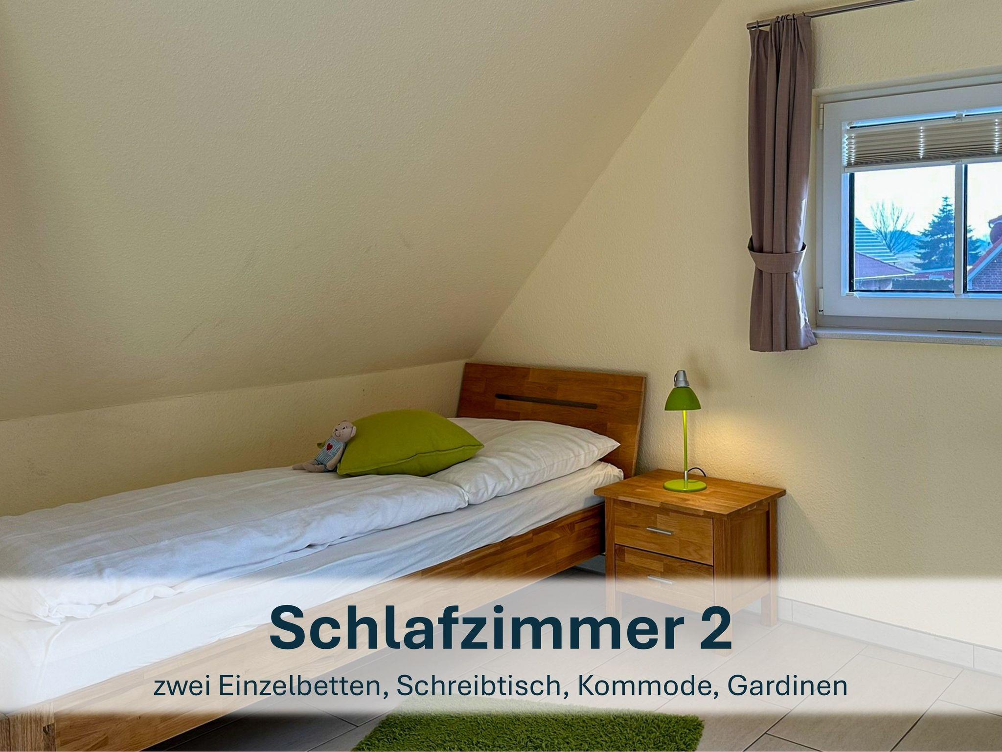 Über die Holztreppe im Flur gelnagen Sie in das Obergeschoss des Hauses.Hier befinden sich zwei weitere Schlafzimmer: ein Kinderzimmer mit zwei Einzelbetten und einem kleinen Schreibtisch, sowie ein Schlafzimmer mit Doppelbett und einer Kommode.
