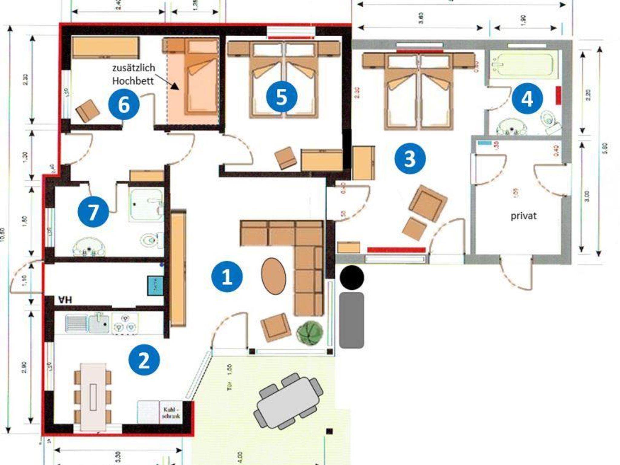 - Ausgestattet mit Couch, Tisch und Wohnwand sowie TV, SAT, CD/DVD-Player, Digitalradio
