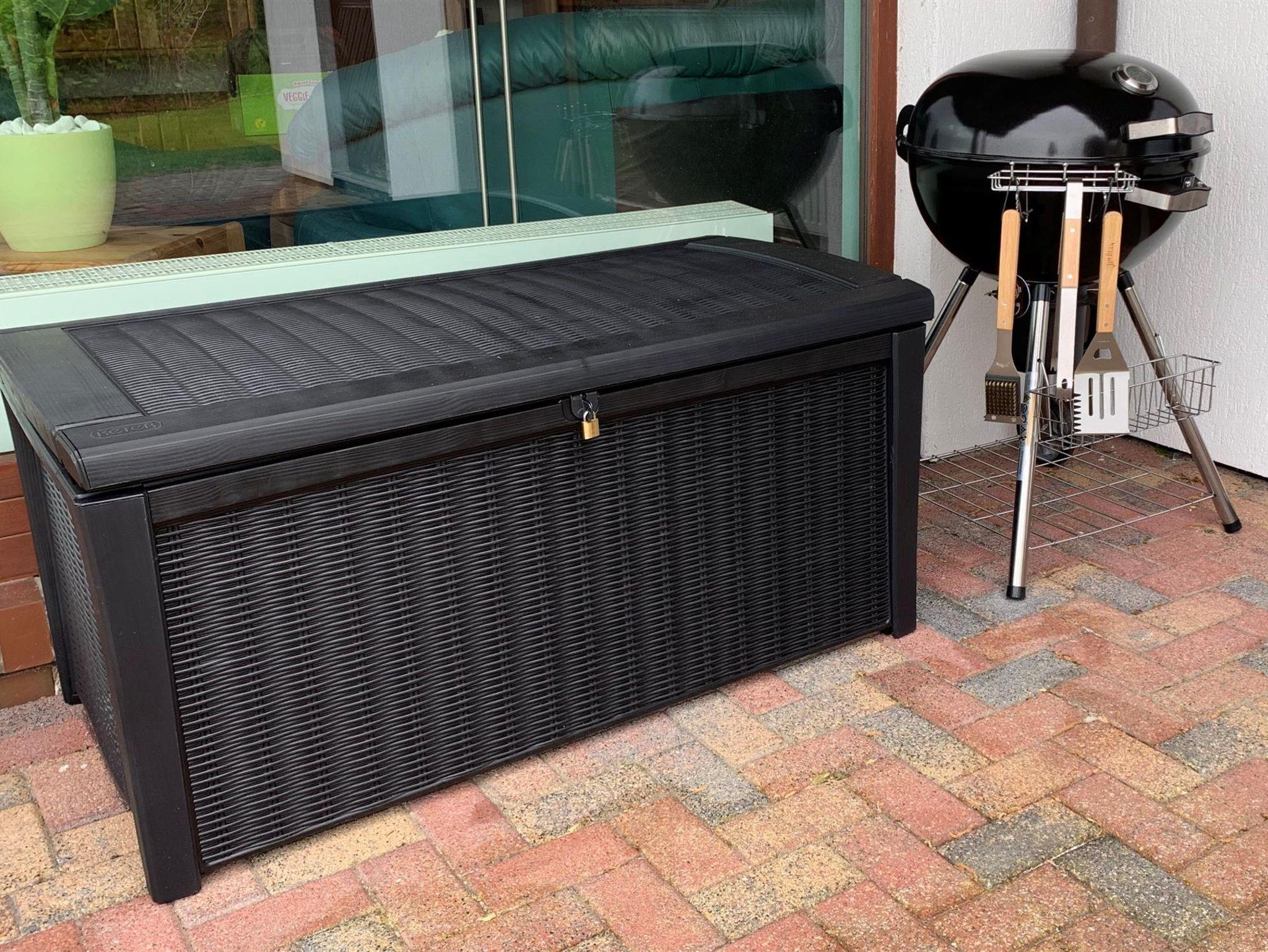 - überdachte Sonnenterrasse mit Gartenmöbeln und Grill