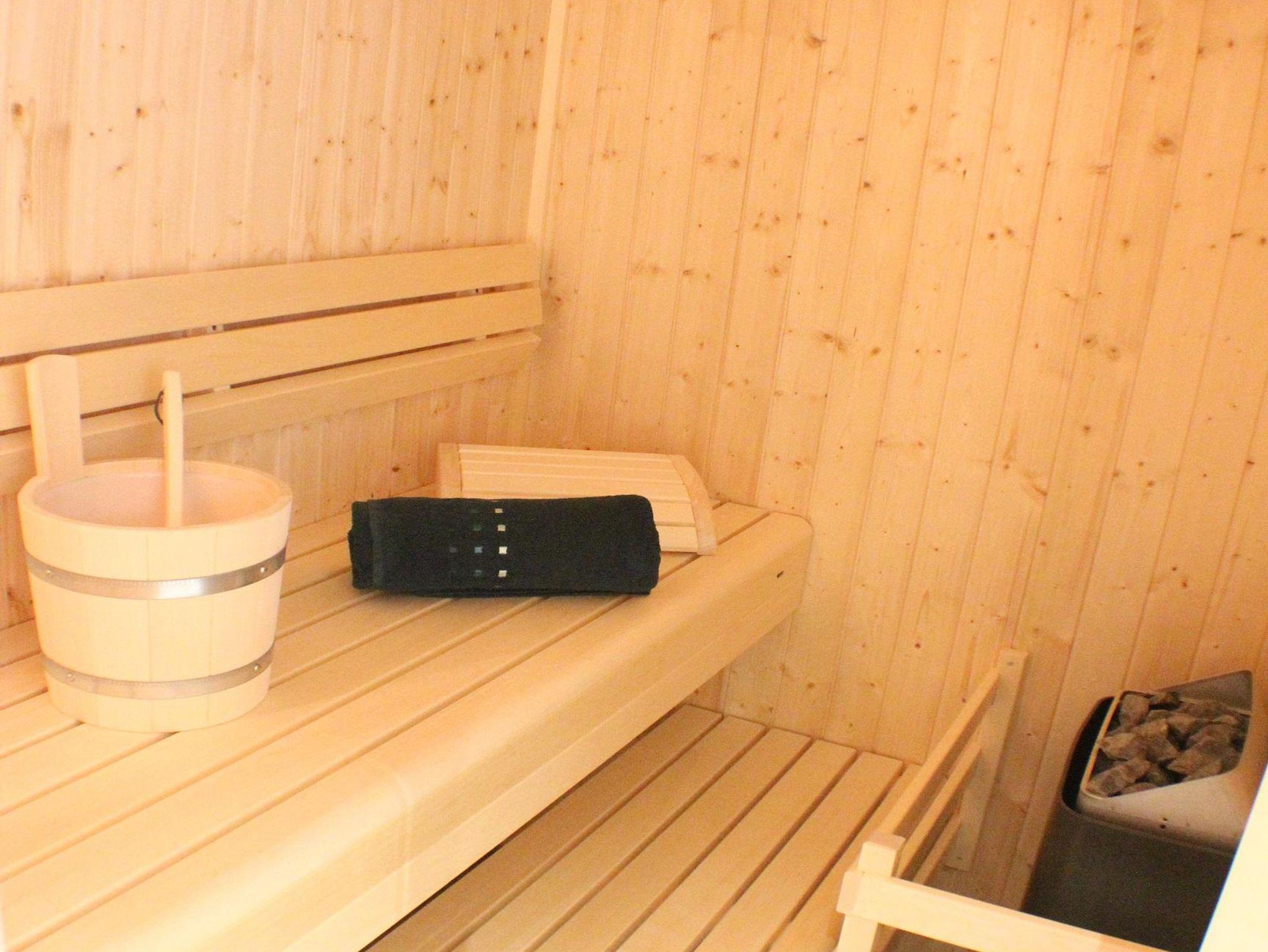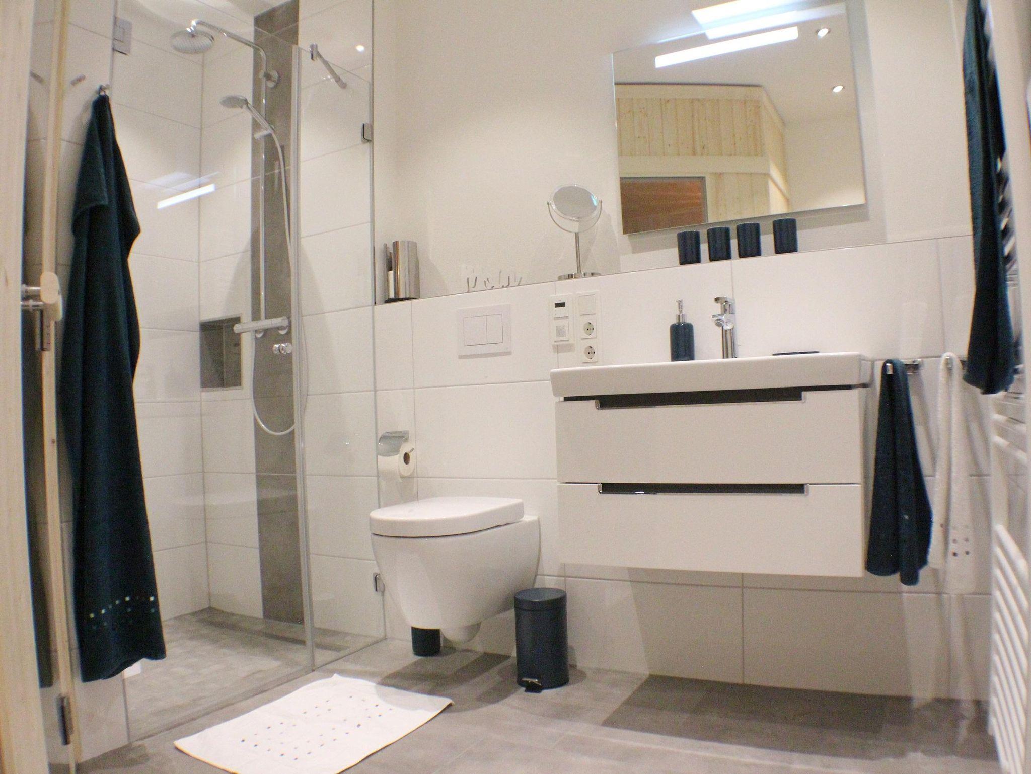 Badezimmer: Radio, Sauna, Föhn, WC, Waschbecken, Kosmetikspiegel, Fußbodenheizung, Spiegel, Steckdosensicherung, Dusche (bodengleich)
