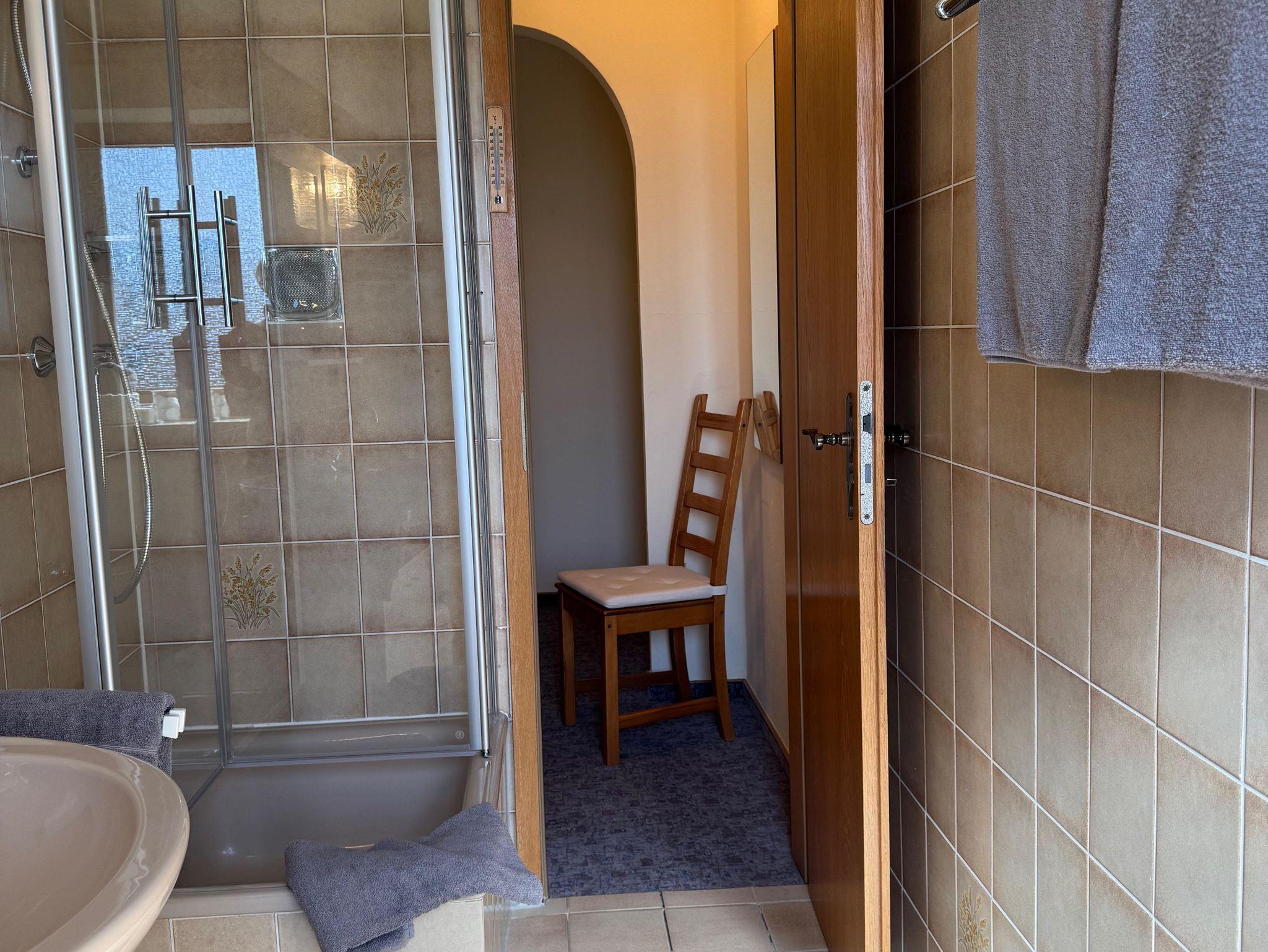 • Bad mit Dusche, WC, Waschbecken. Das Bad verfügt über ein Fenster