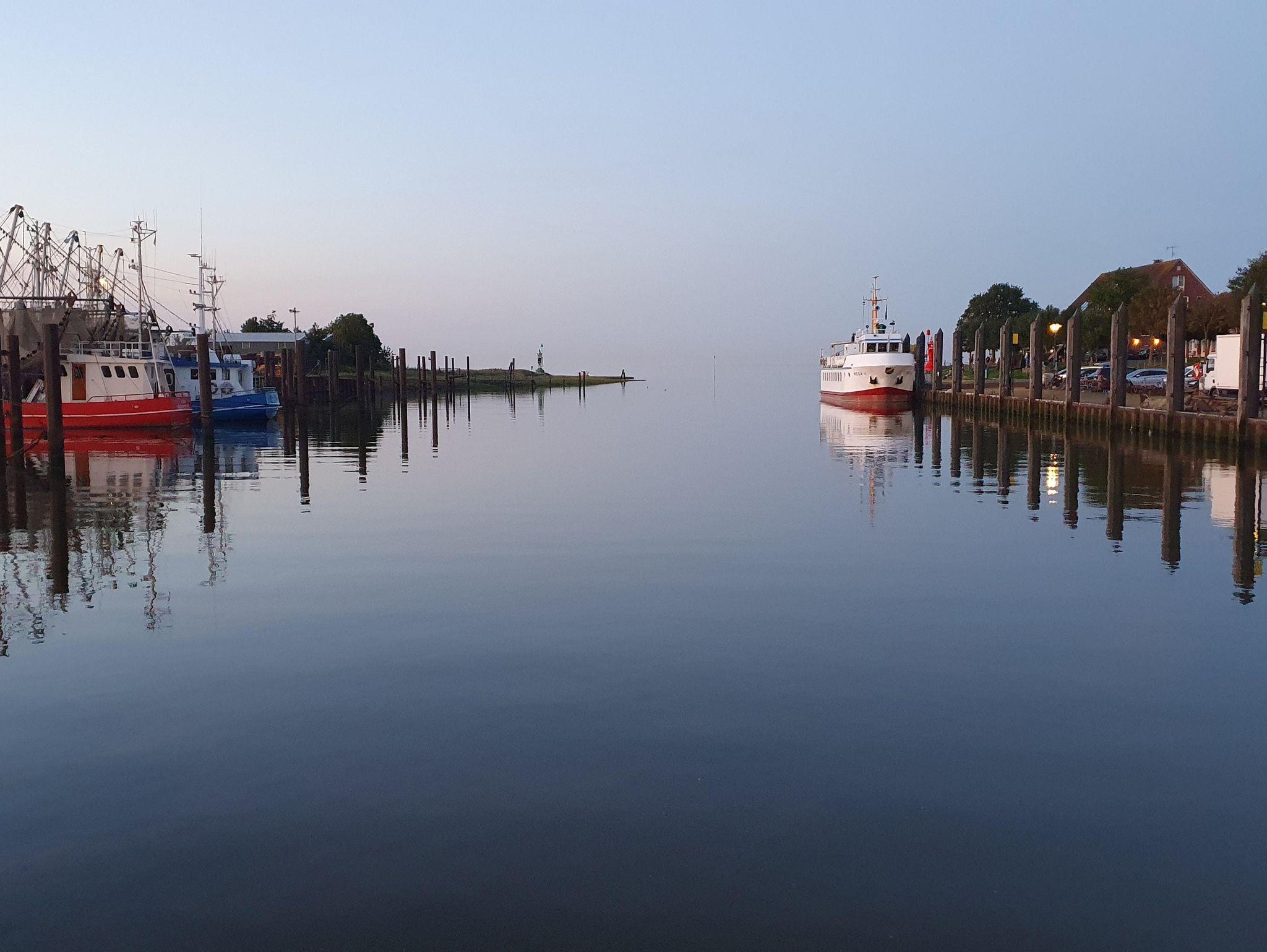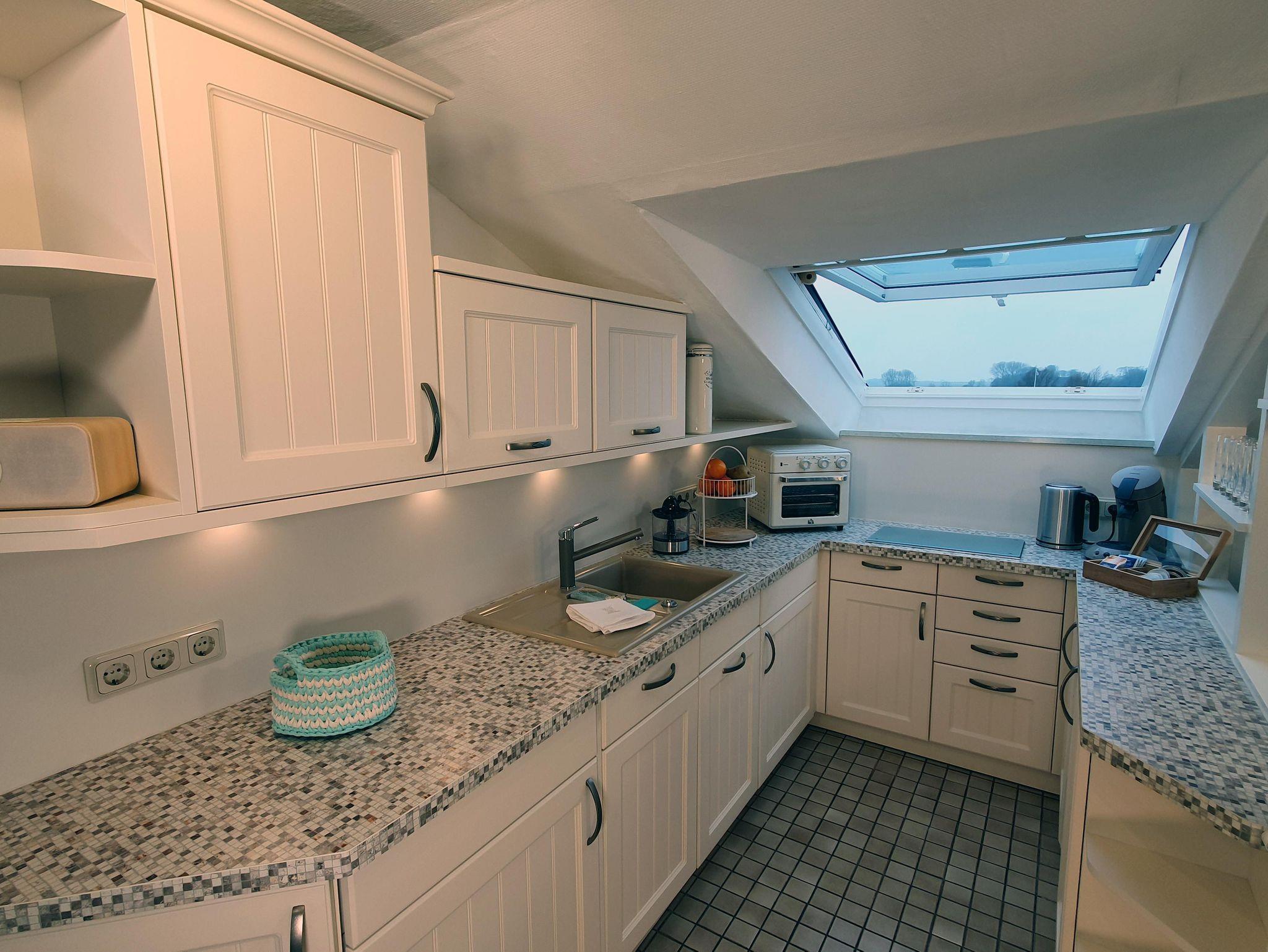 Beim Betreten der Wohnung im Dachgeschoss in der zweiten Etage gelangen Sie in einen kleinen Flur mit Garderobe, Spiegeln und Schränken mit reichlich Stauraum. Zur linken Seite befindet sich das Badezimmer mit WC, Eckdusche und Badewanne. Ihr Bad können Sie unter einem künstlichen Sternenhimmel genießen. Der echte Sternenhimmel ist durch das Dachfenster zu beobachten. Wenn Sie vom Flur weiter geradeaus gehen, gelangen Sie in den Wohnraum mit abgetrennter Küche. In der sehr gut ausgestatteten Küche befinden sich als Sonderausstattung ein Geschirrspüler, eine Waschmaschine/Wäschetrockner, ein kleiner Backofen und ein Induktionskochfeld. Damit stehen Ihrem genussvollen Essen keine Hindernisse im Weg. Ihren duftenden Kaffee können Sie in einer Senseo, Filterkaffeemaschine oder Frenchpress zubereiten, eine kleine Auswahl an Teesorten steht ebenfalls für Sie bereit. Im Wohnraum erwartet Sie eine hohe Esstheke mit Barhockern für ein wohlschmeckendes Essen mit einem traumhaften Blick auf den Hafen, die Marsch, den Nationalpark und die Nordsee. Von langen Wanderungen an der Küste können Sie sich auch auf dem Sofa erholen. Ein Smart-TV erlaubt Ihnen die Nutzung von kostenfreien Streamingdiensten. Eine Sennheiser Ambeo Soundbar plus sorgt für den richtigen Sound. Mobiles Arbeiten ermöglicht ein kleiner Tisch mit zwei Stühlen. Hier steht auch ein ausklappbares komfortables Schlafsofa für 2 Personen. Hinter dem Wohnzimmer schließt sich das Schlafzimmer an, in dem ein weiterer Tisch mit Stuhl, ein Kleiderschrank und zusätzlicher Stauraum genutzt werden können. Das Doppelbett hat eine komfortable Breite von 180cm, Bettdecken und Kopfkissen sind Allergiker freundlich. Im Schlafzimmer ist ein Dachfenster, von dem aus Sie ebenfalls auf die Nordsee gucken können. Alle Dachfenster sind verdunkelbar und sind, bis auf das Bad mit Insektengittern versehen. Ebenfalls Am Hafen, nur ein paar Meter entfernt, können Sie gepflegt im Restaurant Dat Havenhuus oder dem Restaurant Nordseeblick speisen.