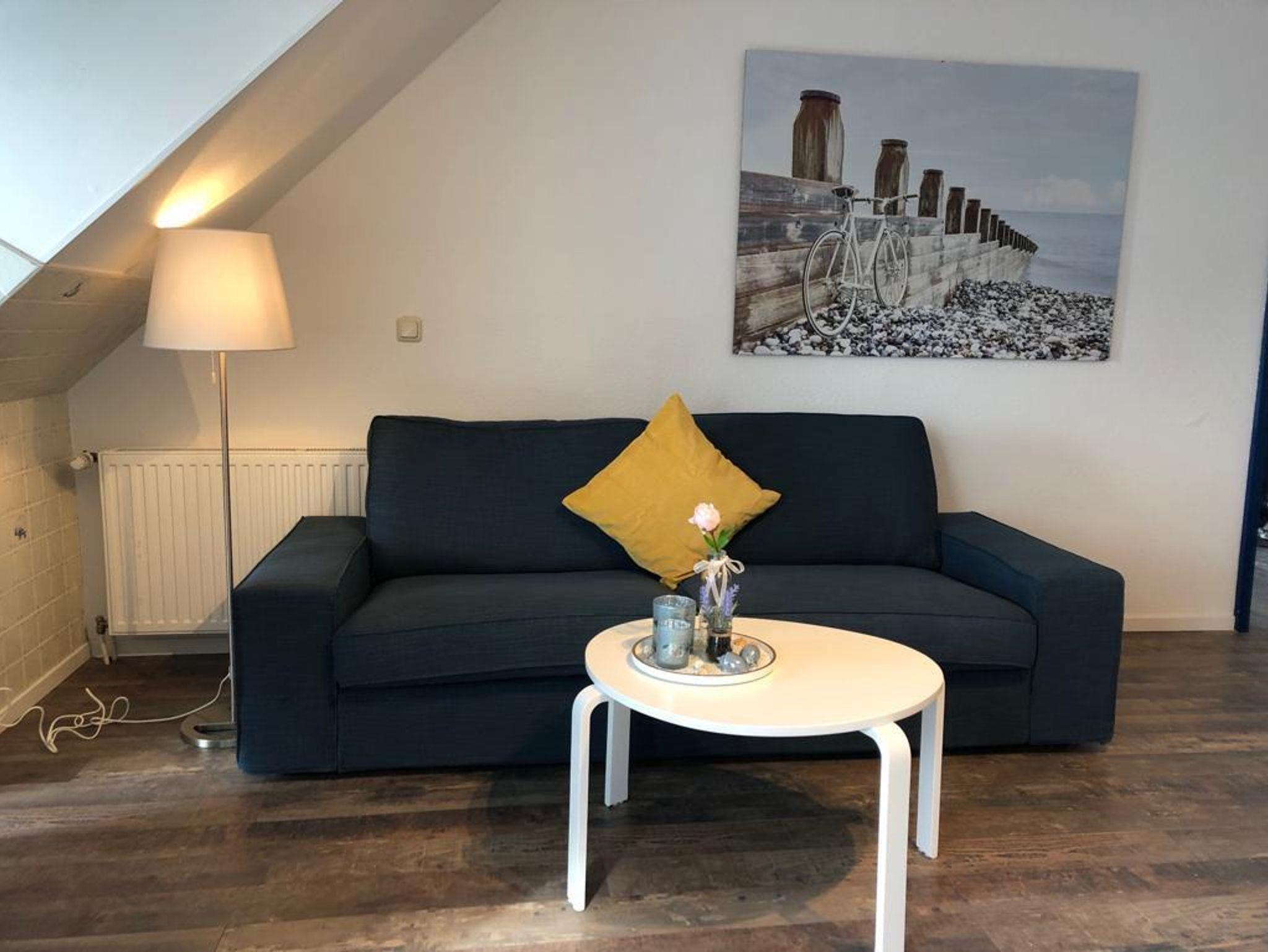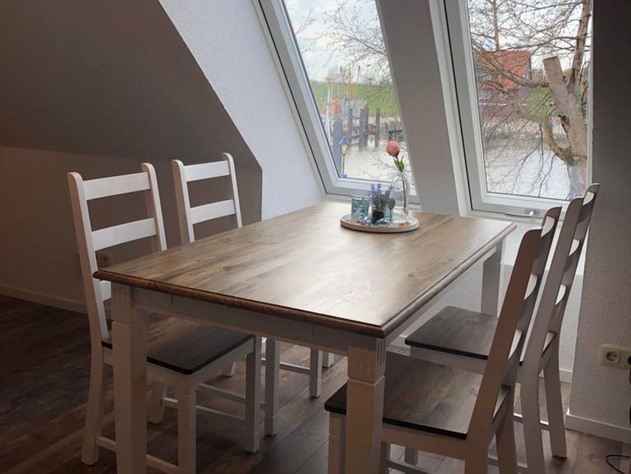 Im Wohnzimmer können Sie gemütlich im Sessel sitzen und durch die großen Fenster in der Dachgaube die Schiffe im Hafen von Fedderwardersiel beobachten. Bei guter Sicht sehen Sie vielleicht sogar von Weitem die Containerschiffe auf der Nordsee.