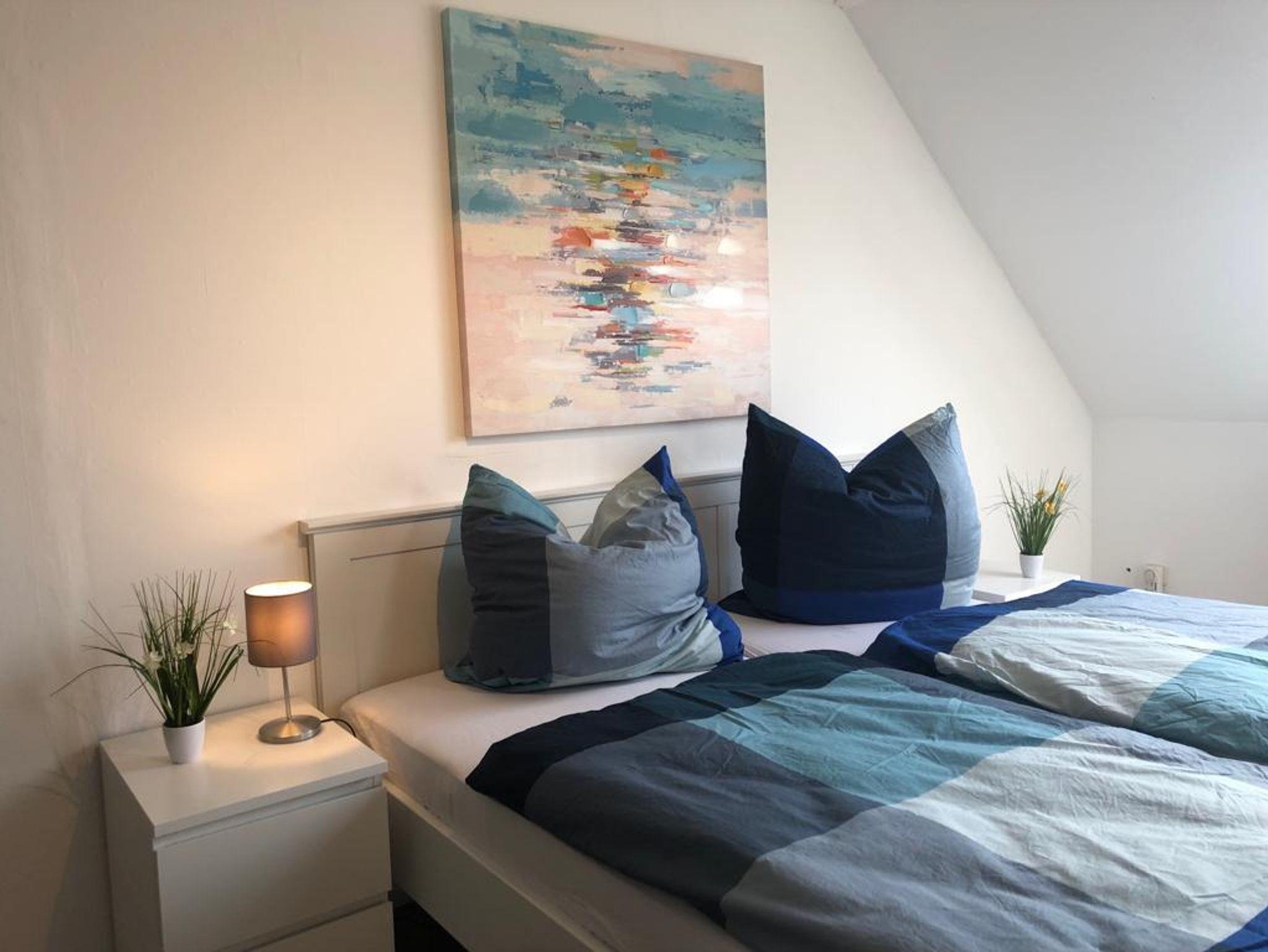 Die Ferienwohnung im Obergeschoss (ca. 68qm, 2-4 Personen) besteht aus einem Wohnzimmer mit Kochecke und zwei Schlafmöglichkeiten, Bad mit Dusche, im Dachgeschoß Doppelbett. Das Dachgeschoß hat eine Stehhöhe von 1,60m.