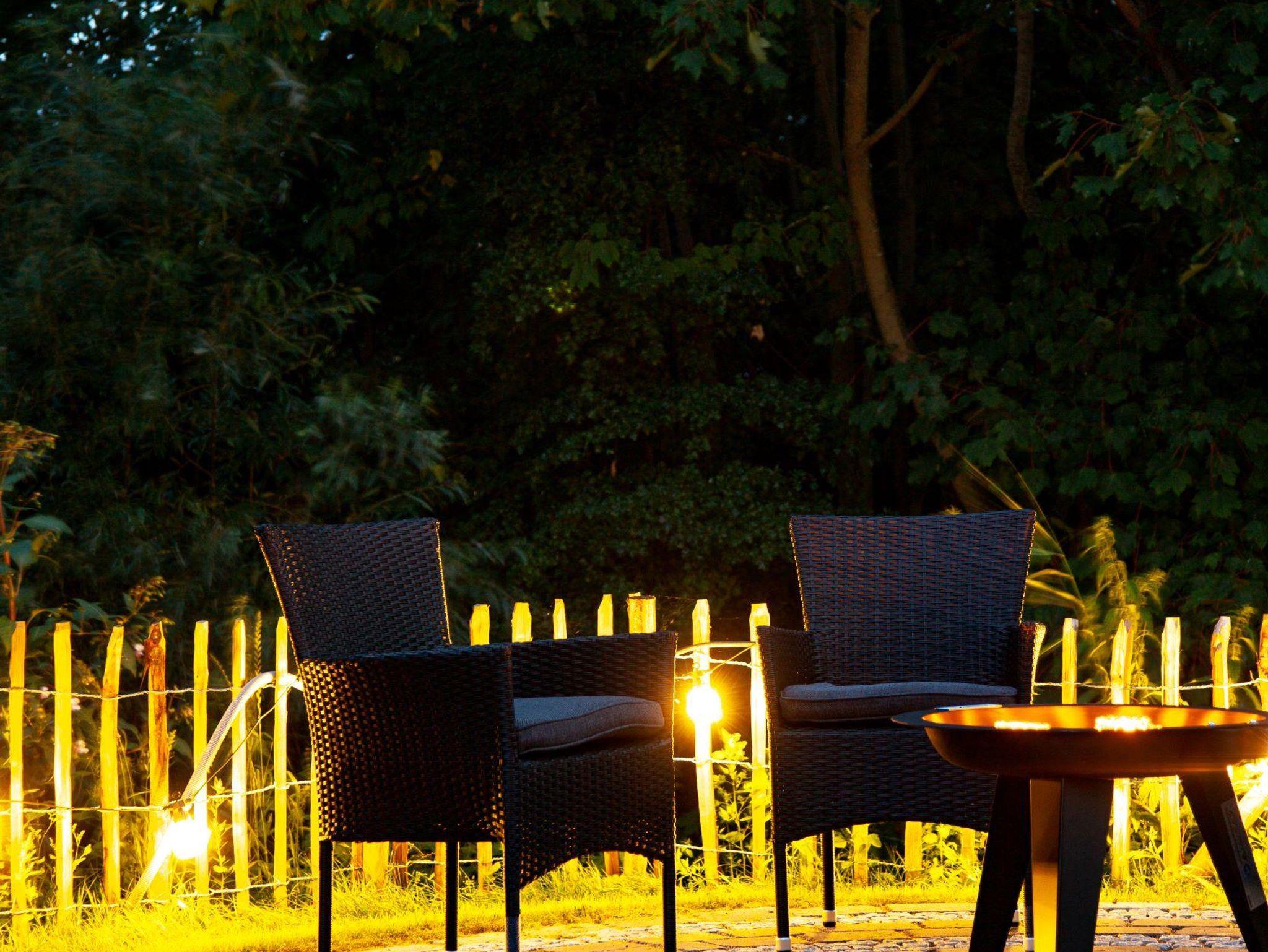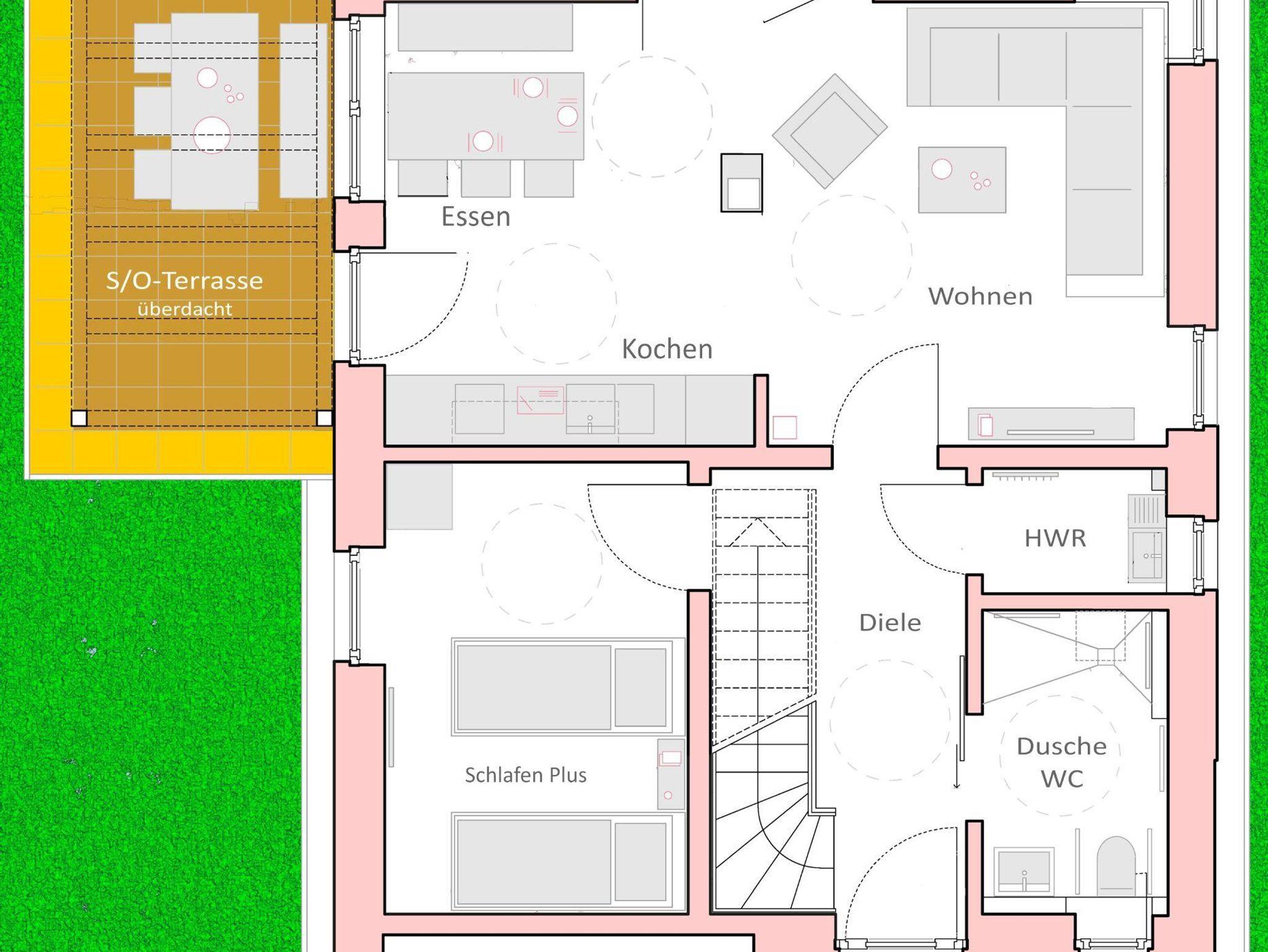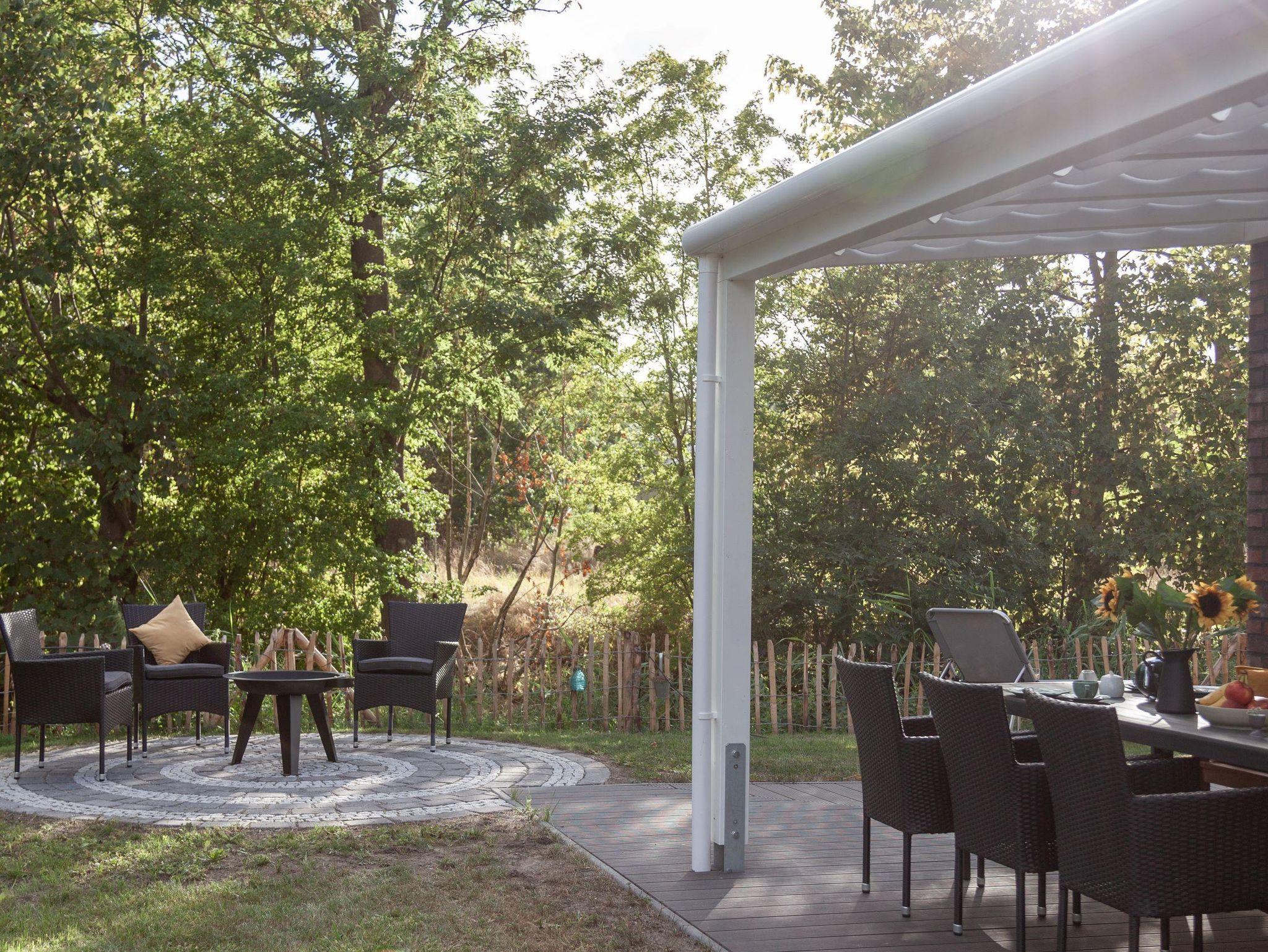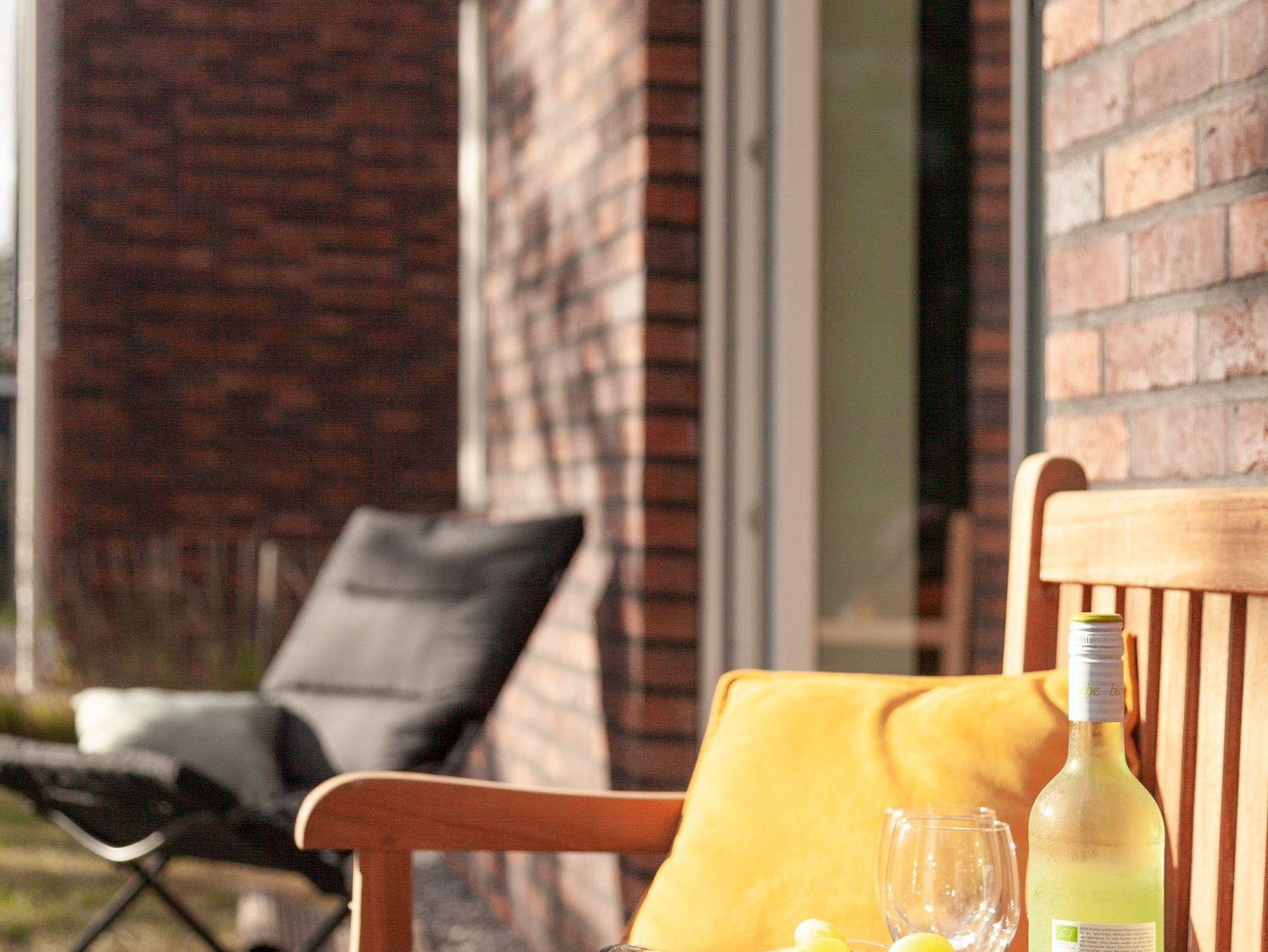 Terrasse/Garten Die gefühlte Alleinlage des Ferienhauses am südl. Rand des Hafendorfes begünstigt die besondere Ruhe und Entspannung im Außenbereich. Ausstattung: Süd/Ost-Terrasse direkt von Esszimmer/Küche erreichbar, mit WPC-Dielen belegt, Pergola mit Allwetterschutz (Glasdach und Beschattung), Sitzgruppe mit Sitzbank. Süd/West-Terrasse über Doppelflügeltür aus dem Wohnbereich erreichbar. Rasenflächen und Liegestühle, Sonnenkreisel als Schnack- und Grillplatz. Die Rasenflächen werden mit einem Naturzaun (Staketenzaun) vom dahinter liegenden Naturbach abgegrenzt.