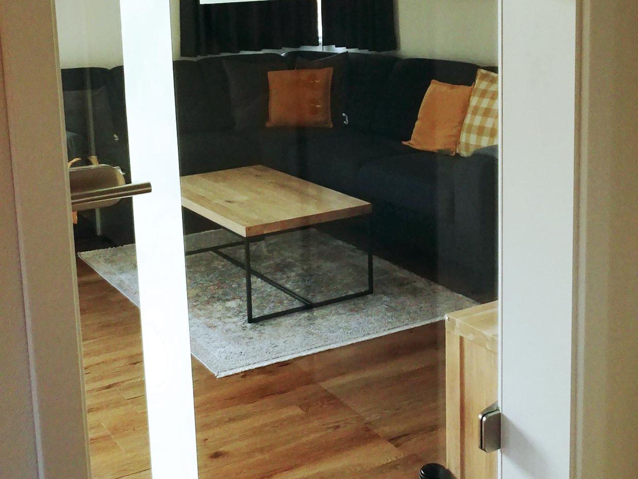 Untergeschoss Wohnbereich Das großzügige zur Galerie offene Wohnambiente mit Wohlfühlgarantie wird von Helligkeit und der bequemen, stilsicheren Einrichtung geprägt. Ausstattung: 5-sitziges Ecksofa, Sessel, PANASONIC 49 Zoll 4K LED Heimkino-TV, Lowboard mit PANASONIC Micro-Hifi-Anlage mit Bücher- und Spielesammlung, Säulen-Kaminofen (holzbefeuert), große Terrassentür (niedrigschwellig), Eckfenster, Galerie. Fenster und Terrassentüren mit Verdunklungsplissees und Vorhänge.