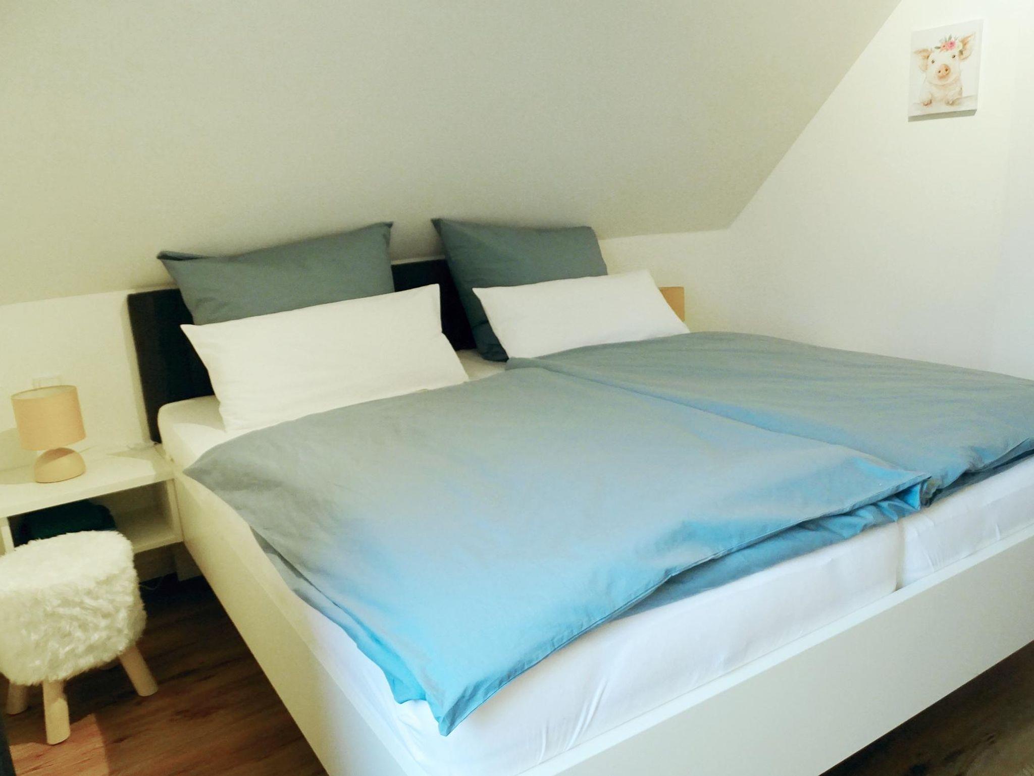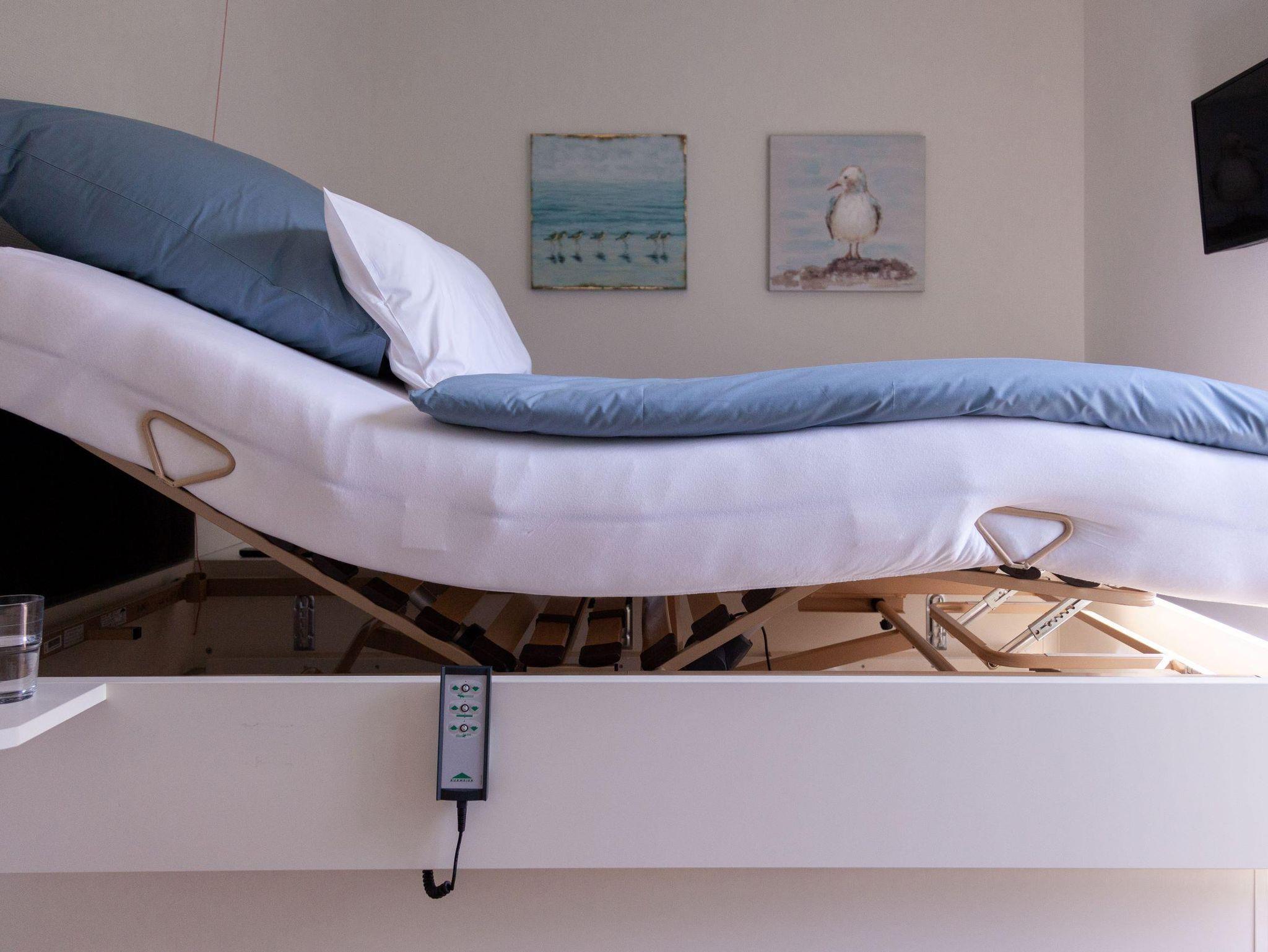 Schlafen Senior (oben) Entspannt Wegträumen nach einem schönen Urlaubstag an der Nordsee. Ausstattung: Doppelbett 90x200cm, Lattenrost mit verstellbarem Kopf- und Fußteil, Sony 32 Zoll LED Smart TV, Nachttische, Ablage, Hochschrank, Hocker, bodentiefes Fenster mit Verdunklungsplissee und Vorhänge, Kleiderhaken, Deckenstrahler, zwei Leselampen.